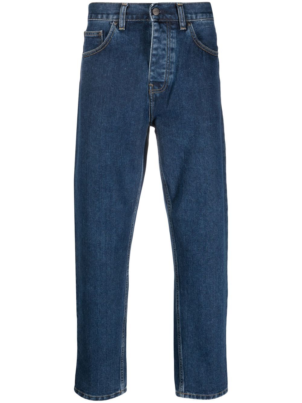 Jeans dritti di CARHARTT WIP lavaggio medio in cotone biologico con passanti per cintura e chiusura con bottoni e zip.