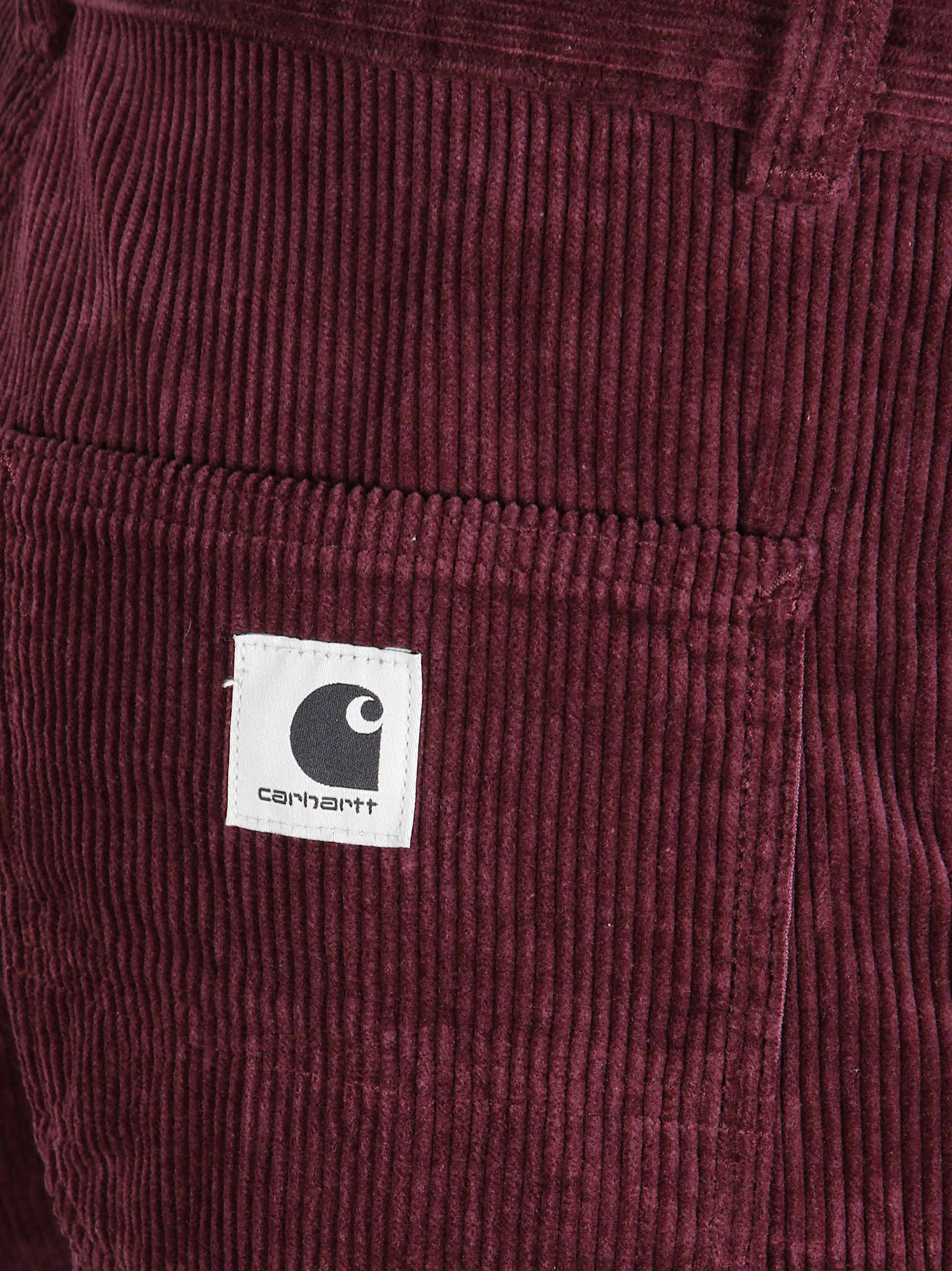 Pantalone Work di CARHARTT WIP rosso in vellutto a coste, caratterizzato da chiusura frontale con zip e bottone, tasche laterali a filetto e tasche posteriori.