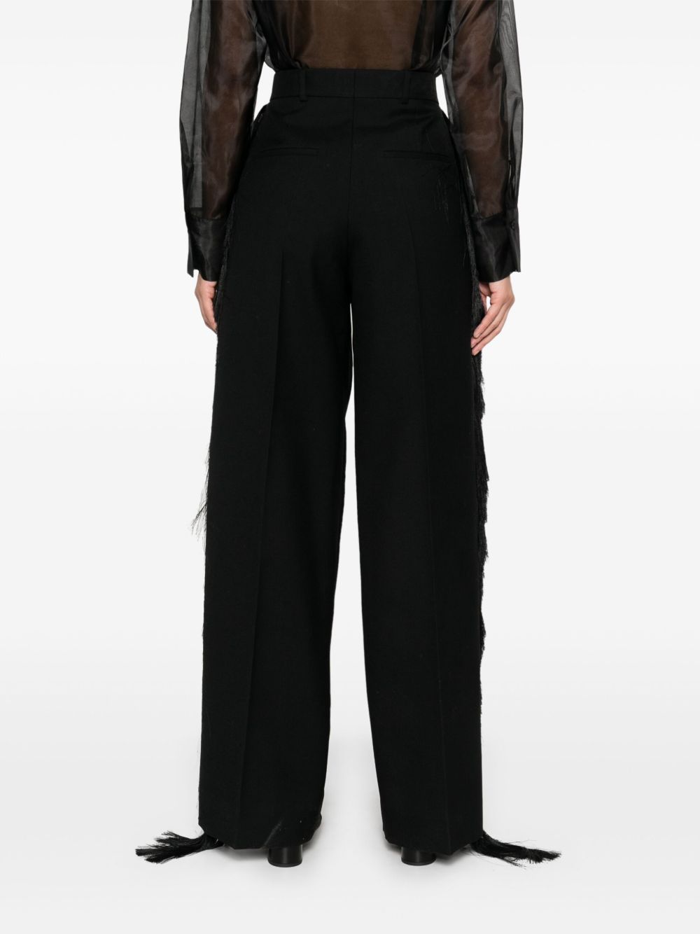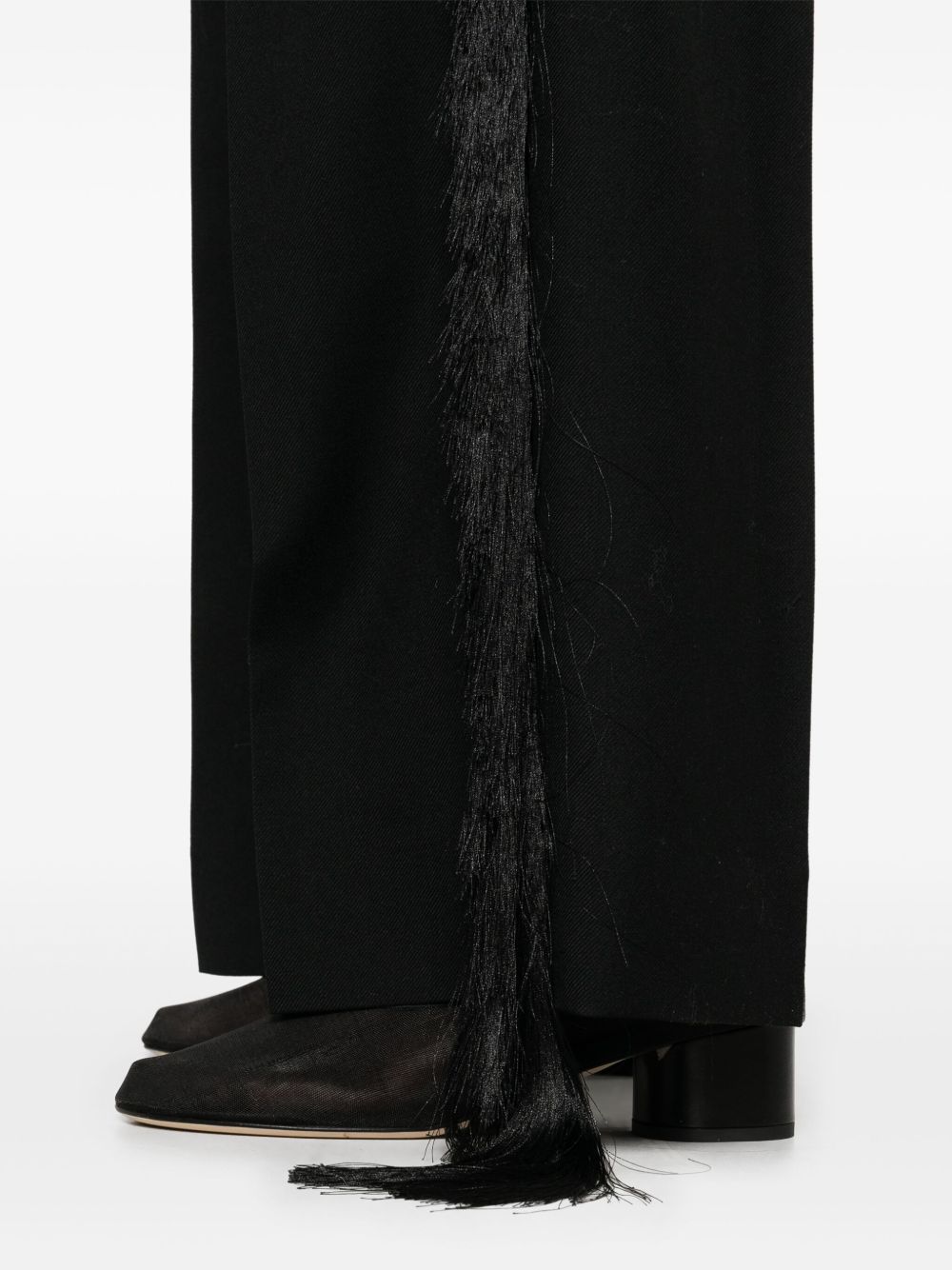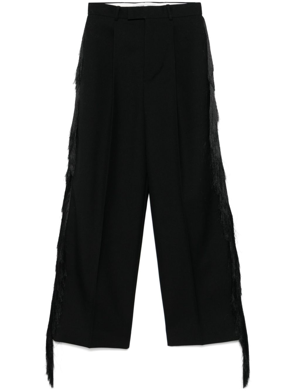 Pantalone con frange di CARVEN nero in lana con tasche laterali e posteriori a filetto, dettaglio con pieghe a cannone e chiusura frontale nascosta.