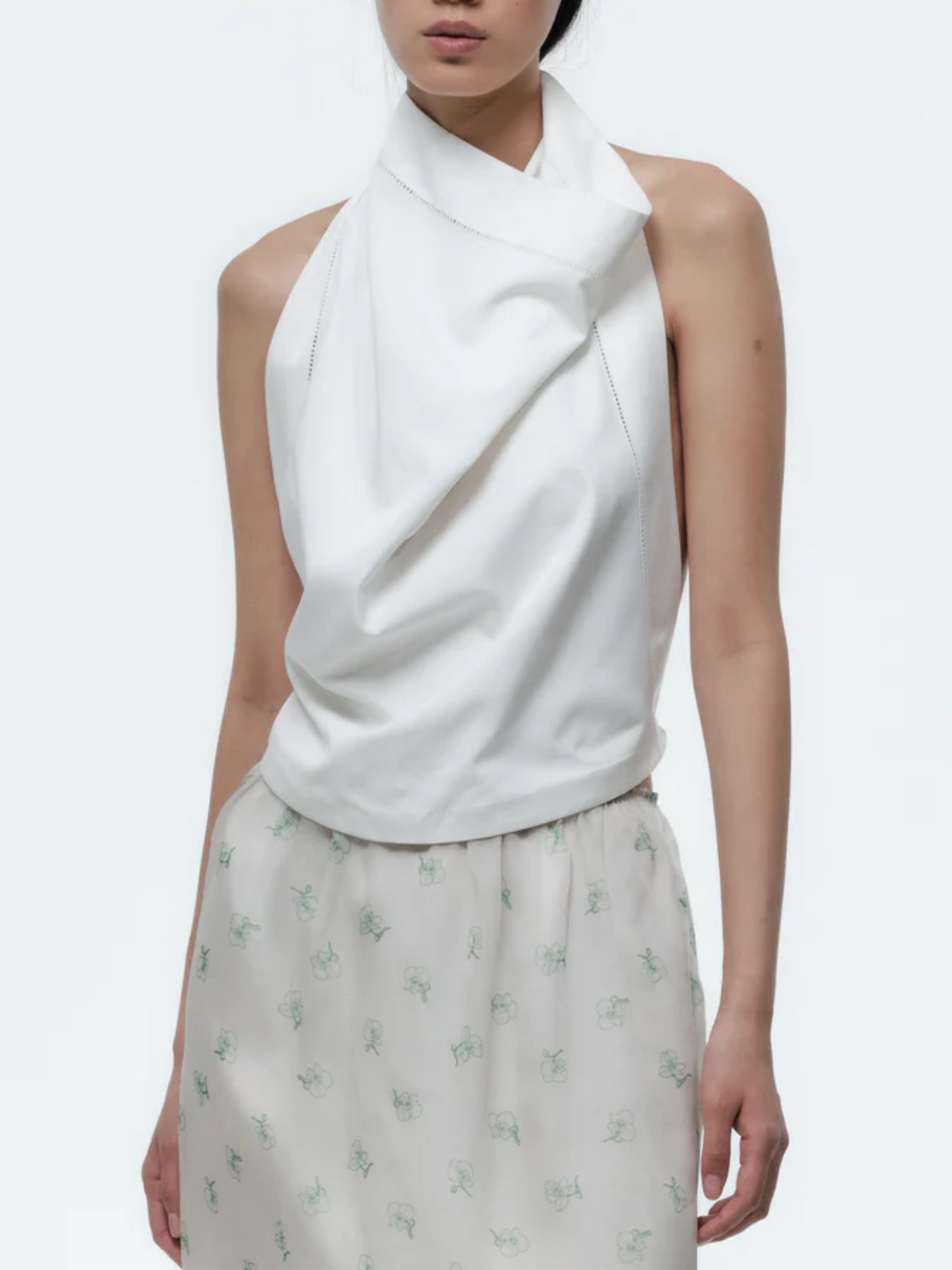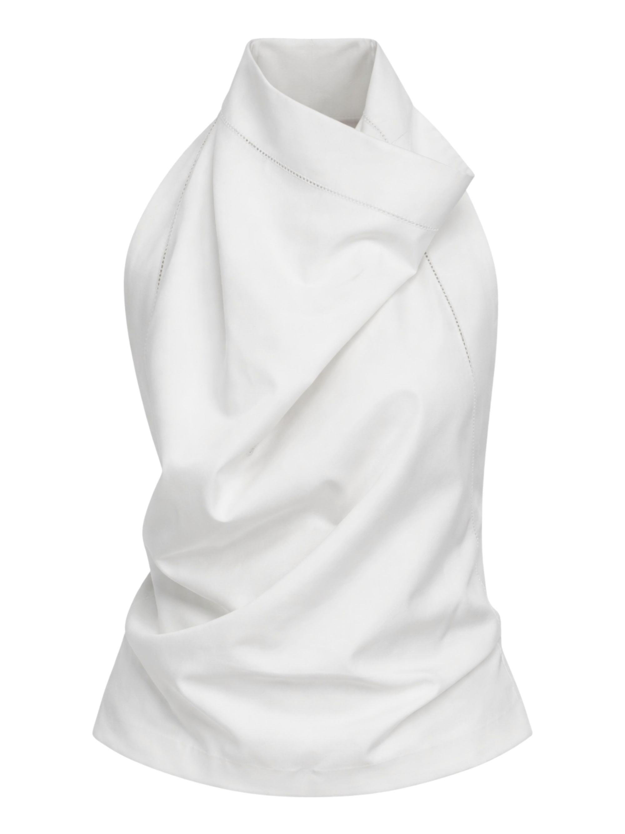 Top backless di CARVEN bianco in seta caratterizzato da scollo drappeggiato, bordi ricamati, schiena aperta e chiusura in vita con gancio e occhiello e chiusura al collo con bottoni a pressione.