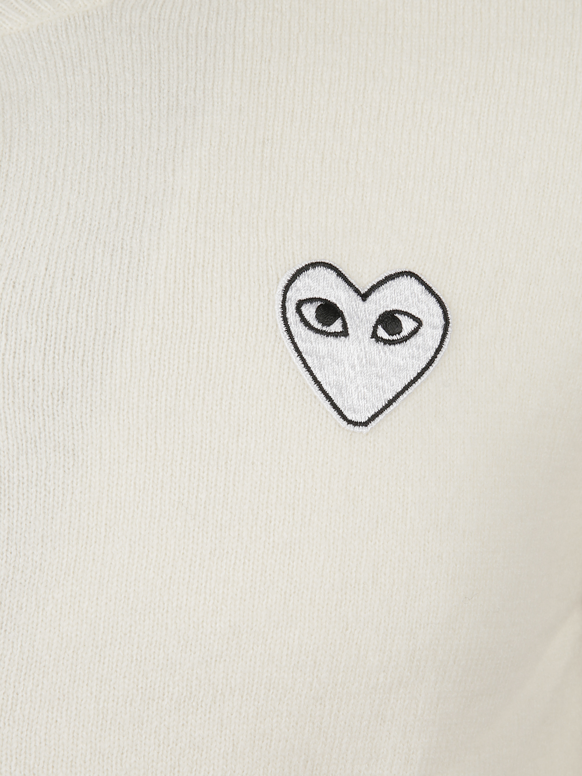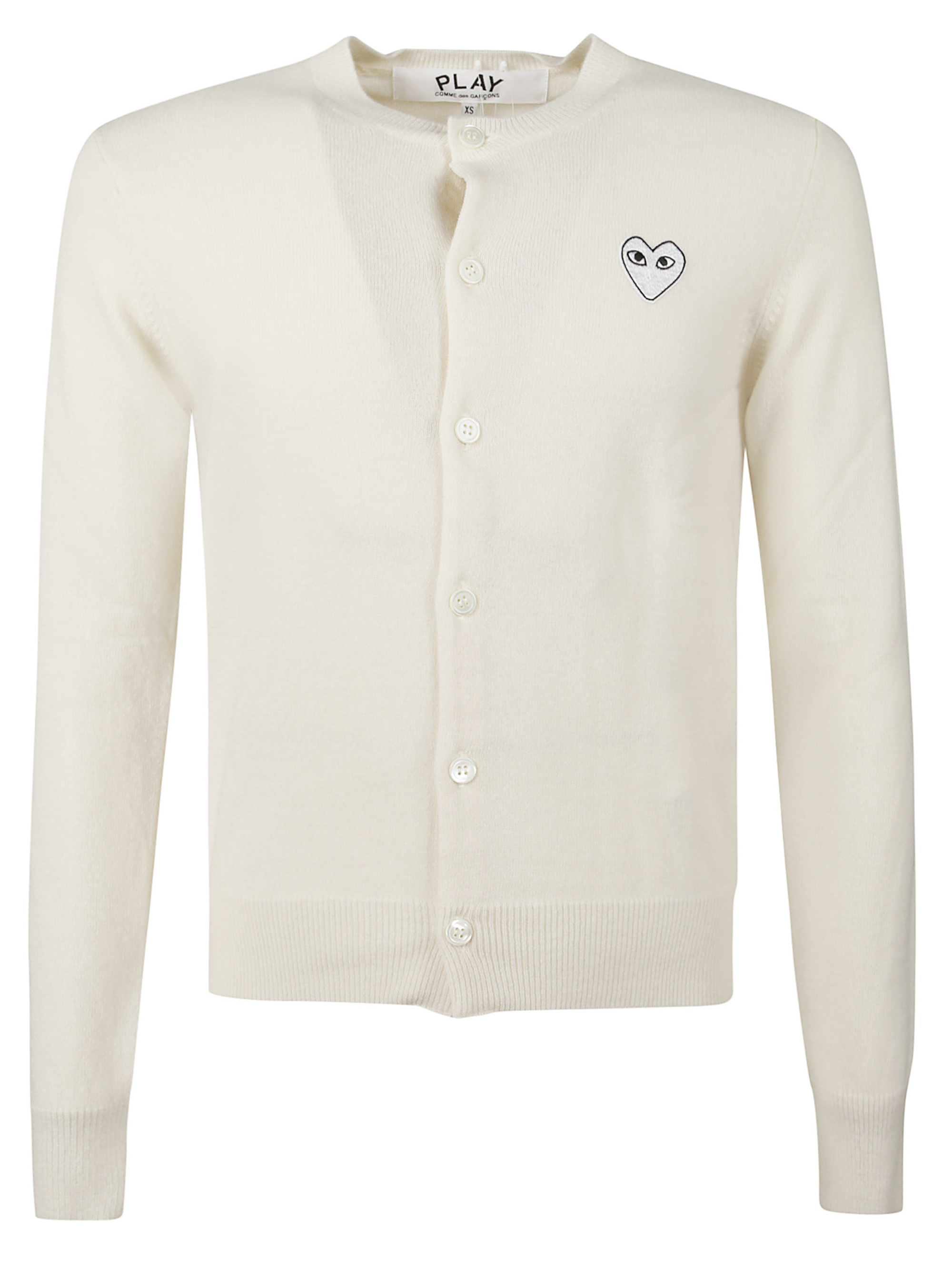 Cardigan bianco di COMME DES GARCONS PLAY caratterizzato da logo a cuore sul petto, maniche lunghe e bottoni.