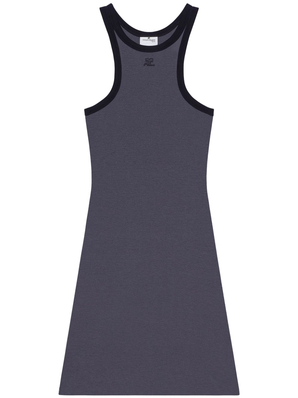 Abito mini di COURRÈGES blu acciaio con profili blu in cotone, senza maniche, scollo olimpionico, girocollo e applicazione frontale con logo.