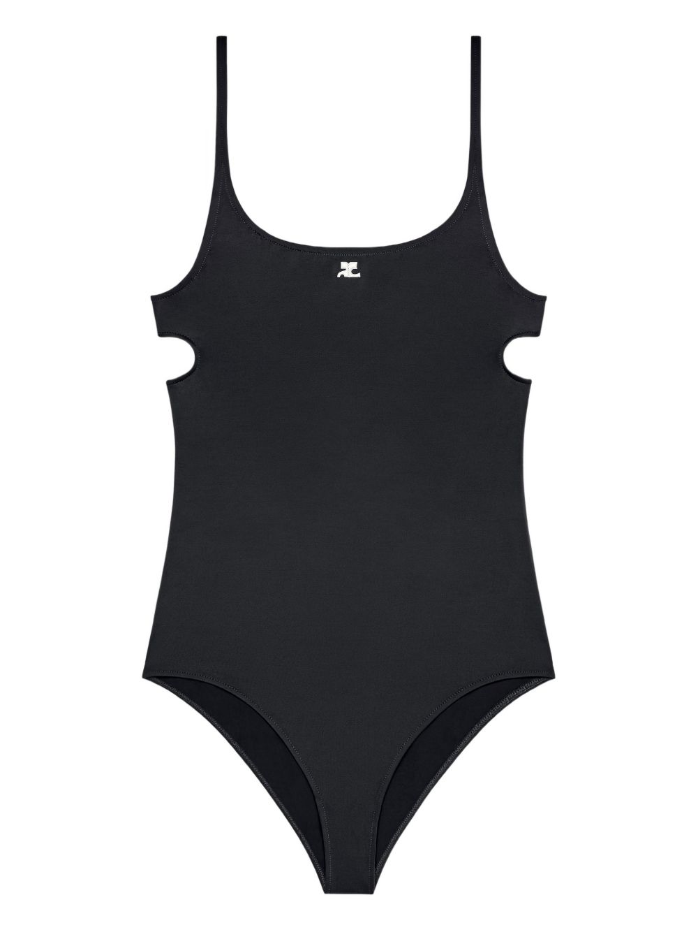 Costume Cut-Out di COURRÈGES nero, caratterizzato da scollatura a barchetta, spalline sottili, sgambatura alta, logo e dettagli cut-ot sui fianchi.