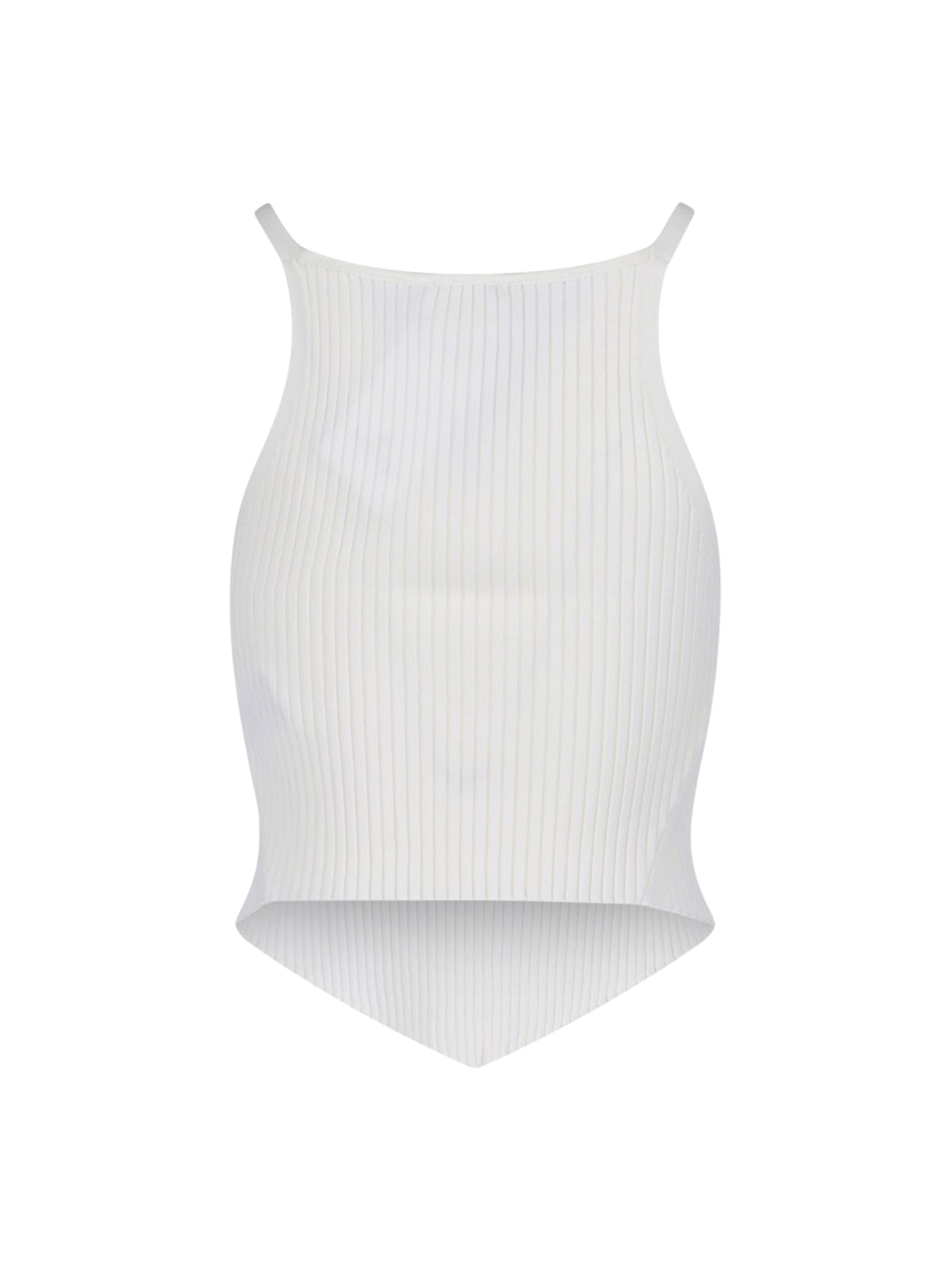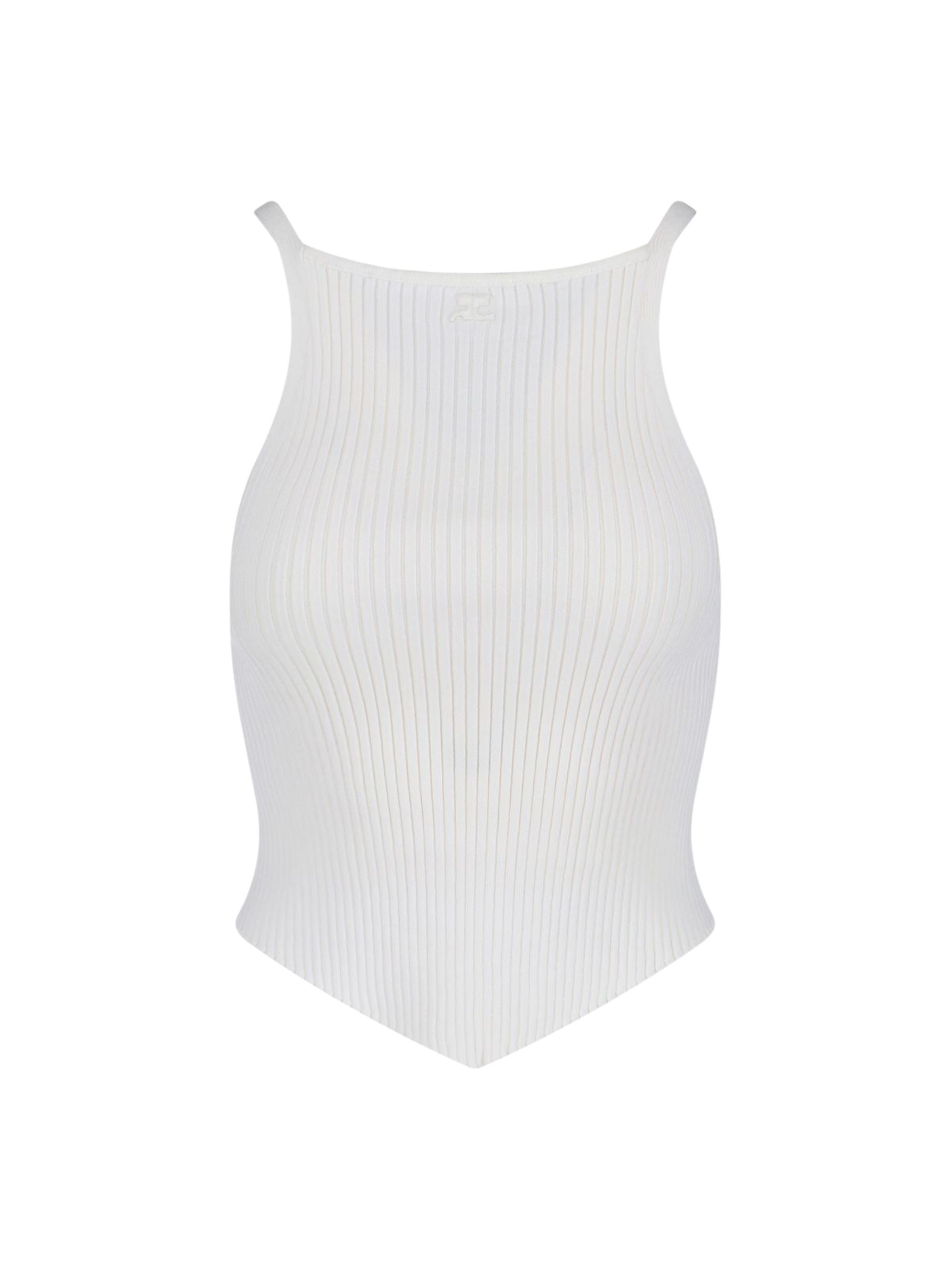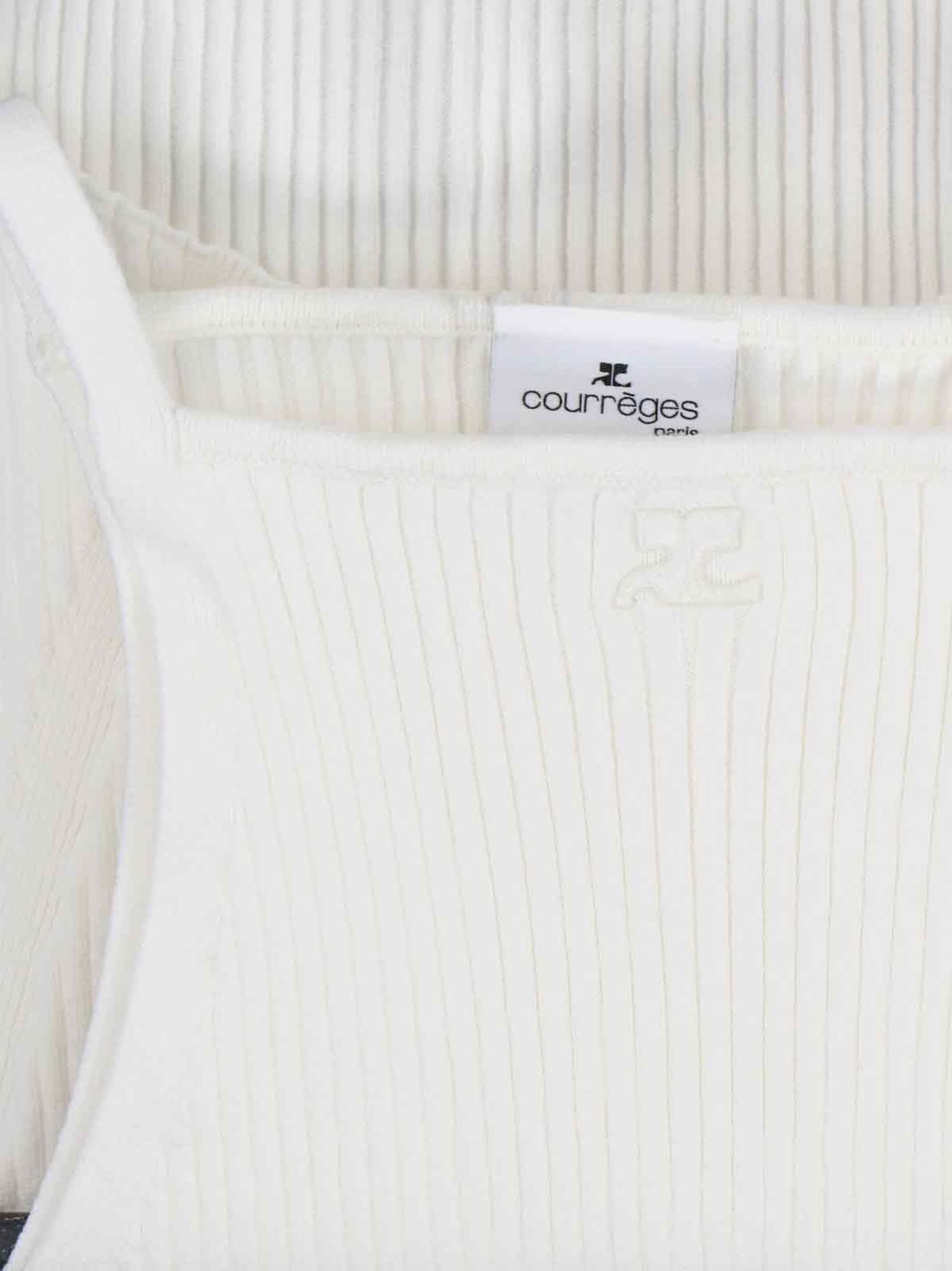 Top a coste di COURRÈGES bianco in viscosa, caratterizzato da lavorazione a coste, spalline sottili, orlo a punta e logo ricamato sul petto.