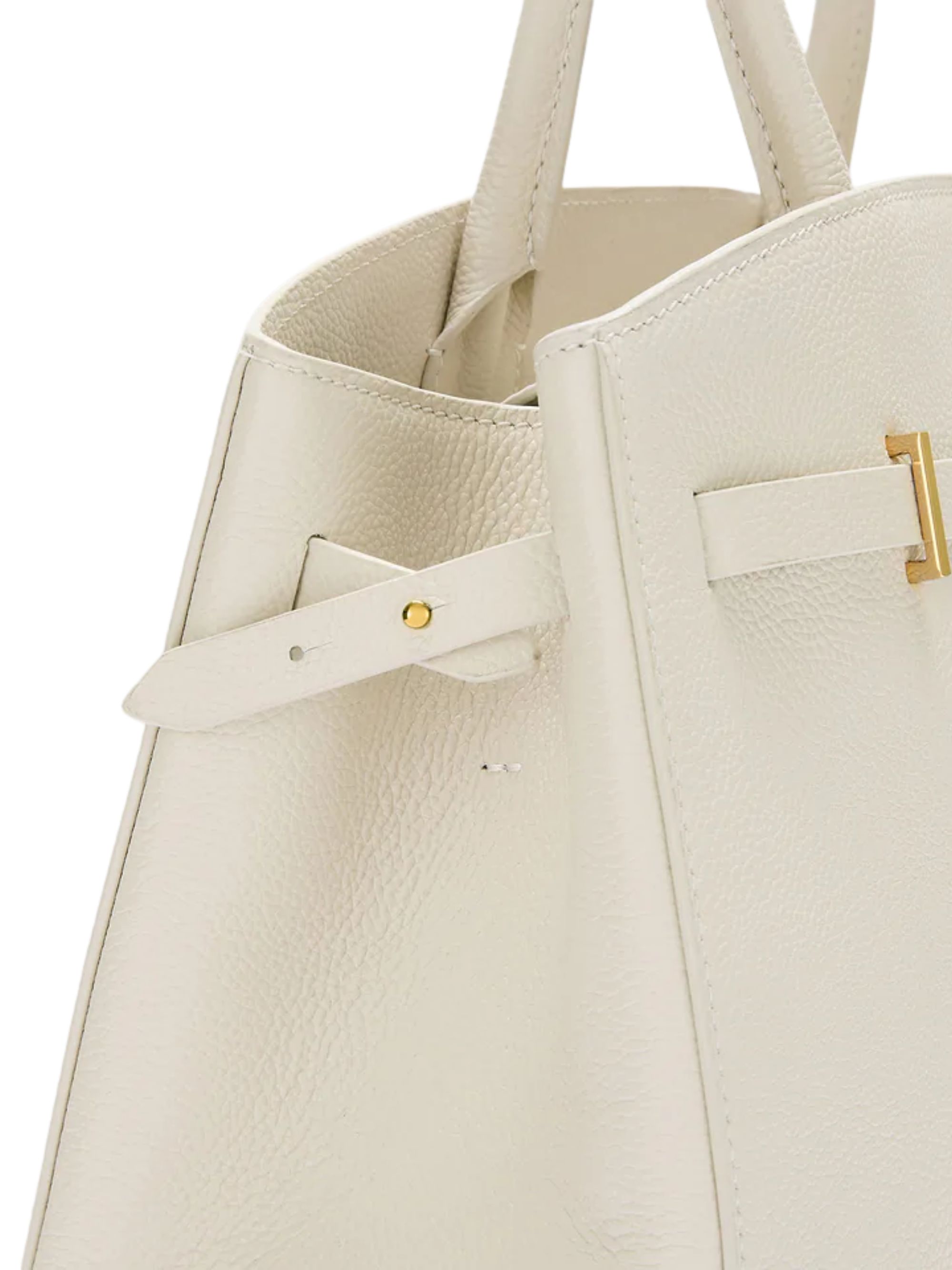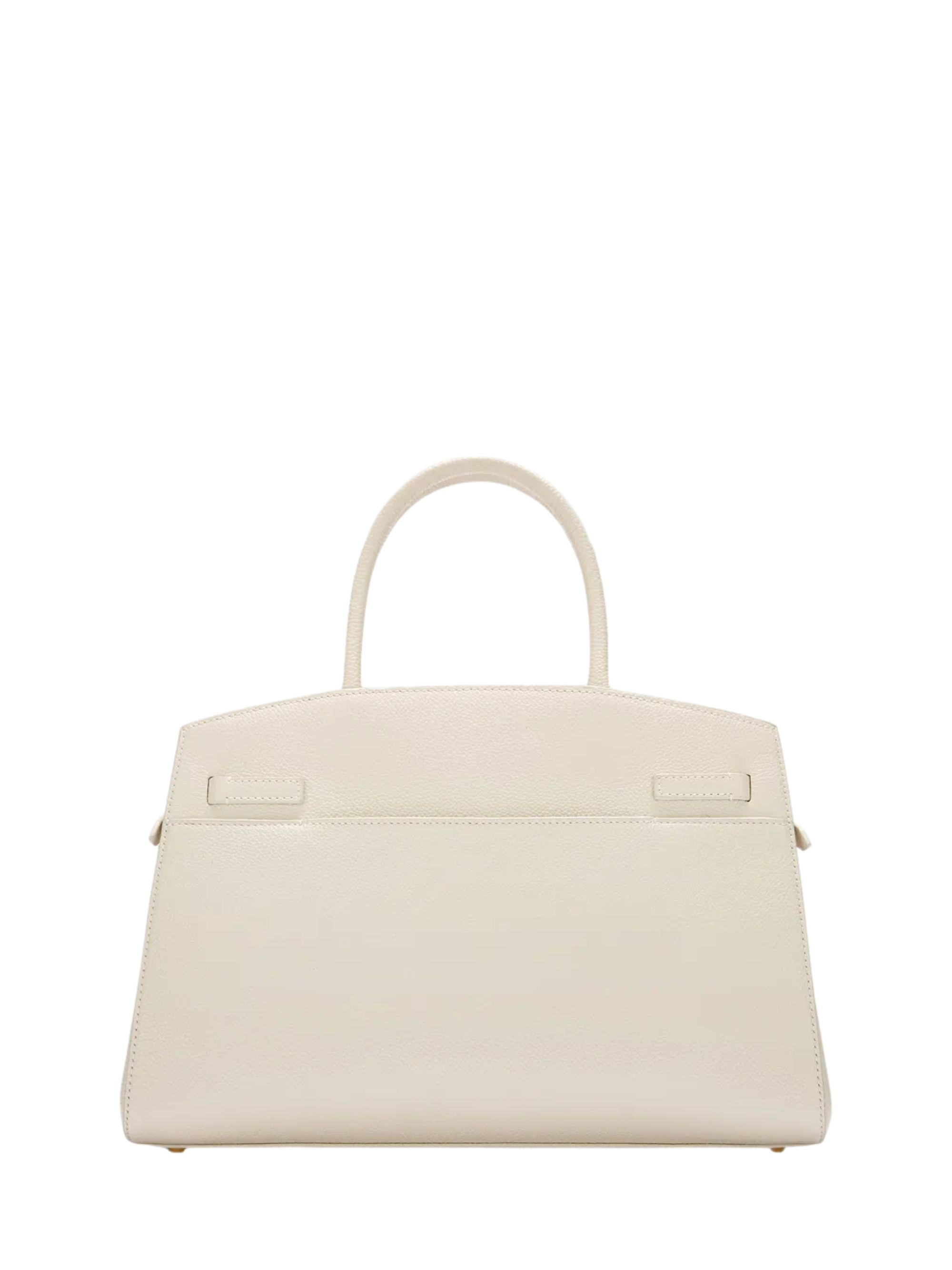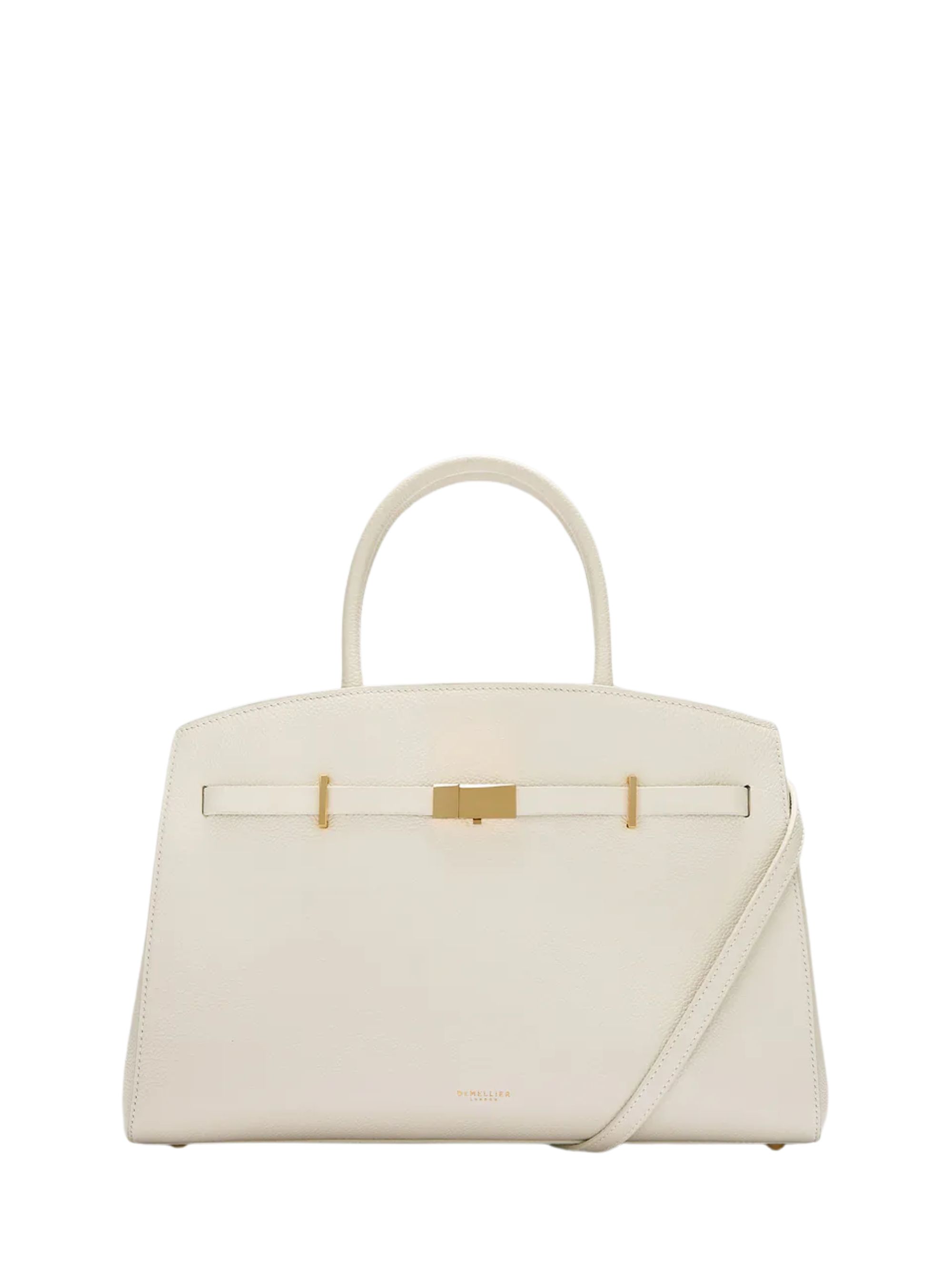 Borsa The Hudson midi di DEMELLIER bianca in pelle, caratterizzata da due manici superiori, tracolla regolabile e rimovibile, hardware oro, chiusura a moschettone e logo frontale.