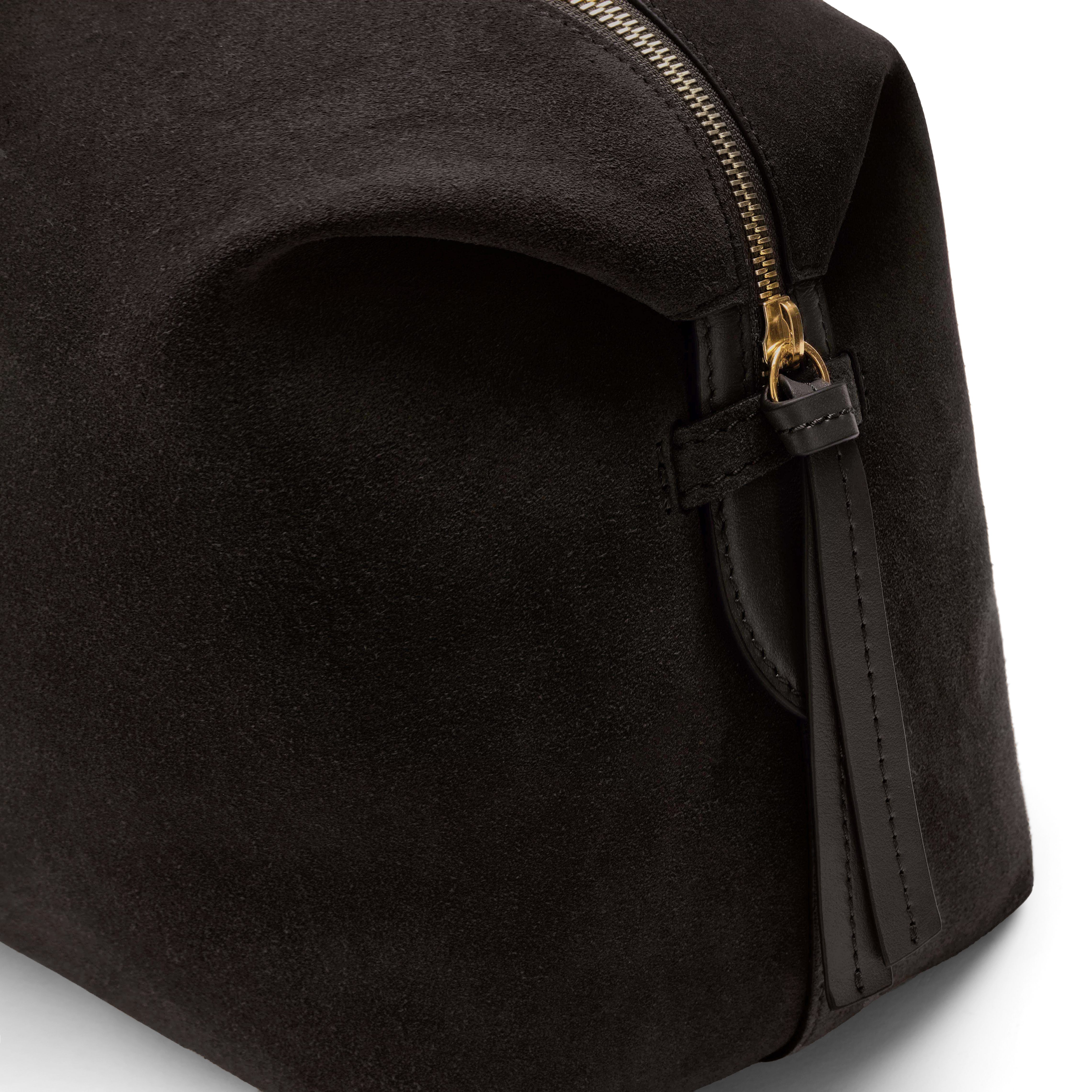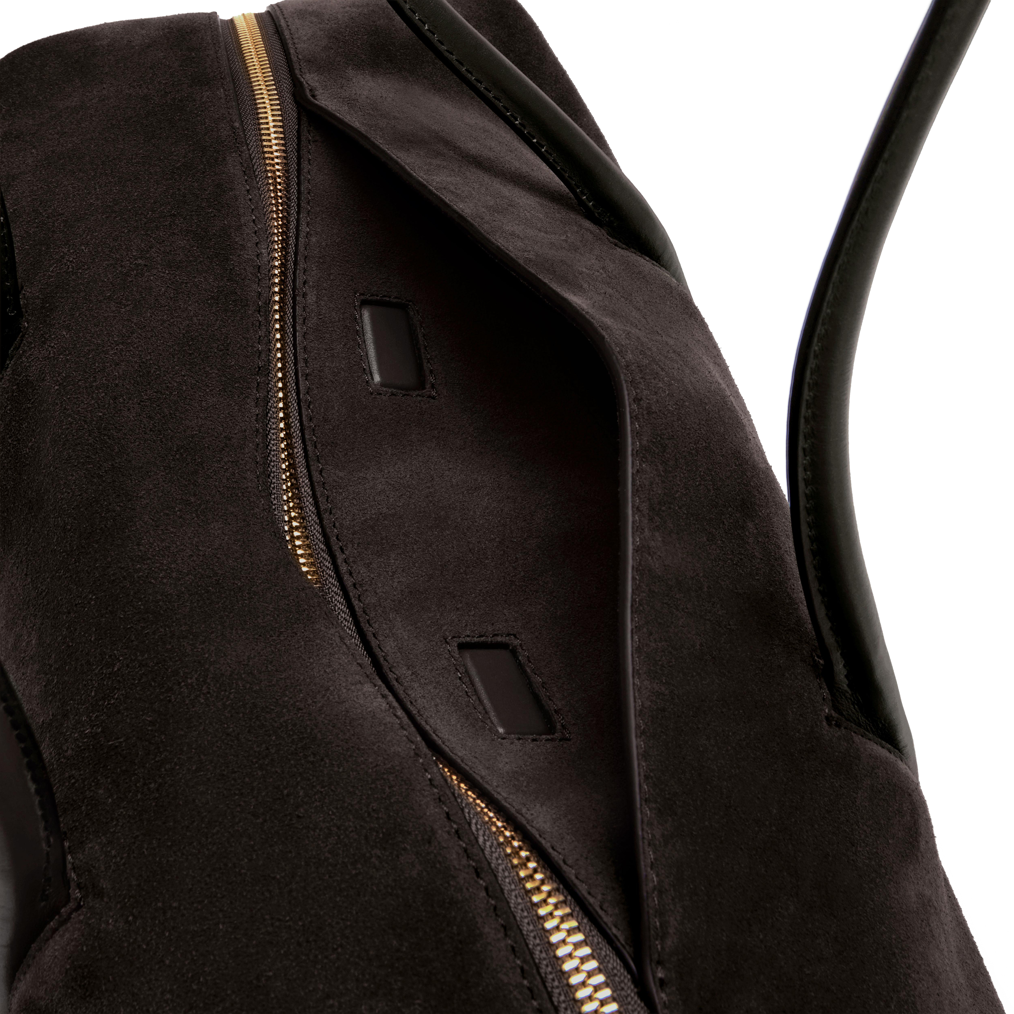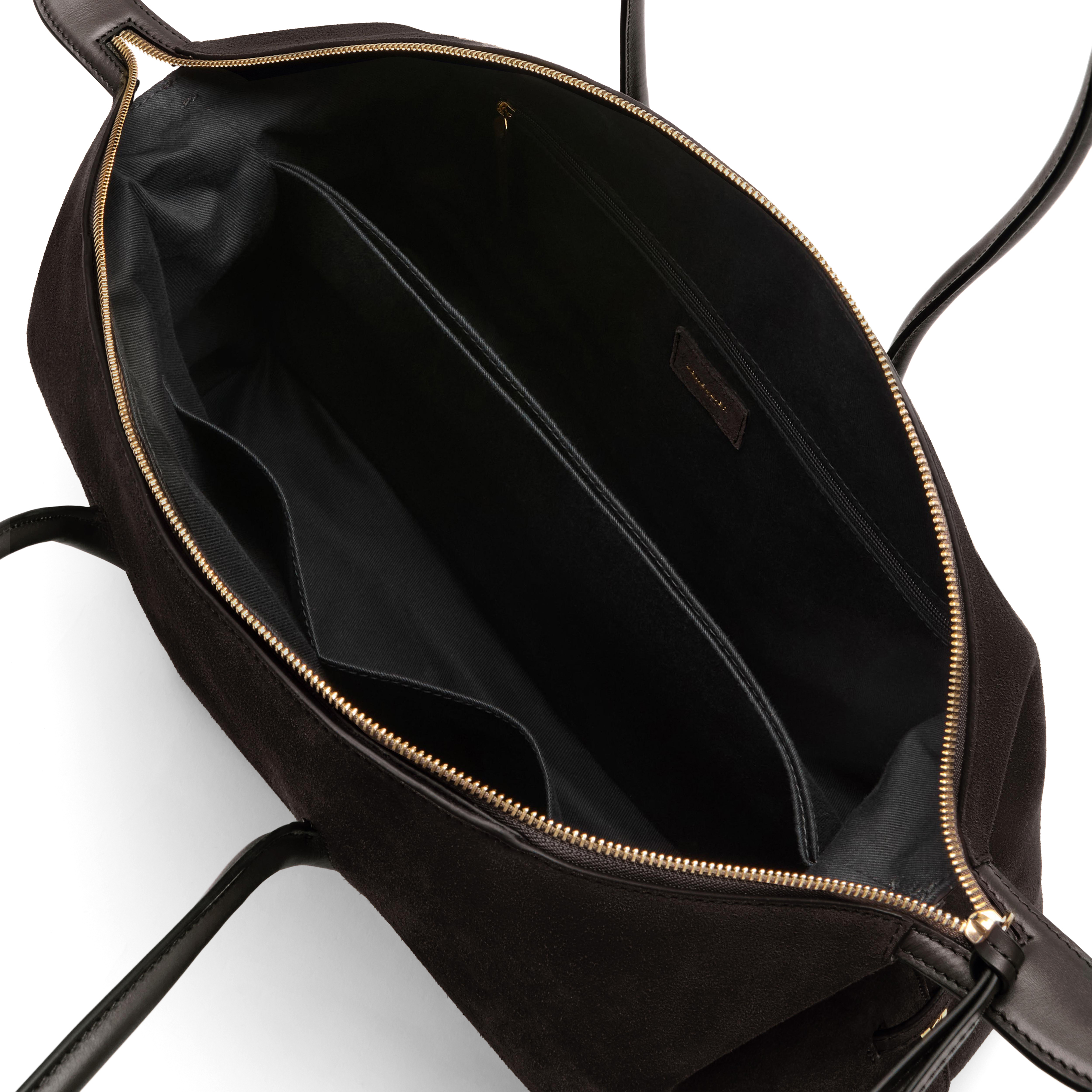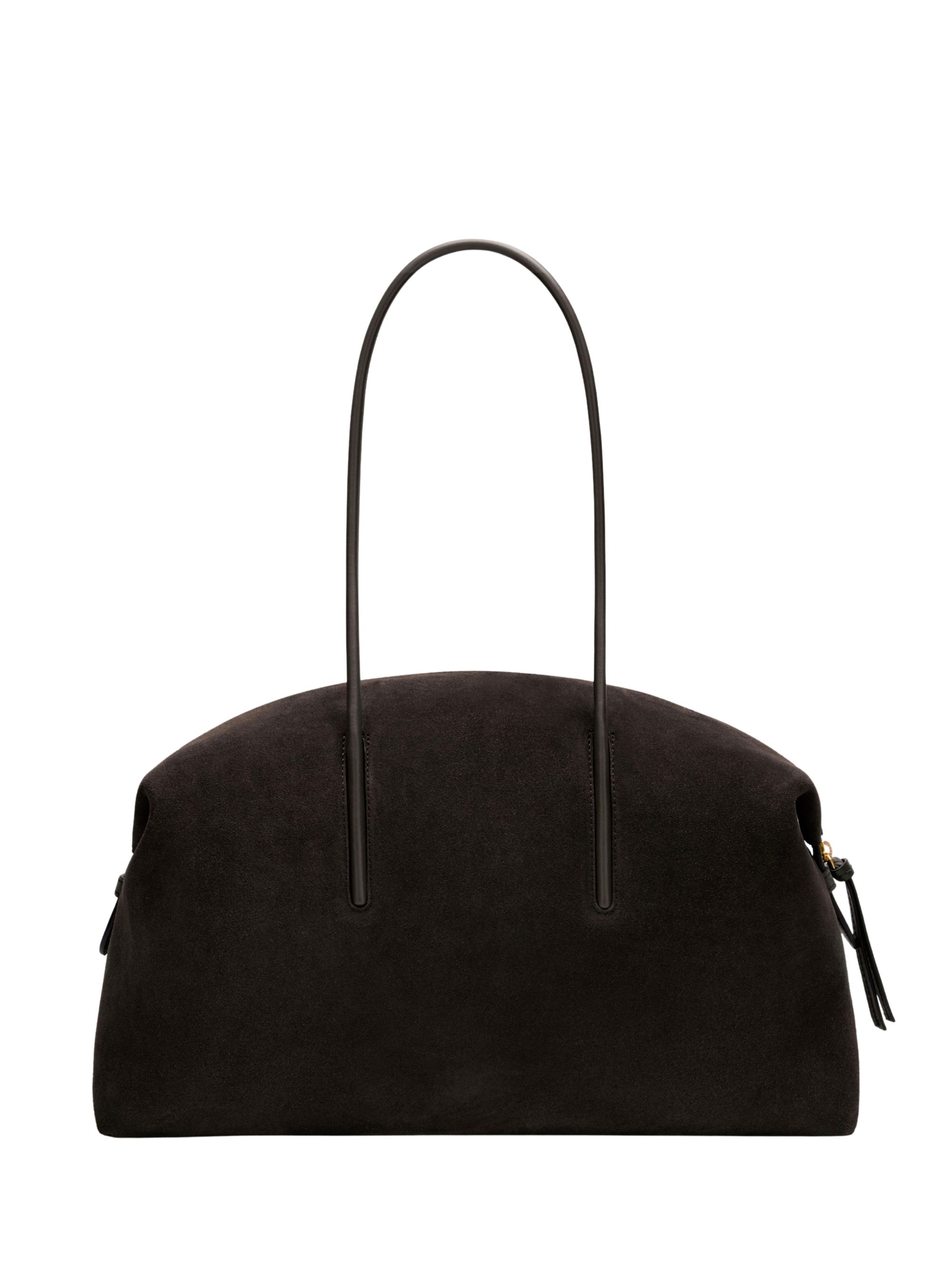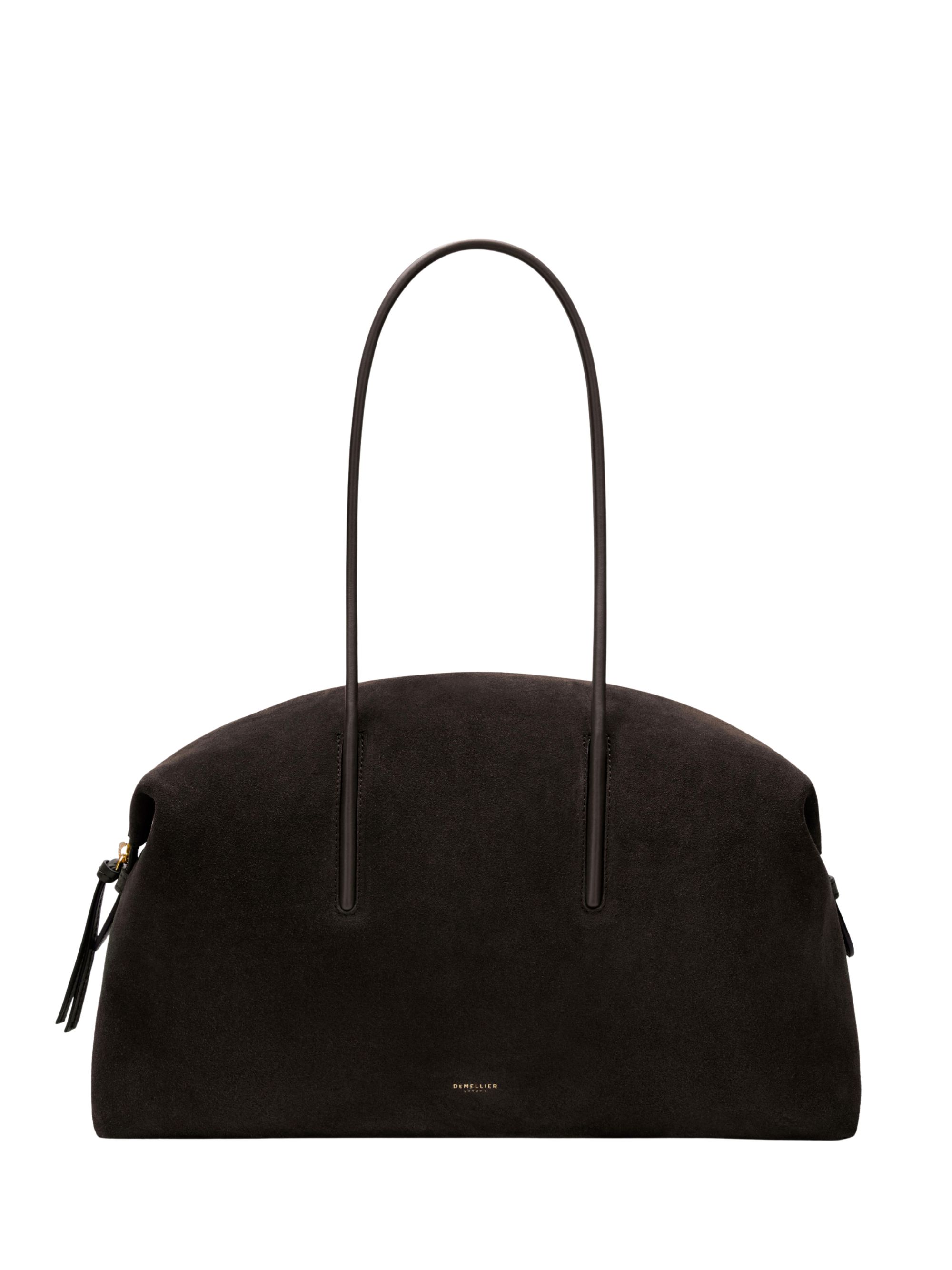 Borsa The Stockholm di DEMELLIER marrone in pelle scamosciata, caratterizzata da due manici lunghi, chiusura con zip, logo frontale e due scomparti interni con tasche.