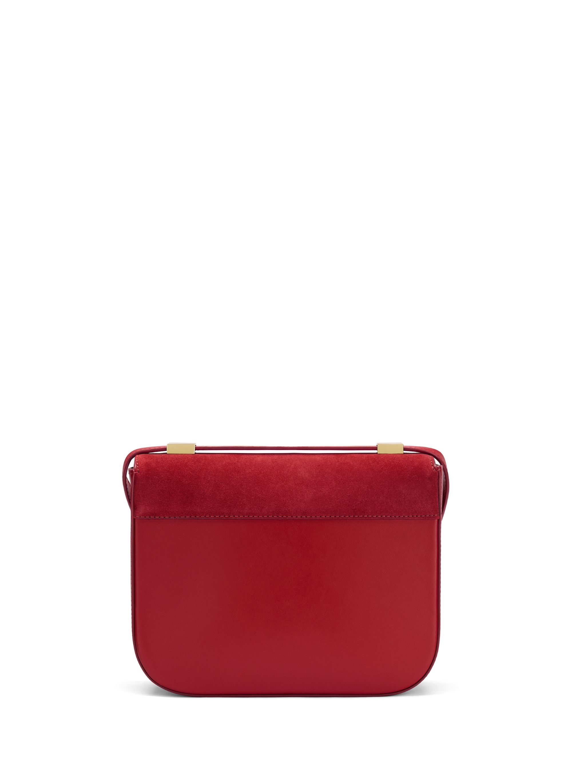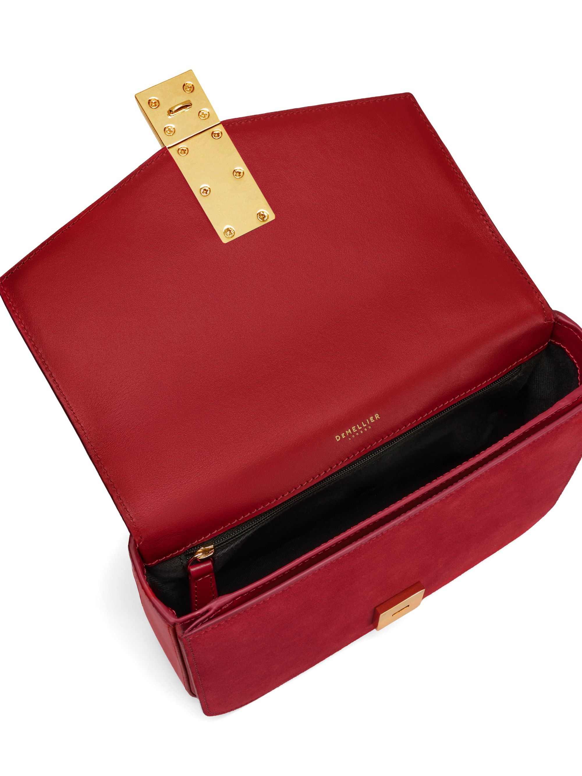 Borsa Vancouver di DEMELLIER rossa in pelle scamosciata, caratterizzata da chiusura a doppia barra, hardware oro, tracolla regolabile, due scomparti interni, tasa interna con zip e logo frontale.