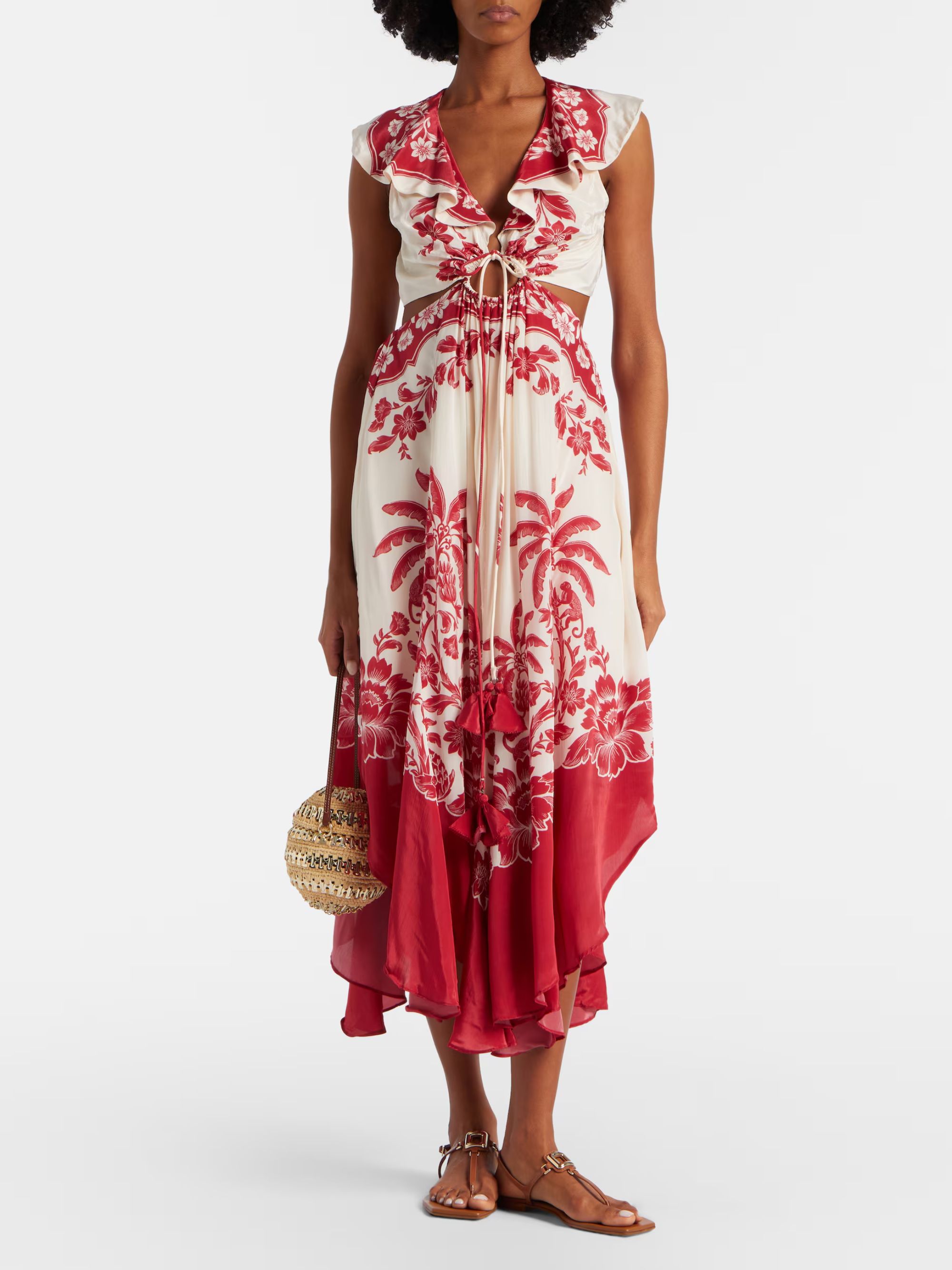 Abito Guanacaste midi di FARM RIO rosso in viscosa, caratterizzato da scollo a V, dettaglio tagliato in vita, motivo botanico, orlo asimmetrico, fascia elastica in vita e chiusura con laccio.
