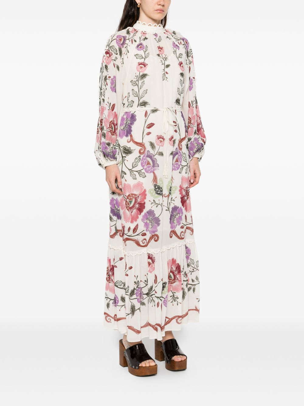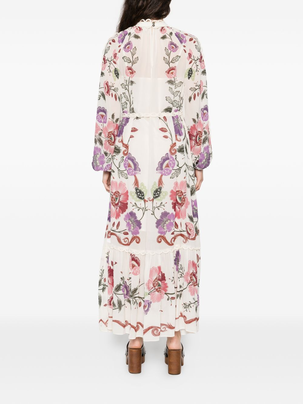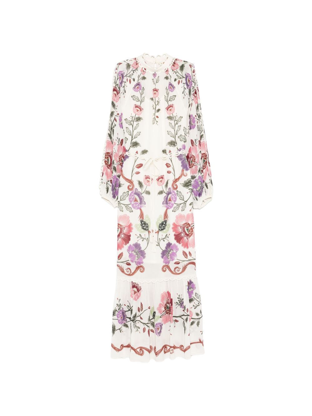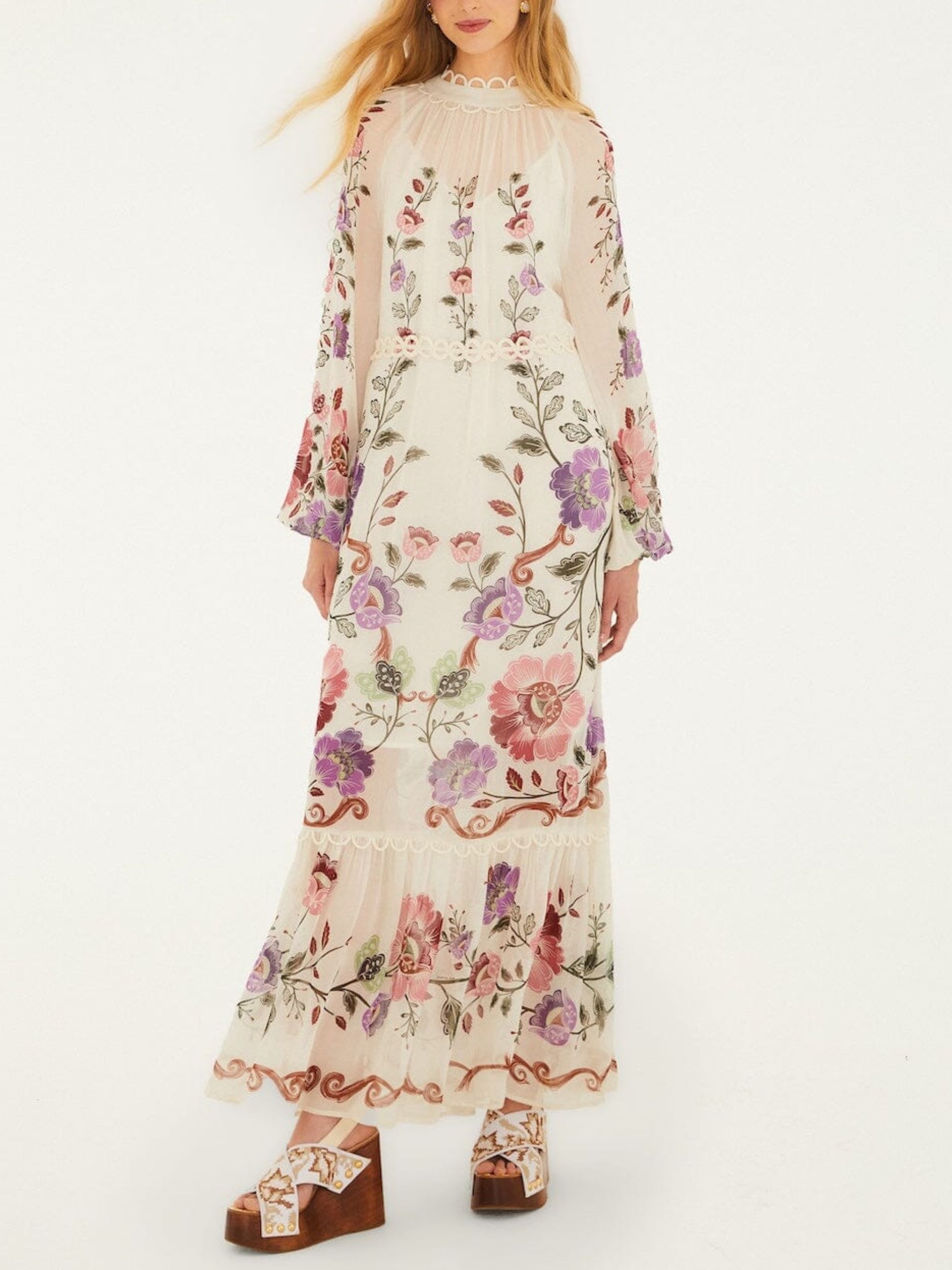 Abito Rococo di FARM RIO multicolor in viscosa, caratterizzato da motivo florale, scollatura alta, maniche lunghe, bordi smerlati e chiusura con bottone sul retro.