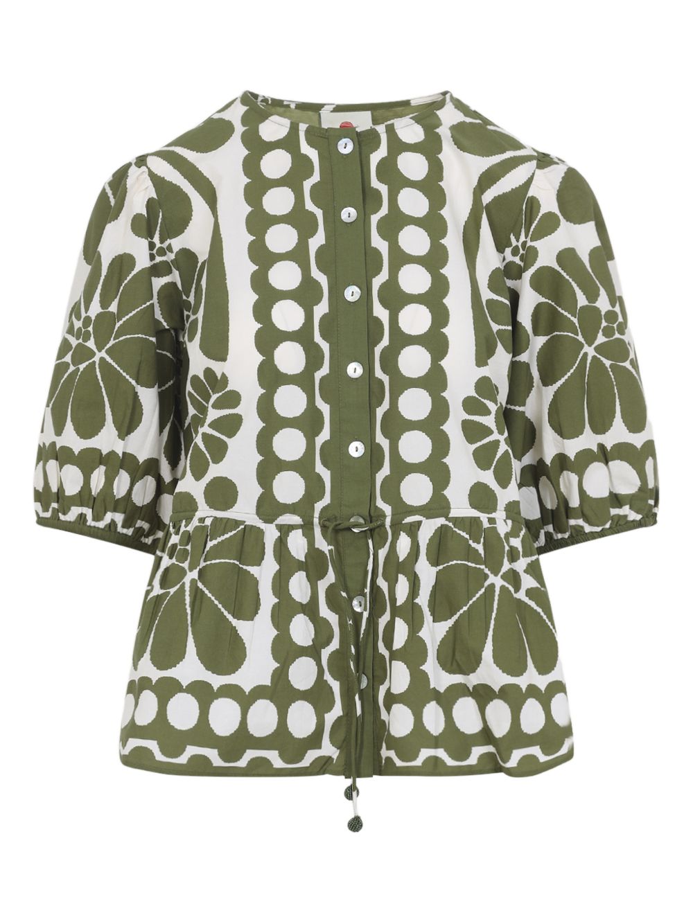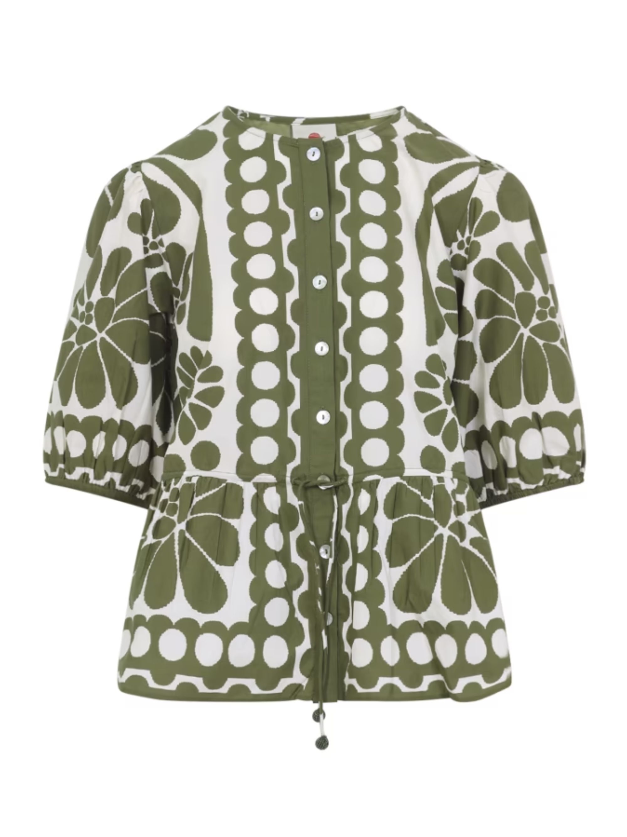Camicia Palermo di FARM RIO verde in cotone, caratterizzata da maniche corte a sbuffo arricciate, coulisse in vita e chiusura con bottoni.