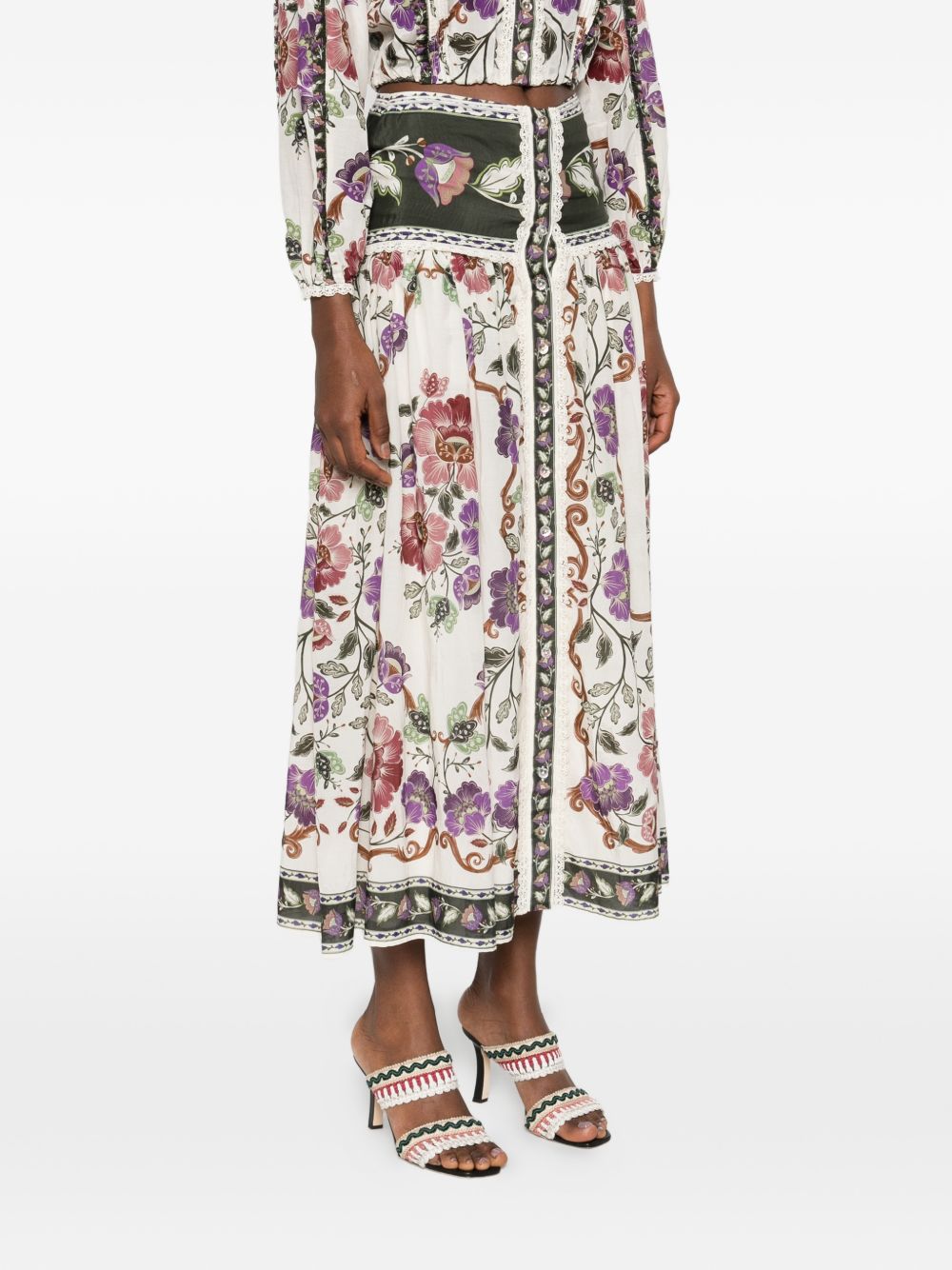 Gonna Rococo midi di FARM RIO multicolor in cotone e viscosa, caratterizzata da chiusura con bottoni in pizzo, motivo floreale e dettagli in pizzo.
