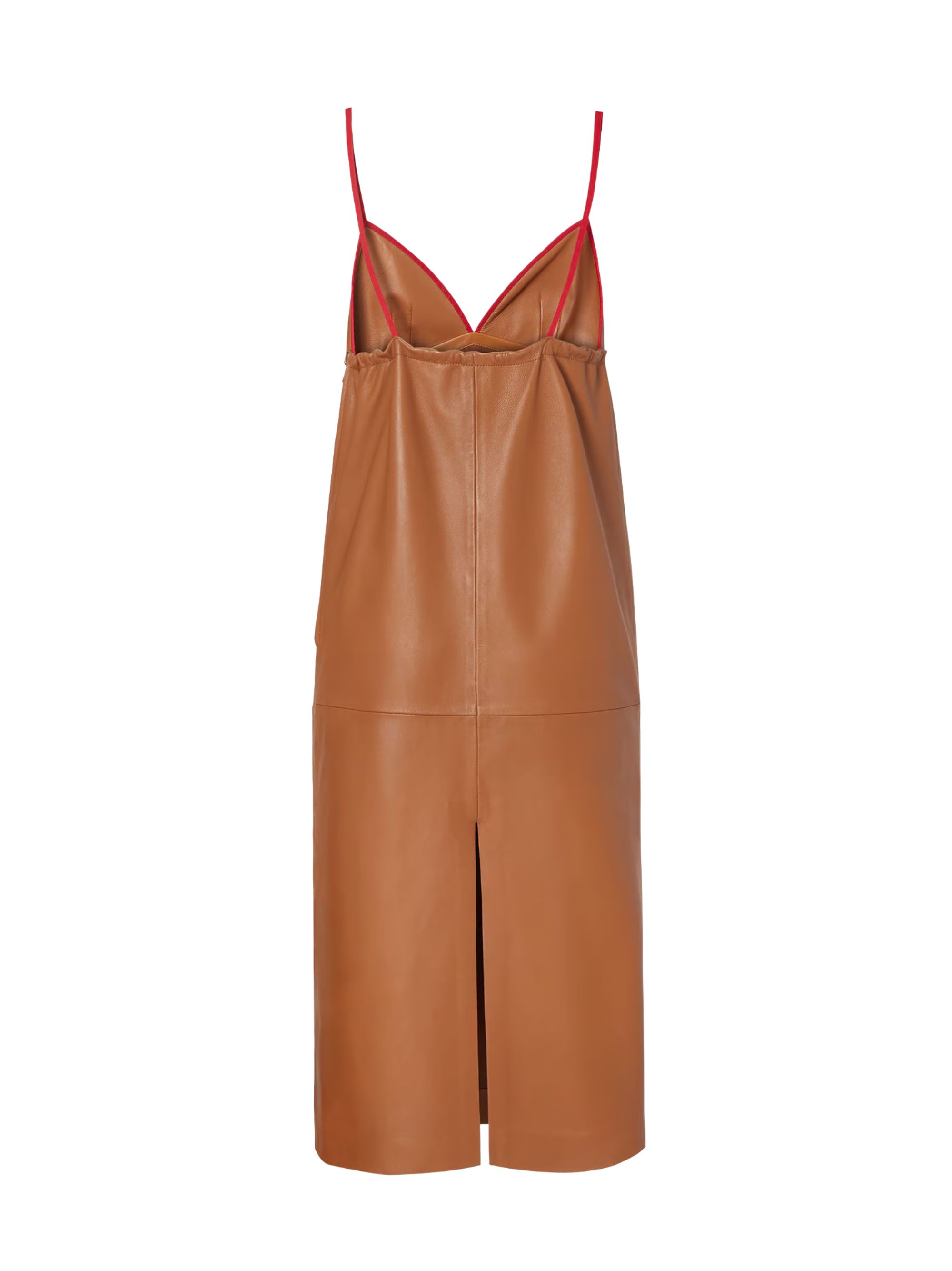 Abito in pelle di FENDI marrone, caratterizzato da scollo a V, spalline sottili, spacco centrale sul retro, motivo Fendi Ajour rifinito con bordi rossi a contrasto, dettagli cut-out e chiusura ocn zip sul lato sinistro.