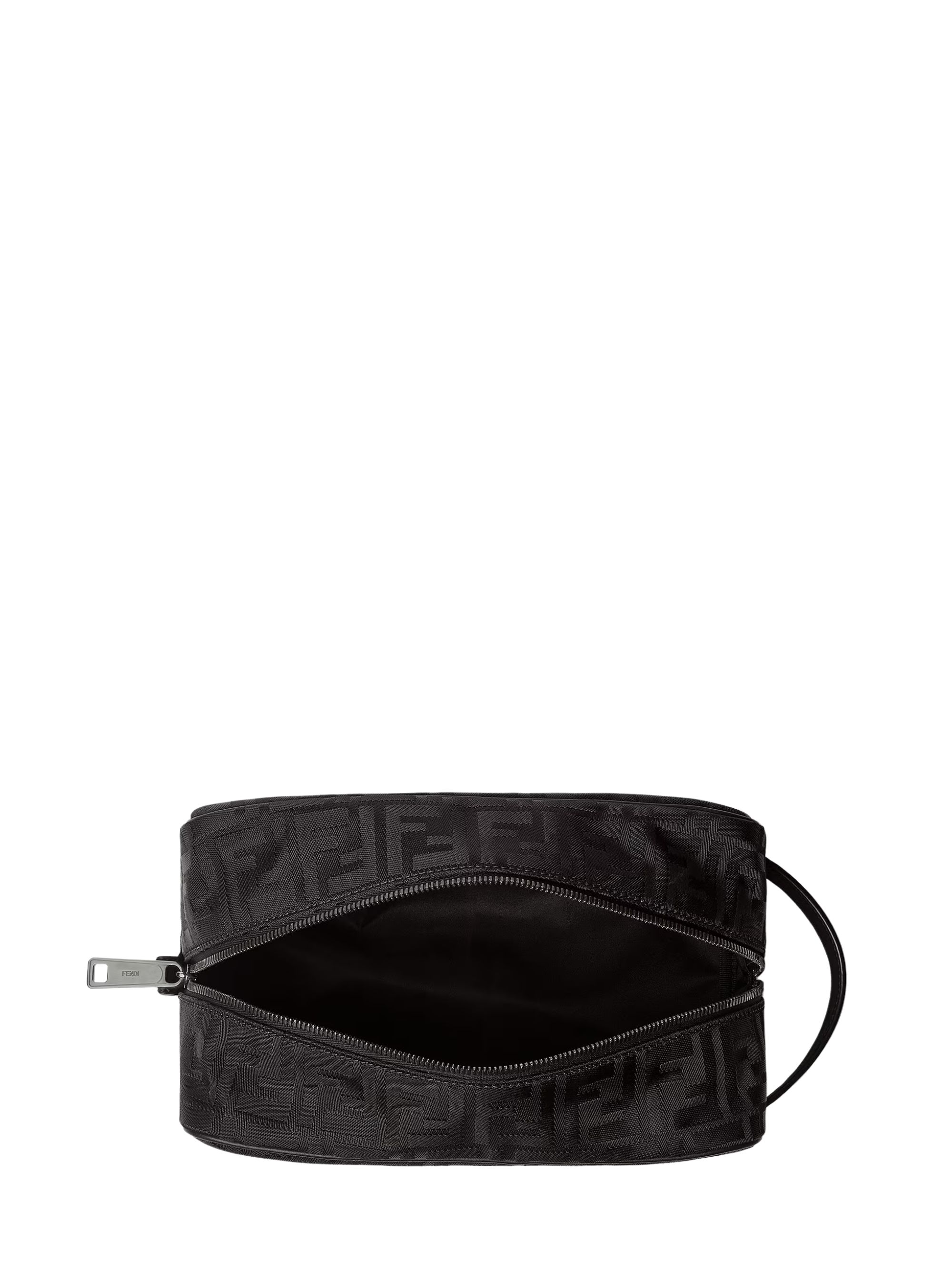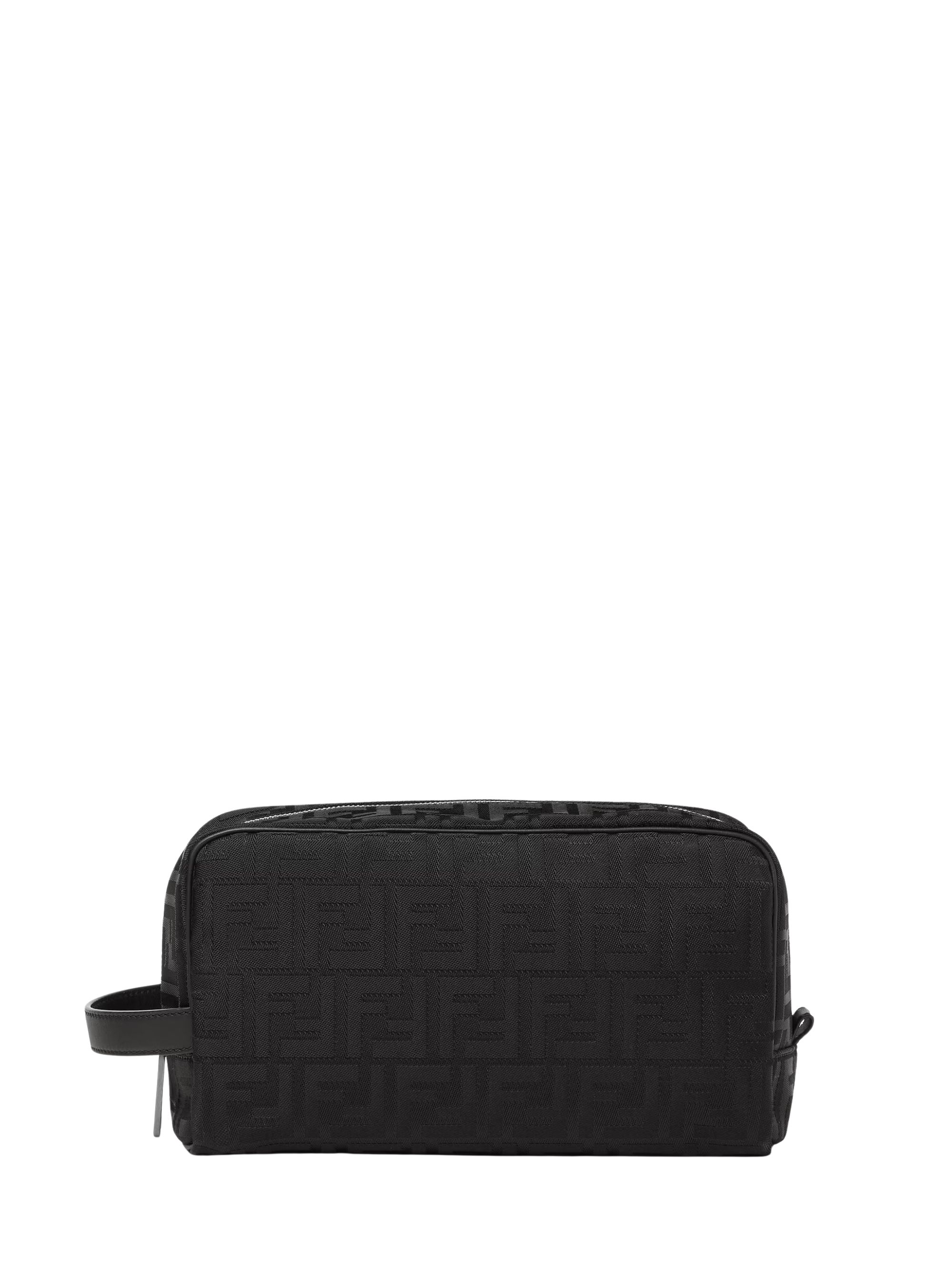 Beauty Case Medium FF di FENDI nero in nylon e pelle, caratterizzato da chiusura con zip, manico in pelle, texture lucente e leggermente a rilievo e fodera in tessuto. Dimensioni: 27,5 x 16 x 13 CM.