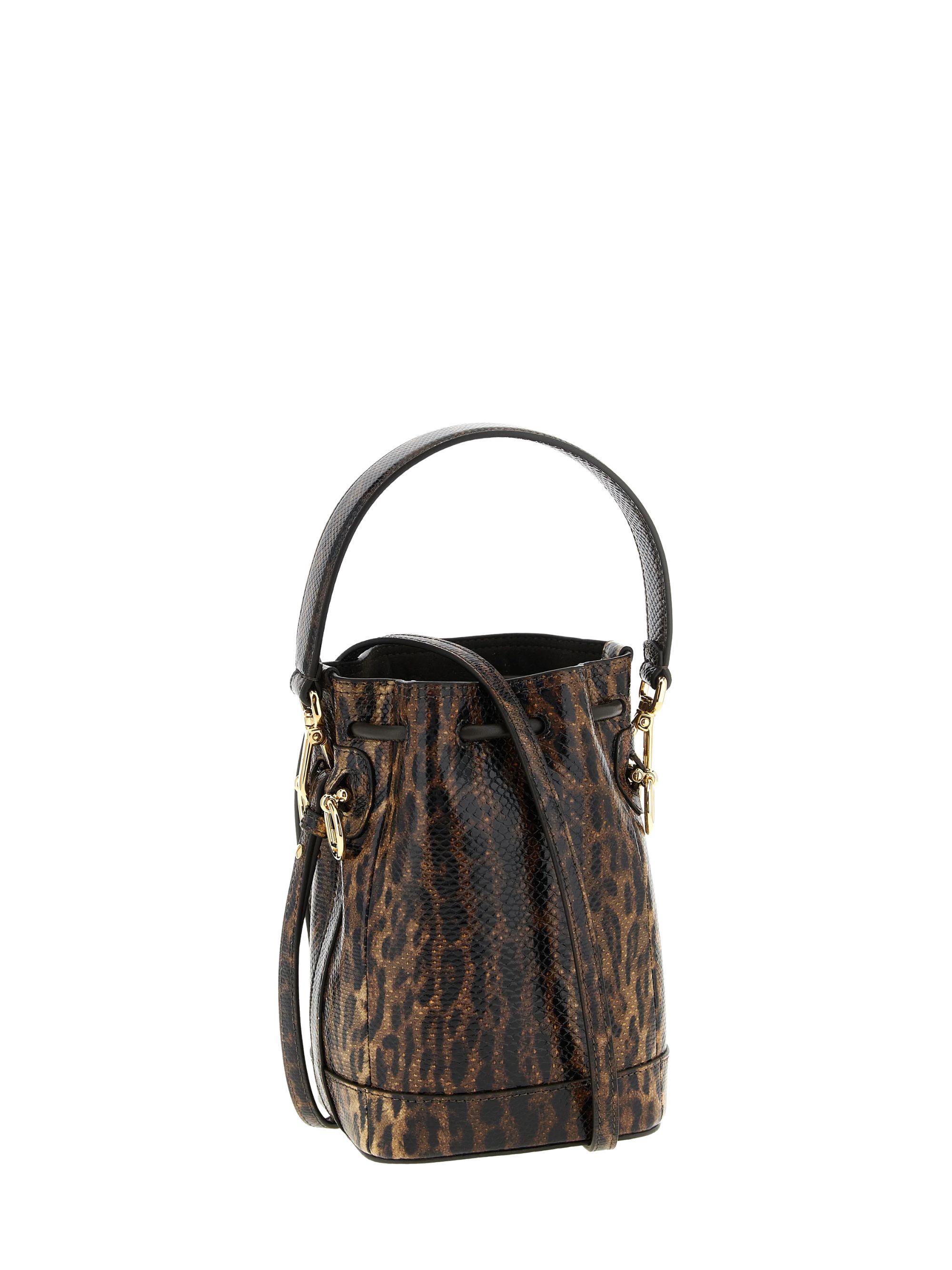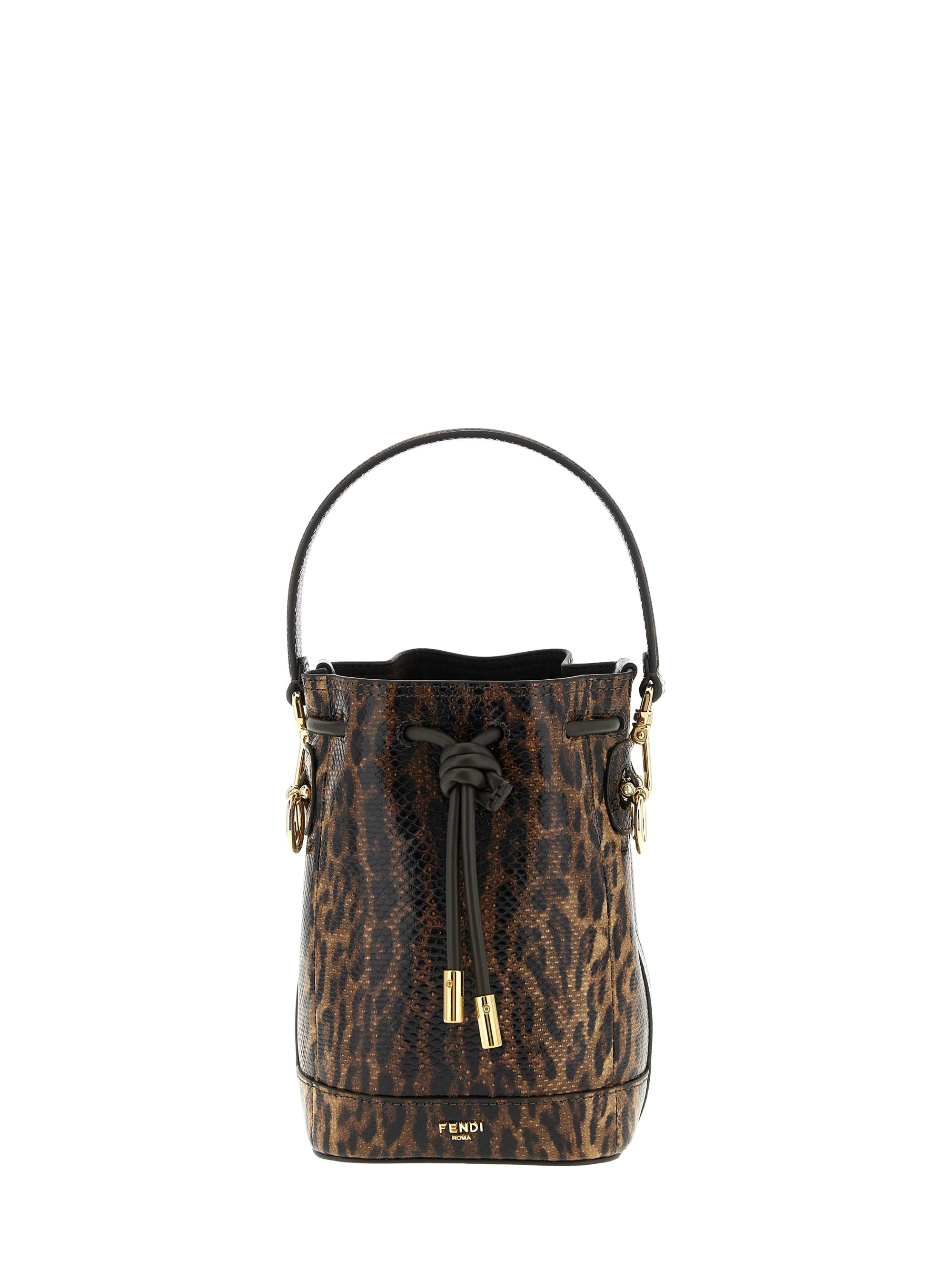 Borsa a secchiello Mon Tresor mini di FENDI marrone in pelle con stampa giaguaro all over, caratterizzata da tracolla regolabile e removibile, doppio manico, chiusura con coulisse, logo lettering sul fronte e scomparto unico.