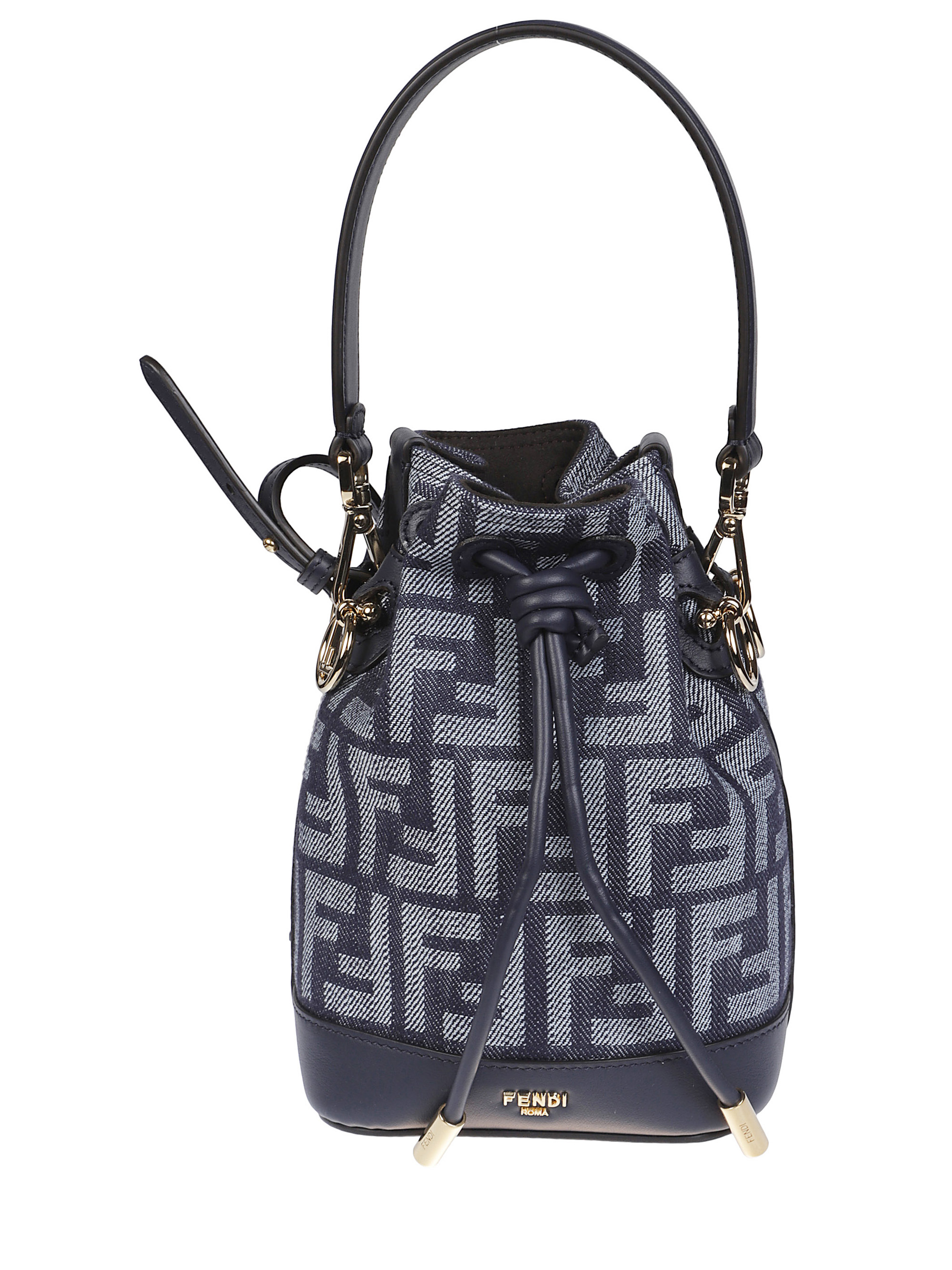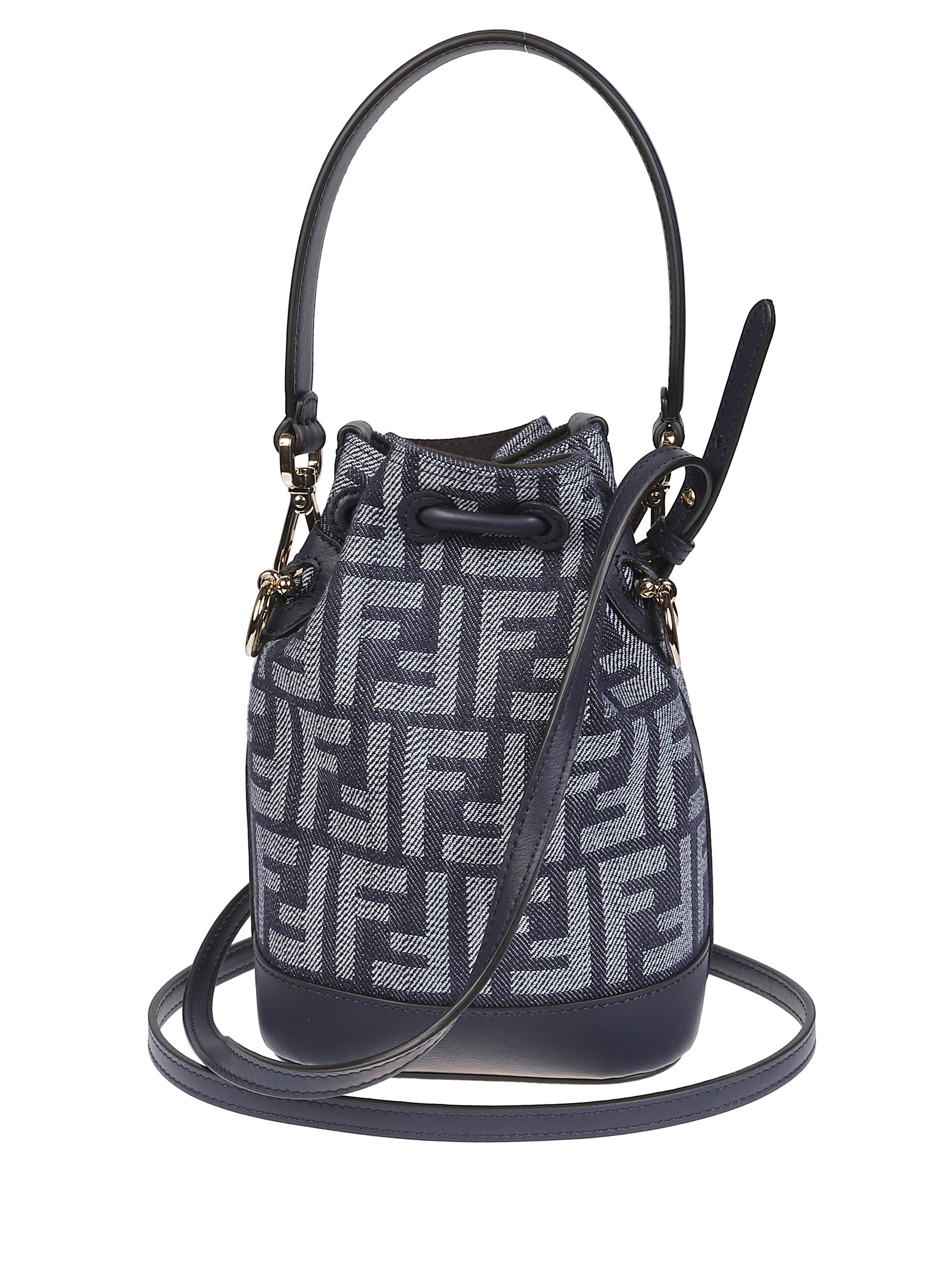 Borsa a secchiello Mon Tresor mini di FENDI blu in cotone con dettagli in pelle, hardware oro, manico, tracolla rimovibile e chiusura con coulisse.