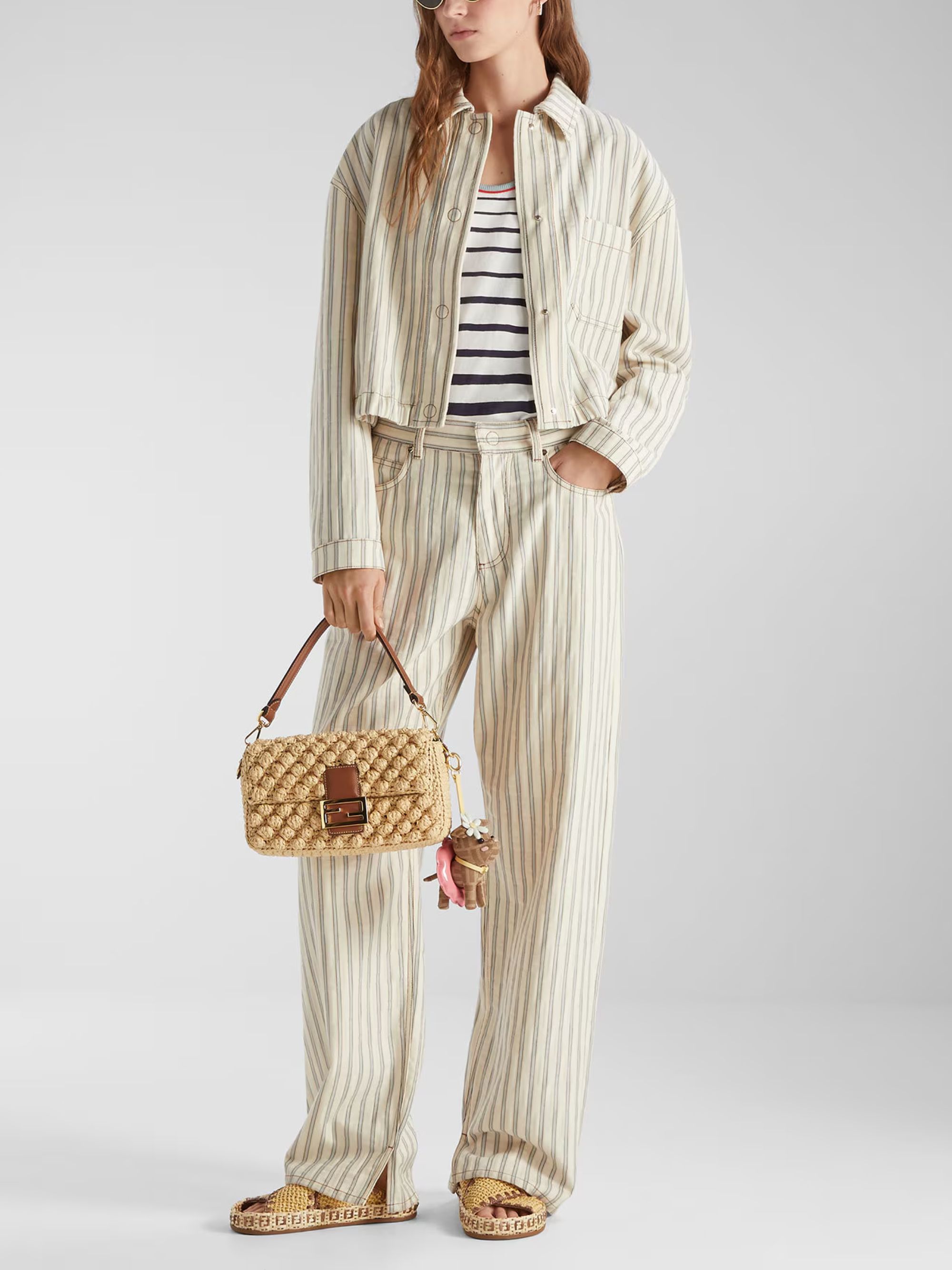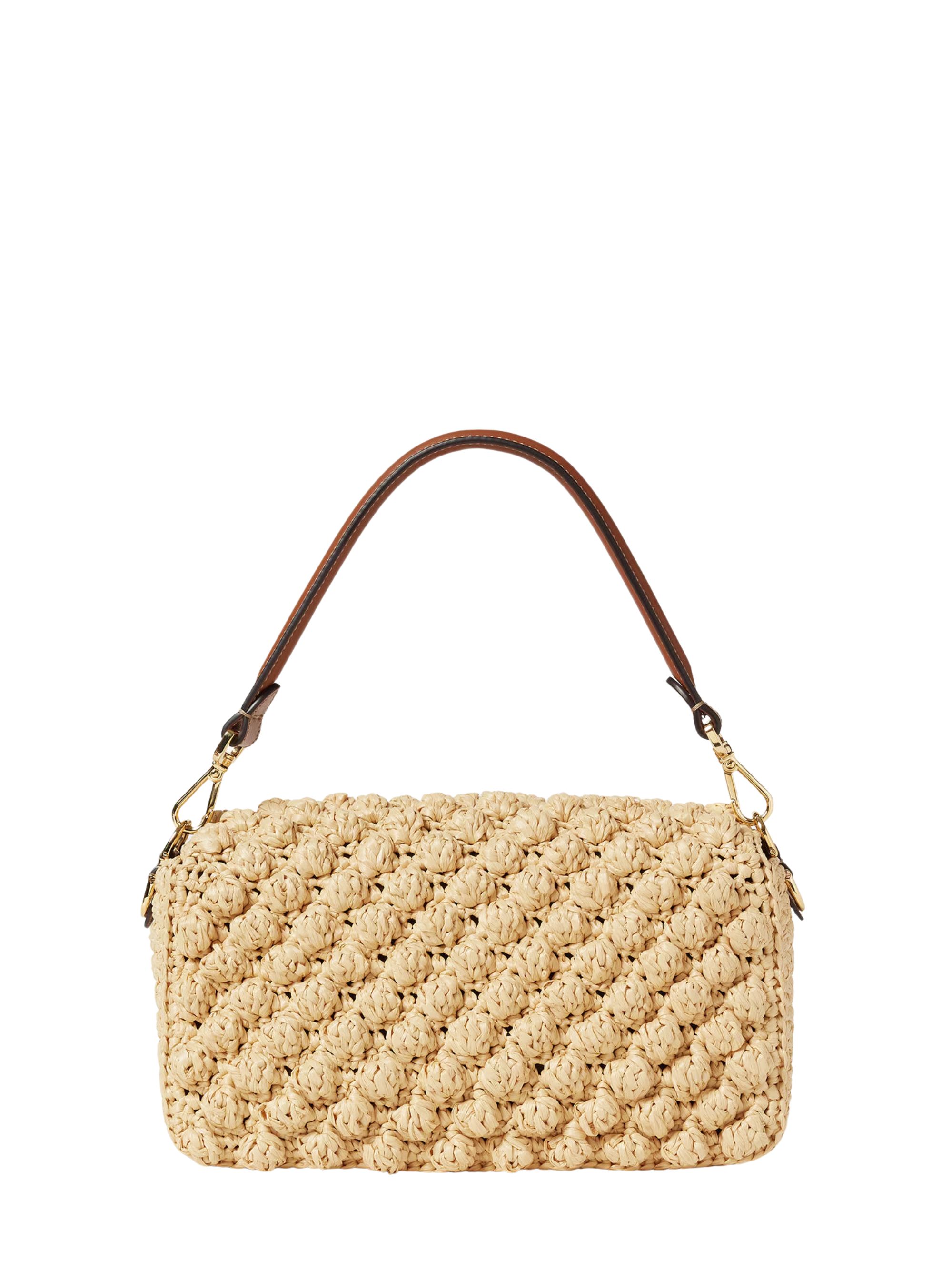 Borsa Baguette di FENDI beige in rafia intrecciata tridimensionale realizzata a mano con dettagli in pelle, hardware oro, tracolla e manico in pelle rimovibili e chiusura con bottone magnetico. Dimensioni: 27 x 15 x 6 cm.