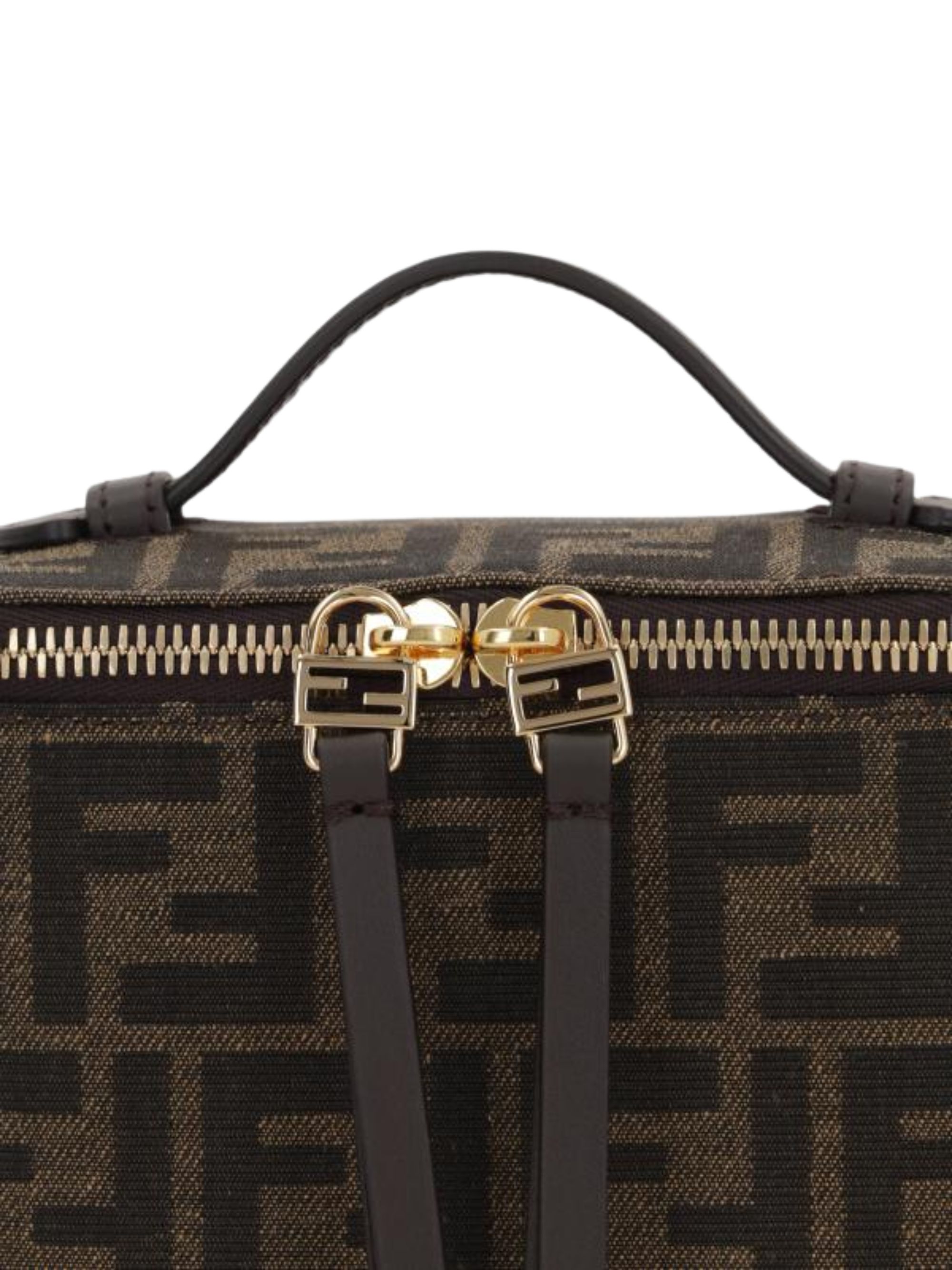 Borsa Vanity di FENDI marrone in tessuto jacquard, caratterizzata da motivo FF all-over, chiusura con zip a doppio cursore, tasca porta carte, hardware oro e tracolla rimovibile in catena e pelle. Dimensioni: 16 x 11 x 8 CM.