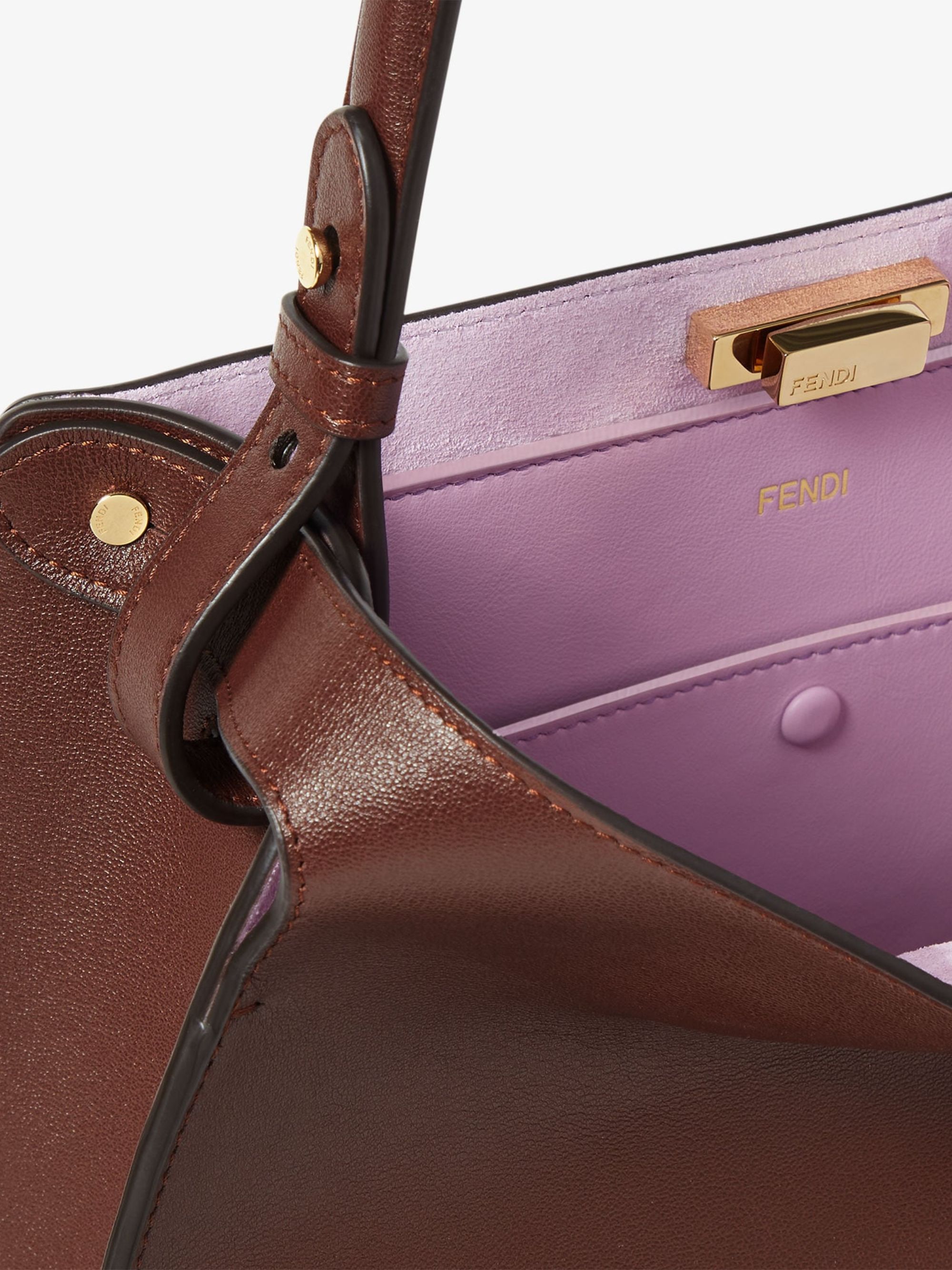 Borsa Way Medium di FENDI marrone in pelle semilucida, dotata di uno scompartimento interno foderato in camoscio lilla, tasca interna in pelle tono su tono, hardware oro, anello per charm e chiusura a girello. Dimensioni: 36 x 27 x 13 cm.