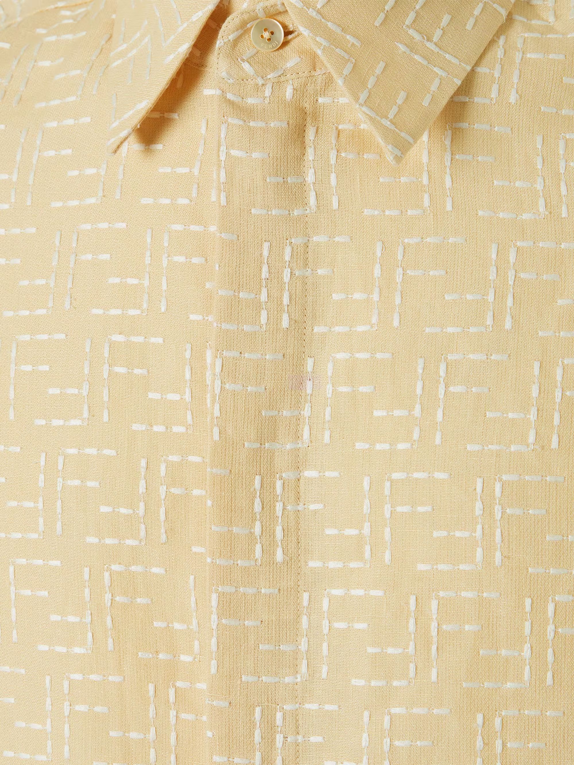 Camicia FF jacquard di FENDI gialla in lino con collo mezzo italiano, maniche corte, linea over e chiusura con bottoni nascosti.
