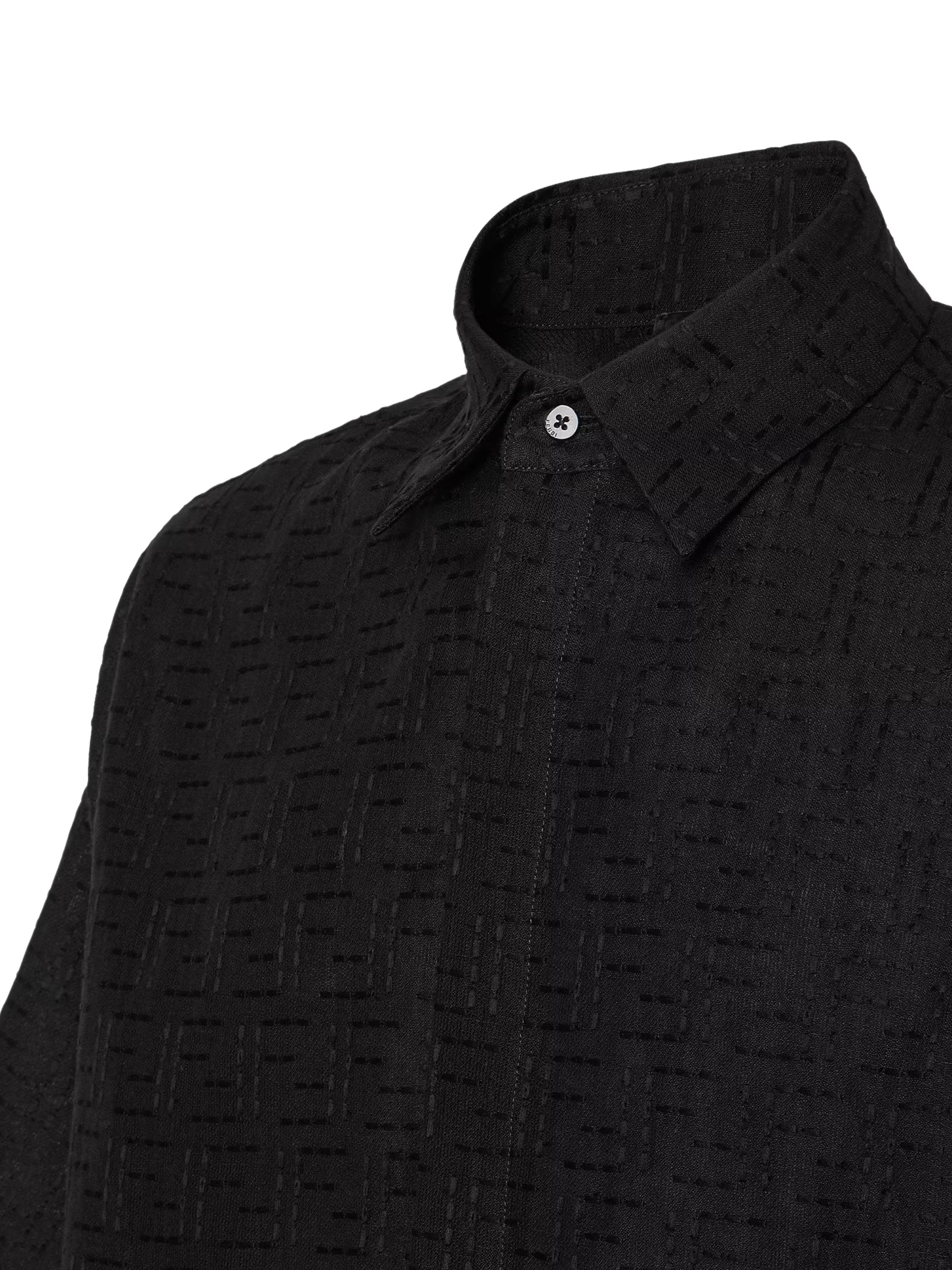 Camicia FF jacquard di FENDI nera in lino con collo mezzo italiano, maniche corte, linea over e chiusura con bottoni nascosti.