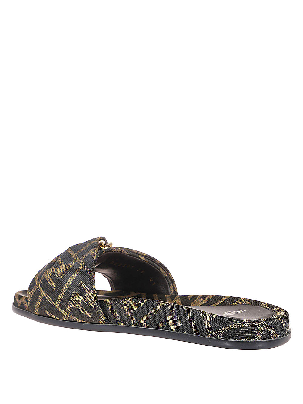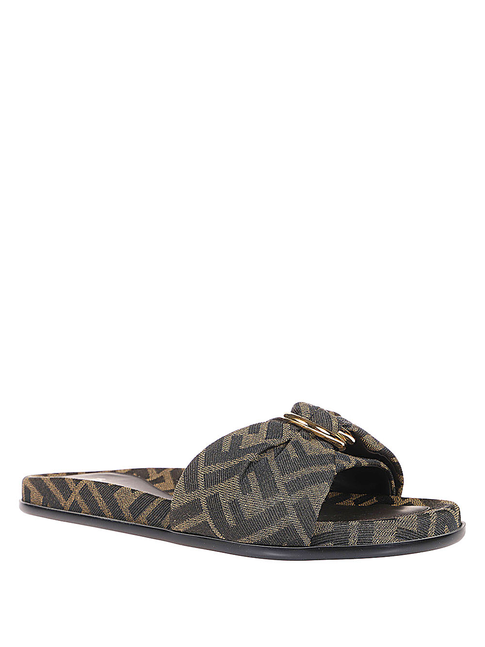 Ciabatta Feel di FENDI marrone in tessuto caratterizzata da iconico motivo FF e accessori metallici dorati.
