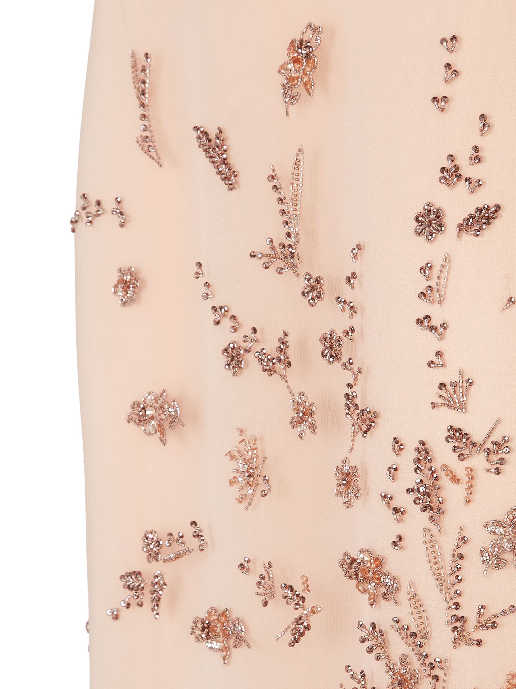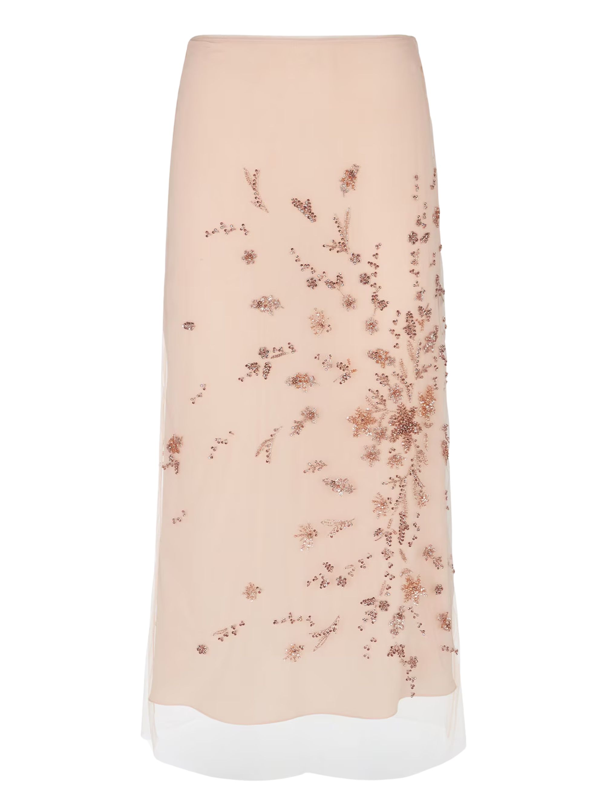 Gonna longuette di FENDI rosa in tulle con ricami con perline e cristalli, sottogonna e chiusura con zip sul fianco.
