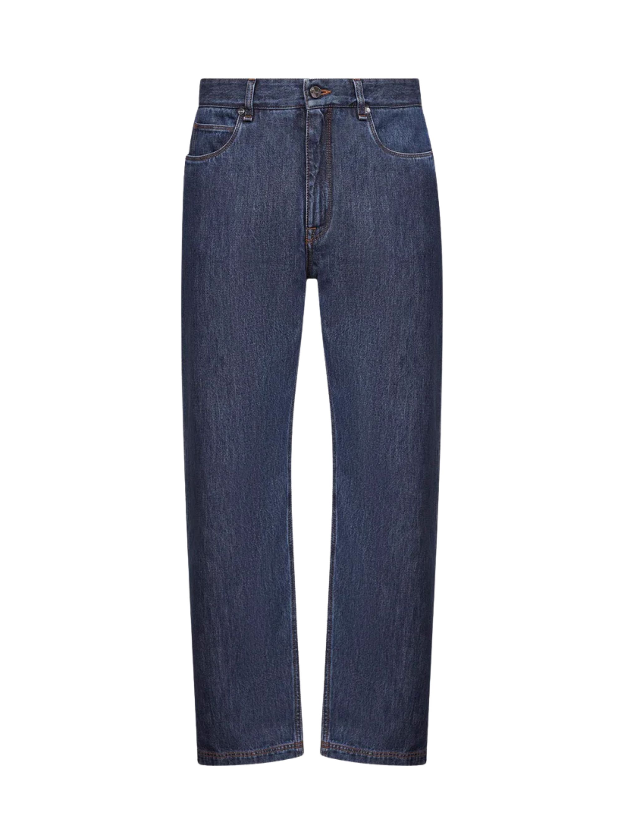 Jeans Lunghi di FENDI blu in cotone, caratterizzato da vita alta, chiusura con bottone e zip, tasca posteriore destra leggermente imbottita con motivo FF, rivetti logati, cuciture a contrasto e retrocinghia logato.