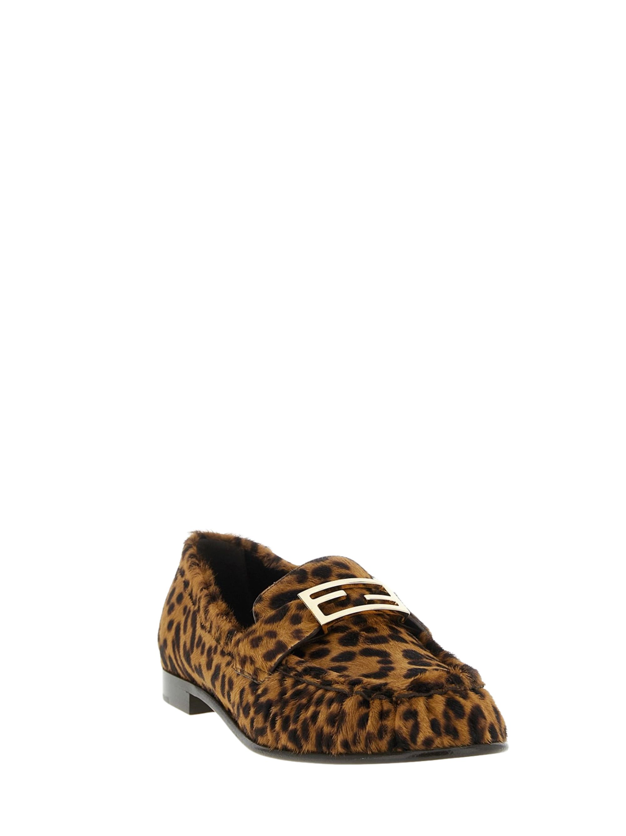 Mocassino effetto cavallino di FENDI marrone in pelle di vitello a pelo con stampa animalier, caratterizzato da vaschetta arricciata, accessorio FF sulla mascherina, suola in cuoio, e accessori metallici con finitura dorata.