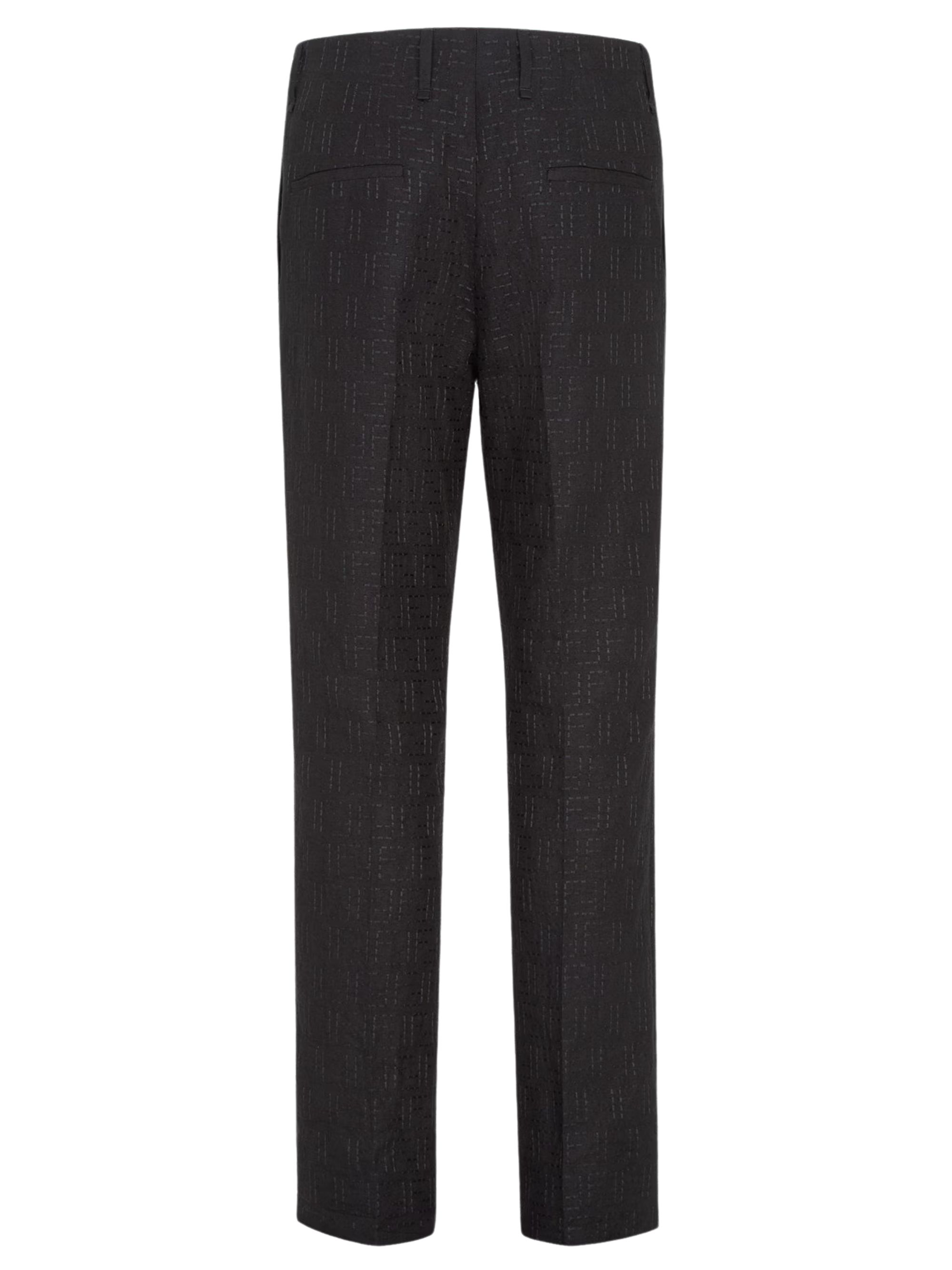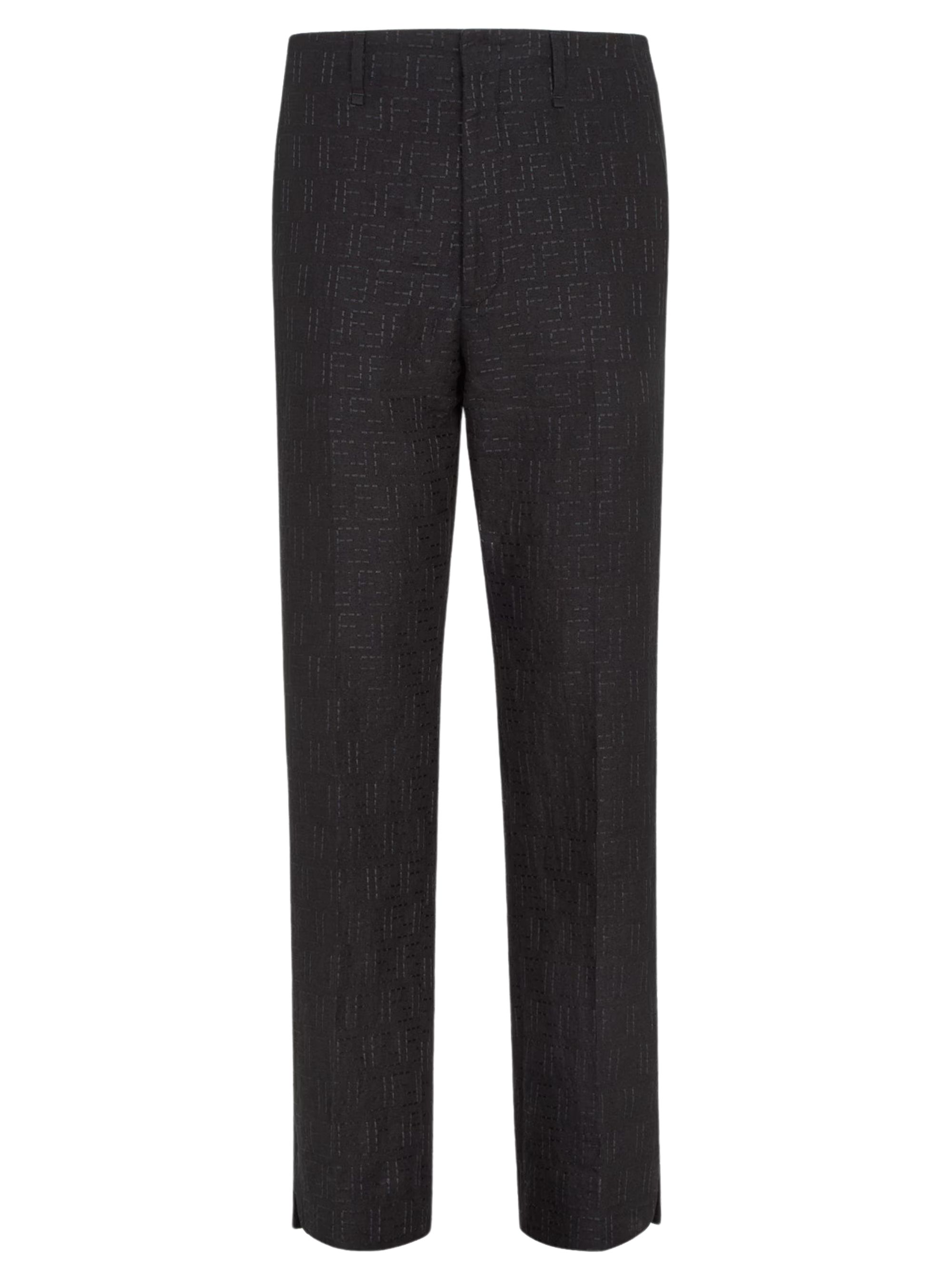 Pantalone in lino di FENDI nero caratterizzato da linea dritta sartoriale, passanti per cintura in vita, piega stirata, tasche laterali, tasche a filetto sul retro e chiusura con zip nascosta.