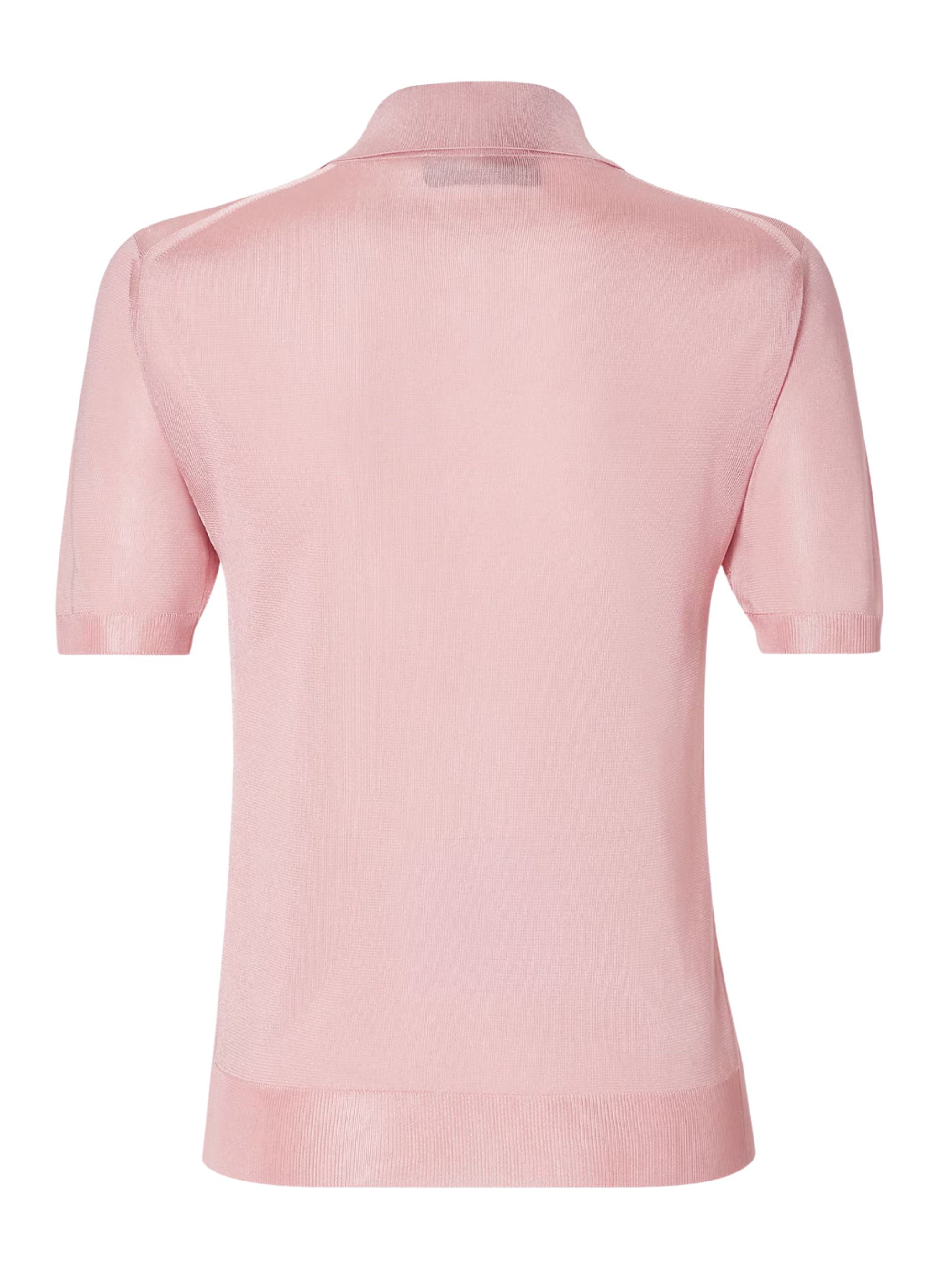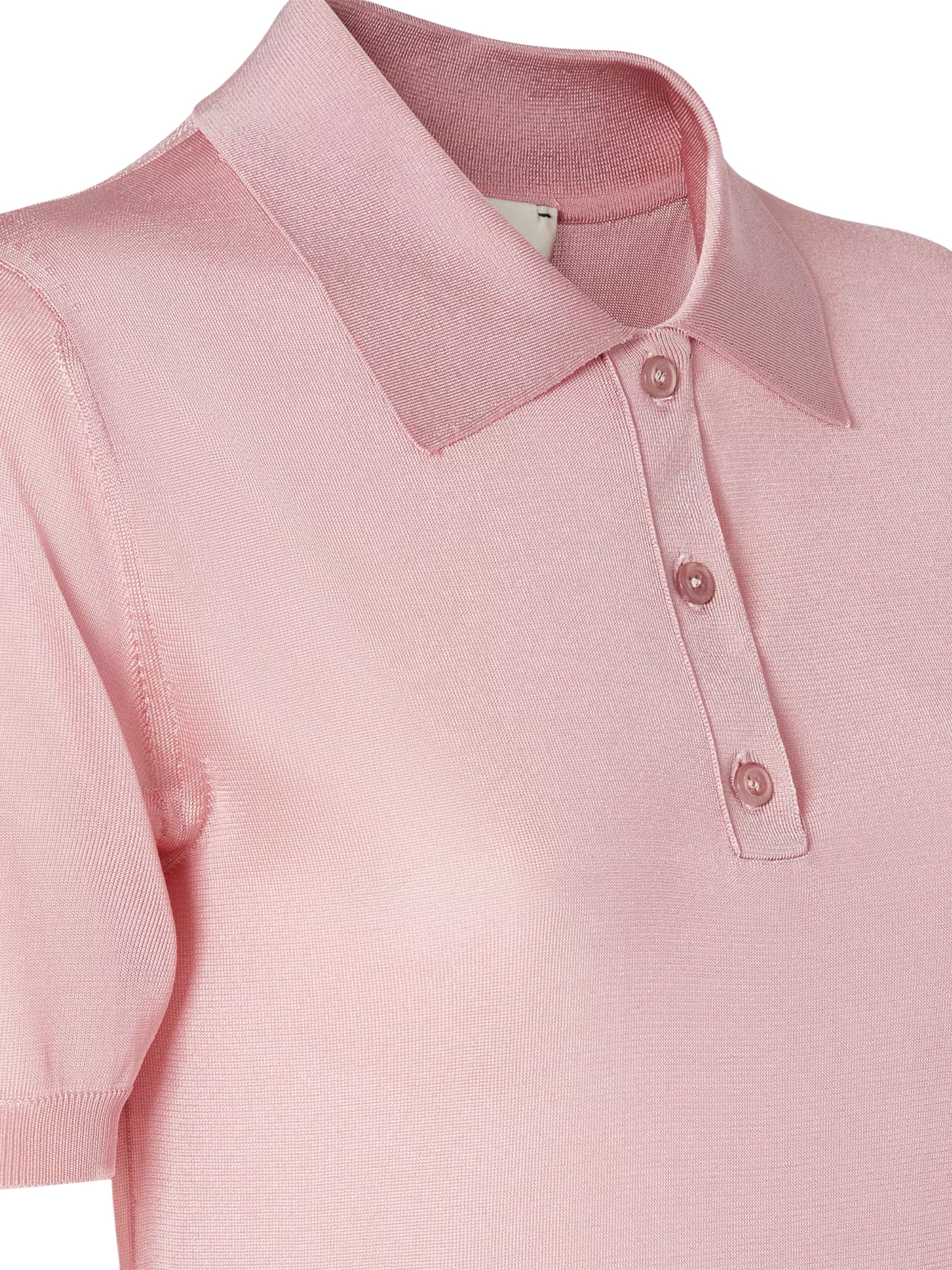 Polo in viscosa lucida di FENDI rosa, caratterizzata da vestibilità aderente, colletto con bottoni, maniche corte e logo Fendi sul petto.