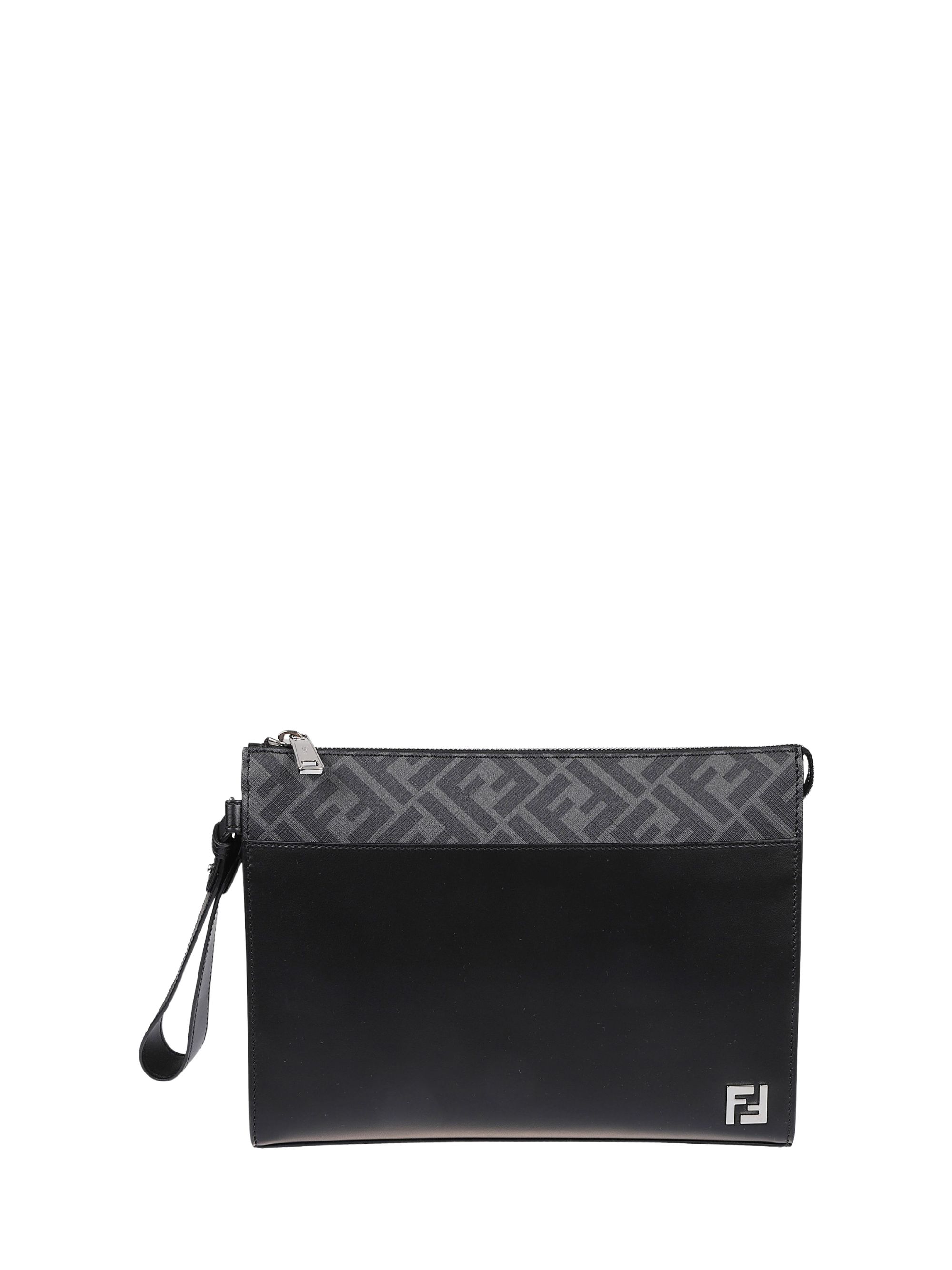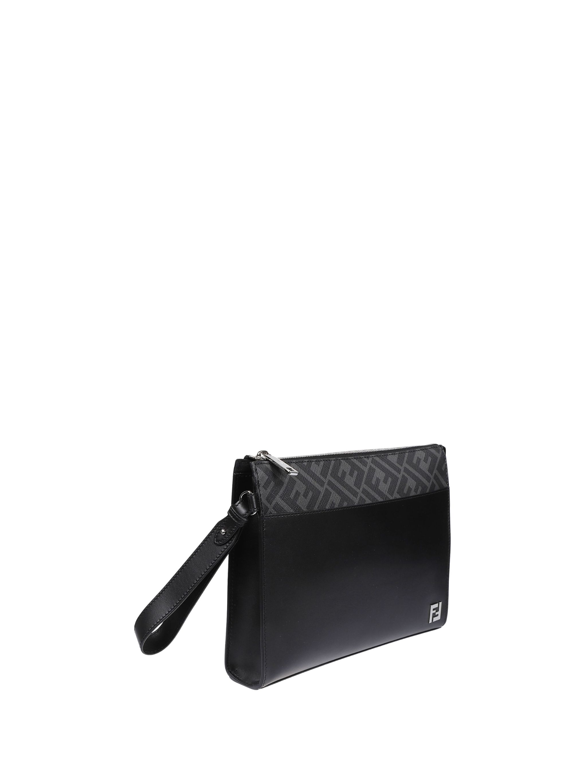 Pouch Squared FF di FENDI nera in pelle e tela FF, caratterizzata da applicazione FF in metallo, chiusura con zip, manico a bracciale rimovibile e accessori metallici con finitura palladio. Dimensioni: 27 x 20 x 6 CM.