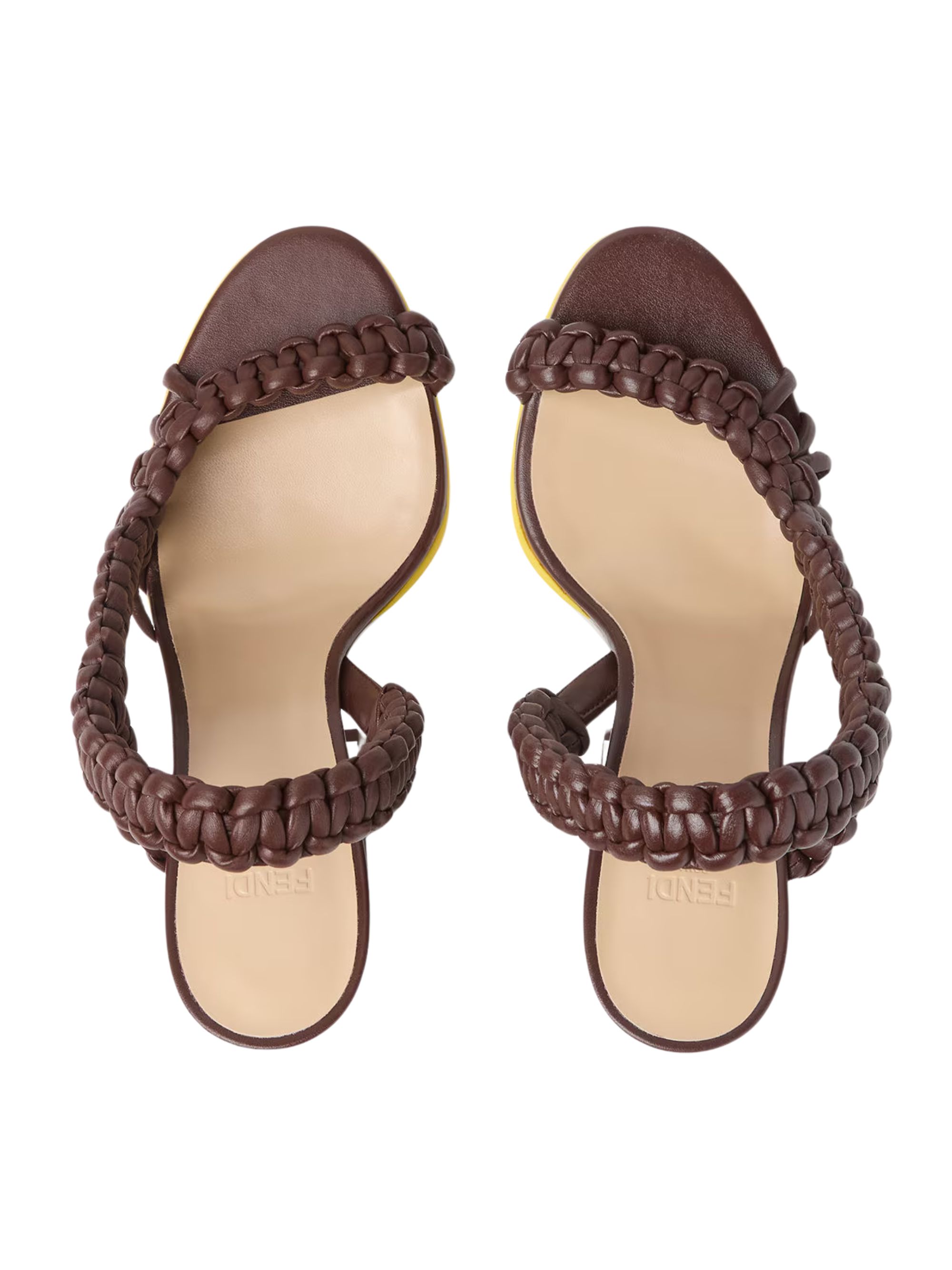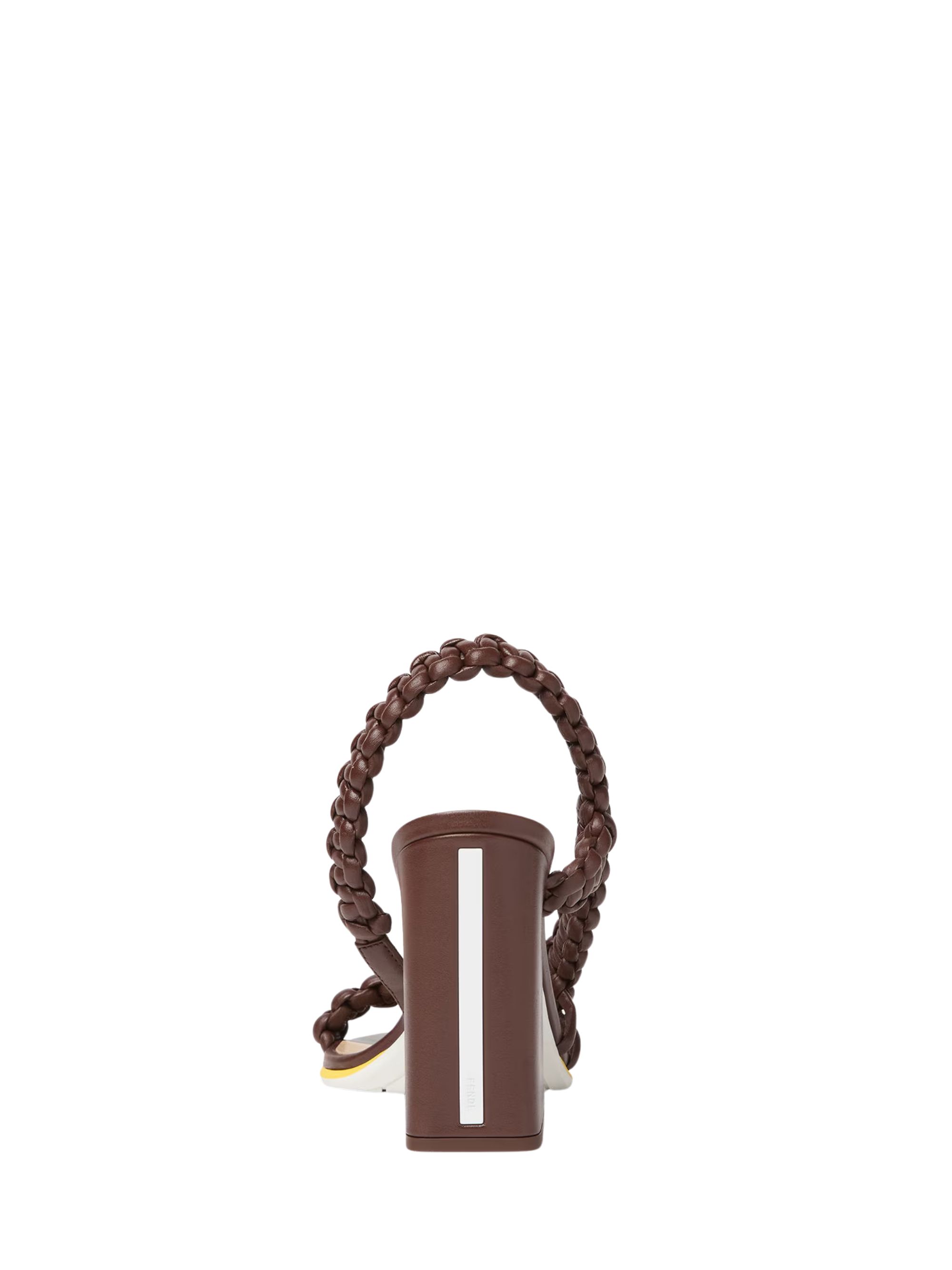 Sandalo Arco di FENDI marrone in pelle, caratterizzato da dettaglio intrecciato, punta aperta, tacco argo, suola in gomma e soletta logata.
