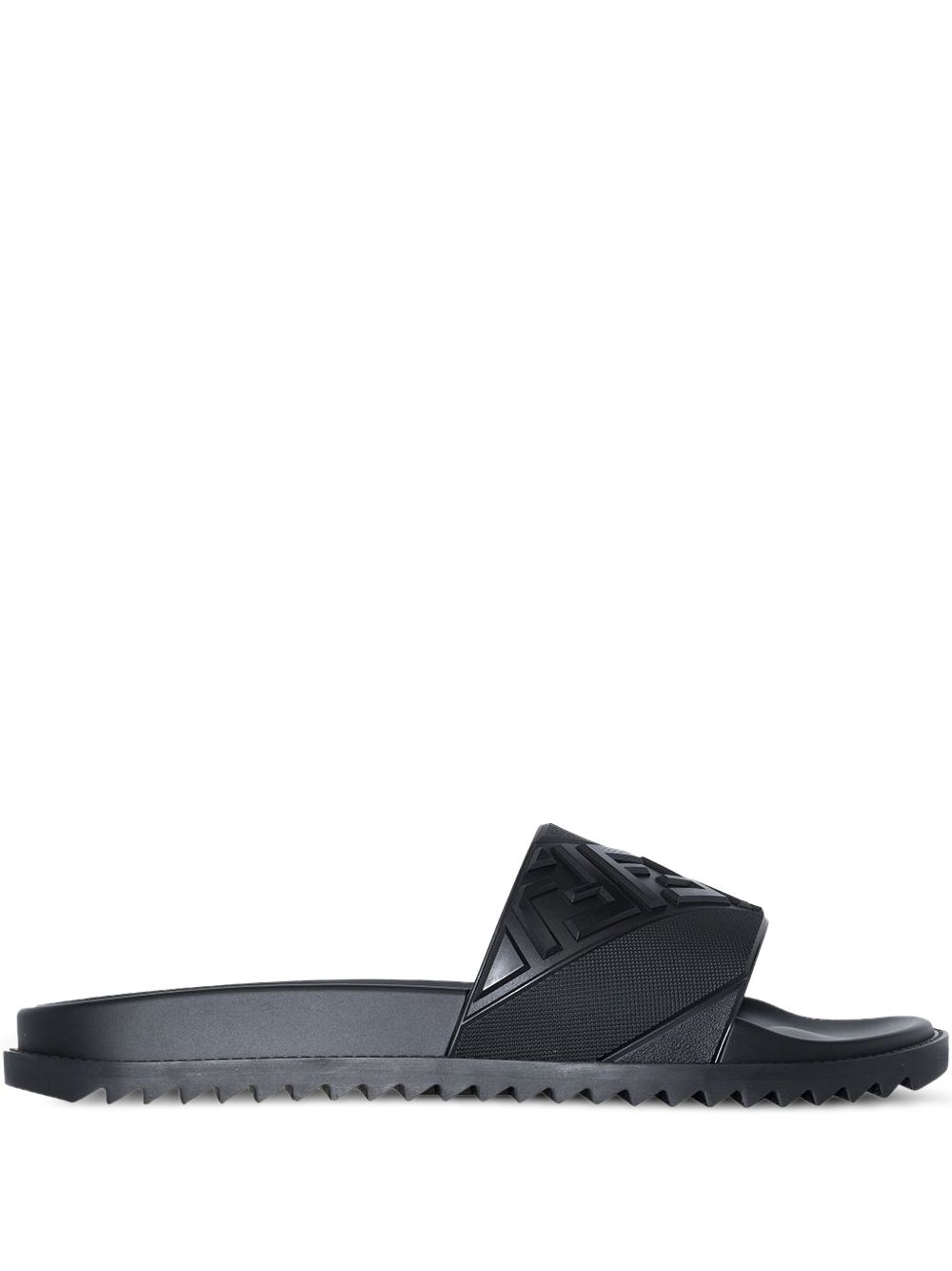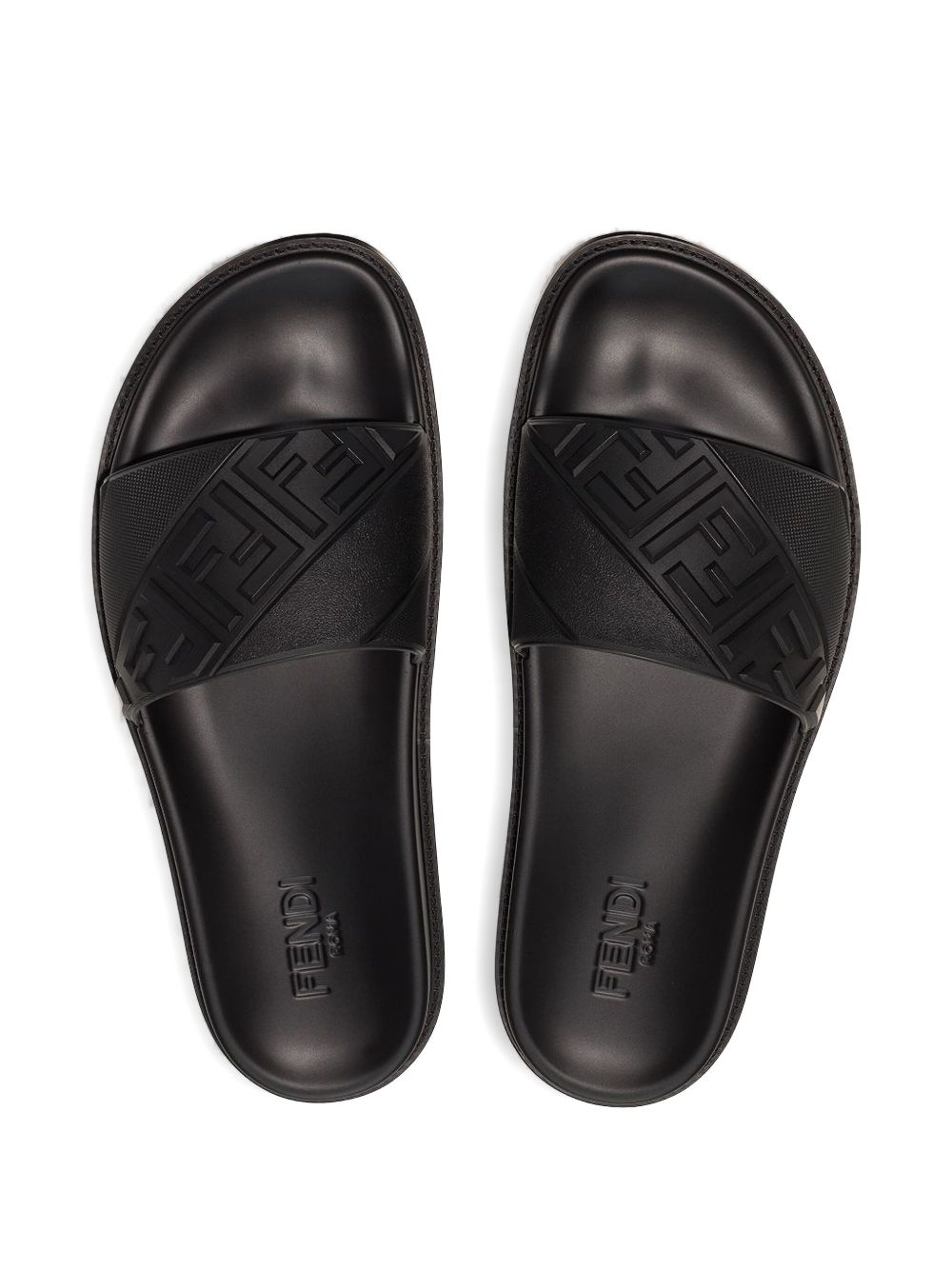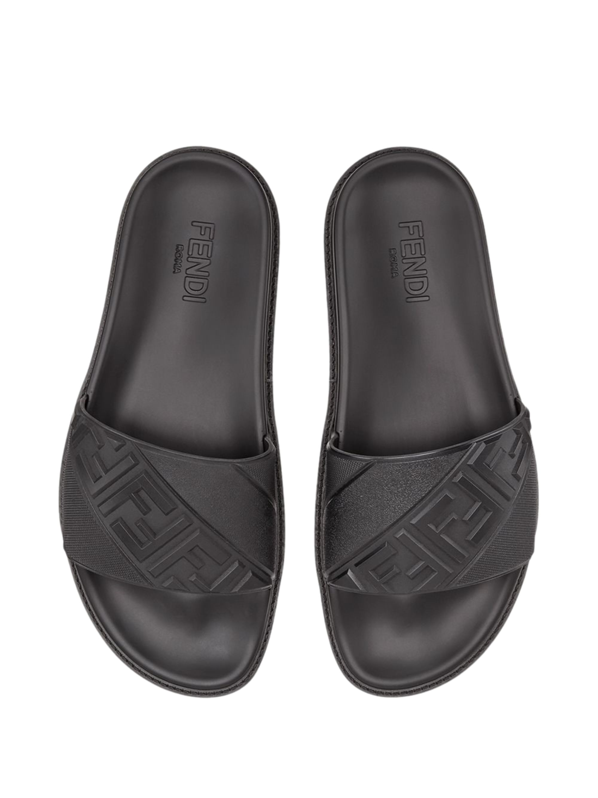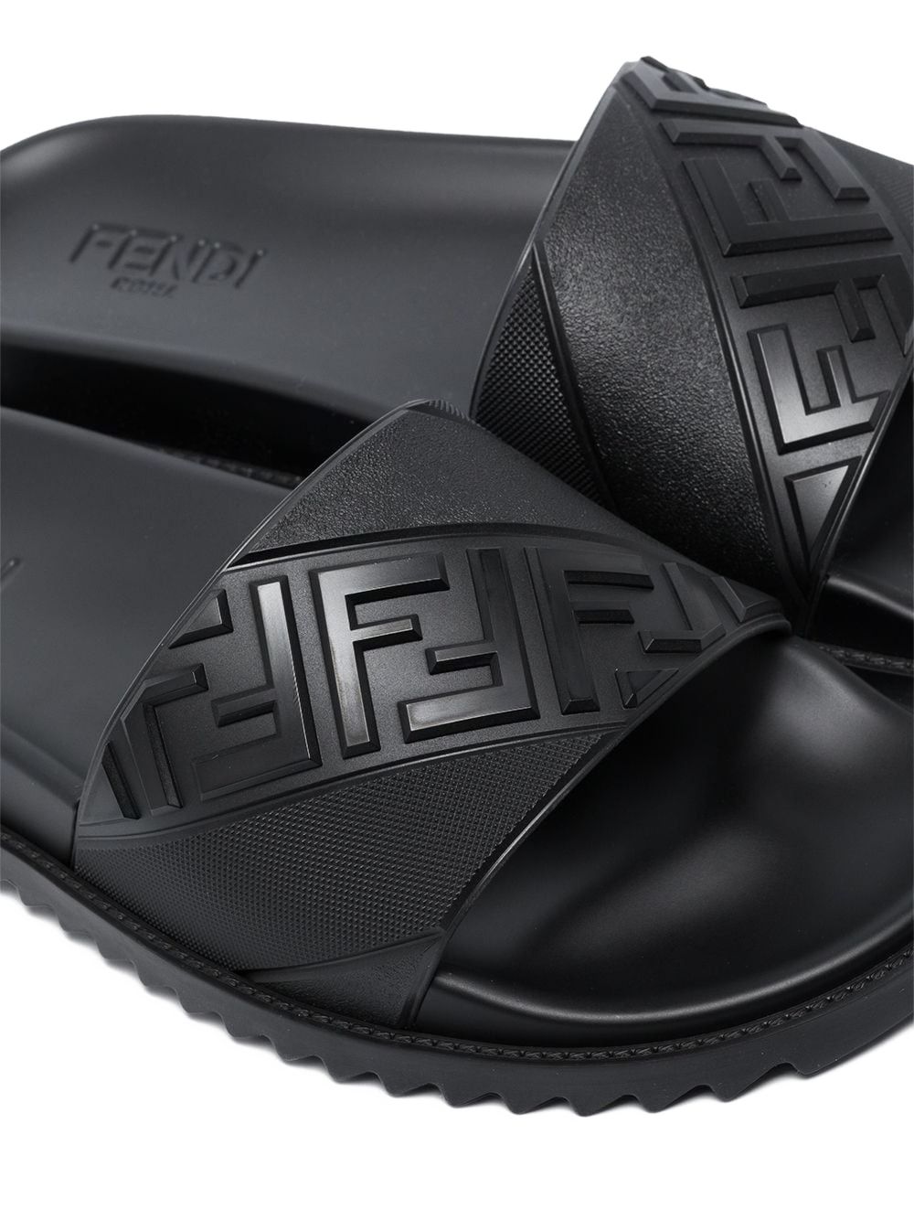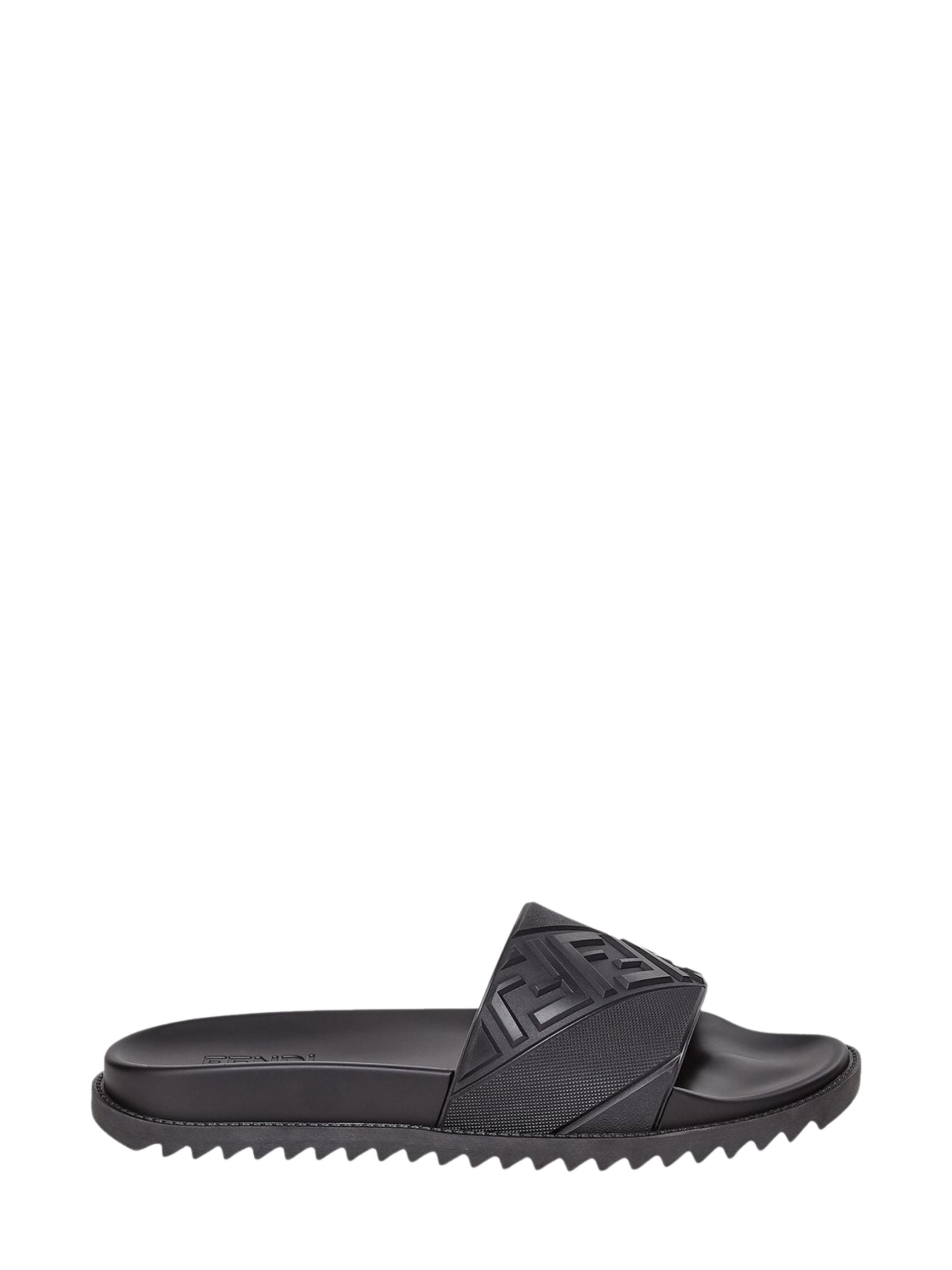 Sandalo con logo di FENDI nero in gomma, caratterizzato da fascia alta con motivo diagonale FF a rilievo, fonde flessibile e suola in gomma antiscivolo.