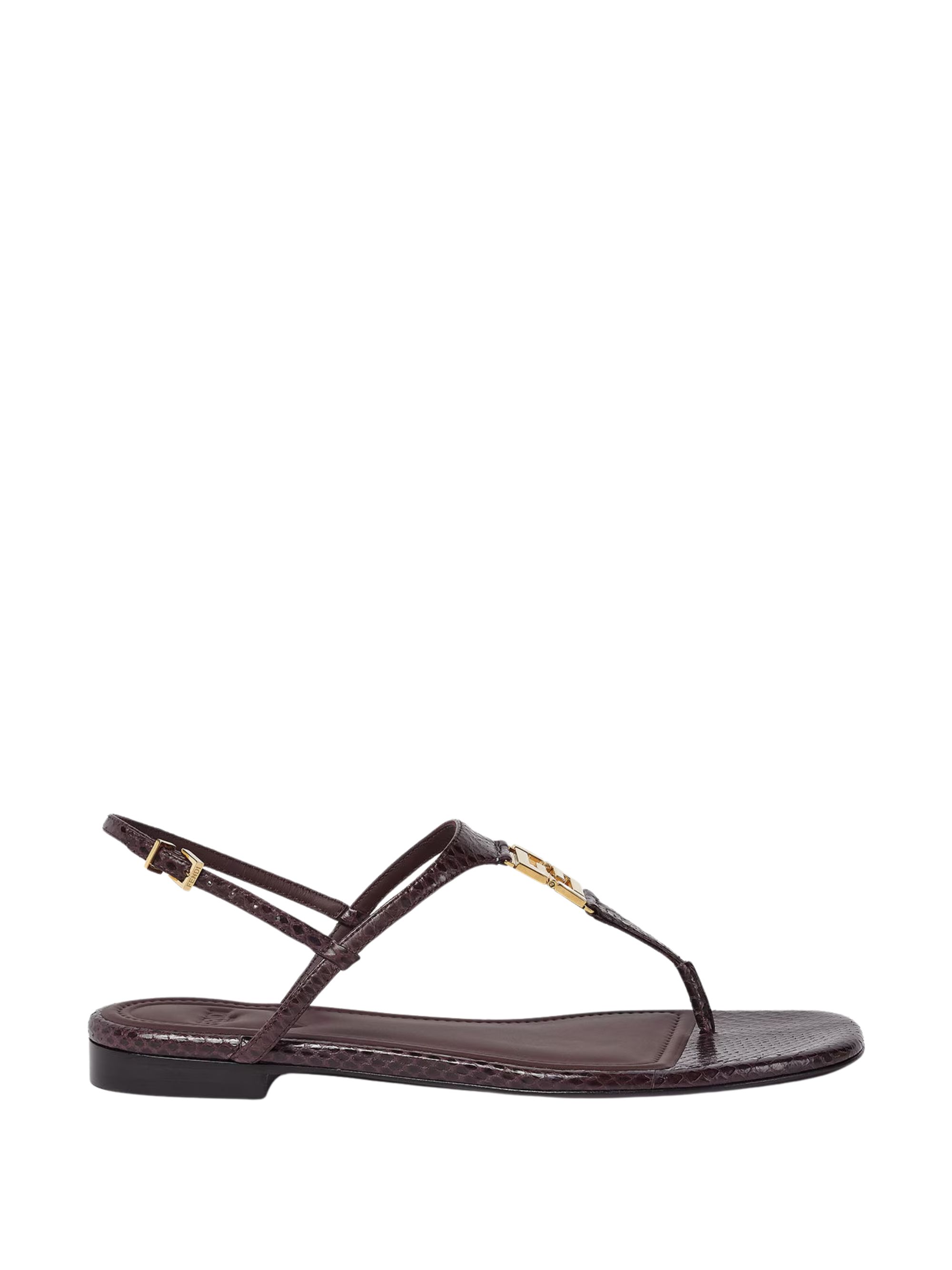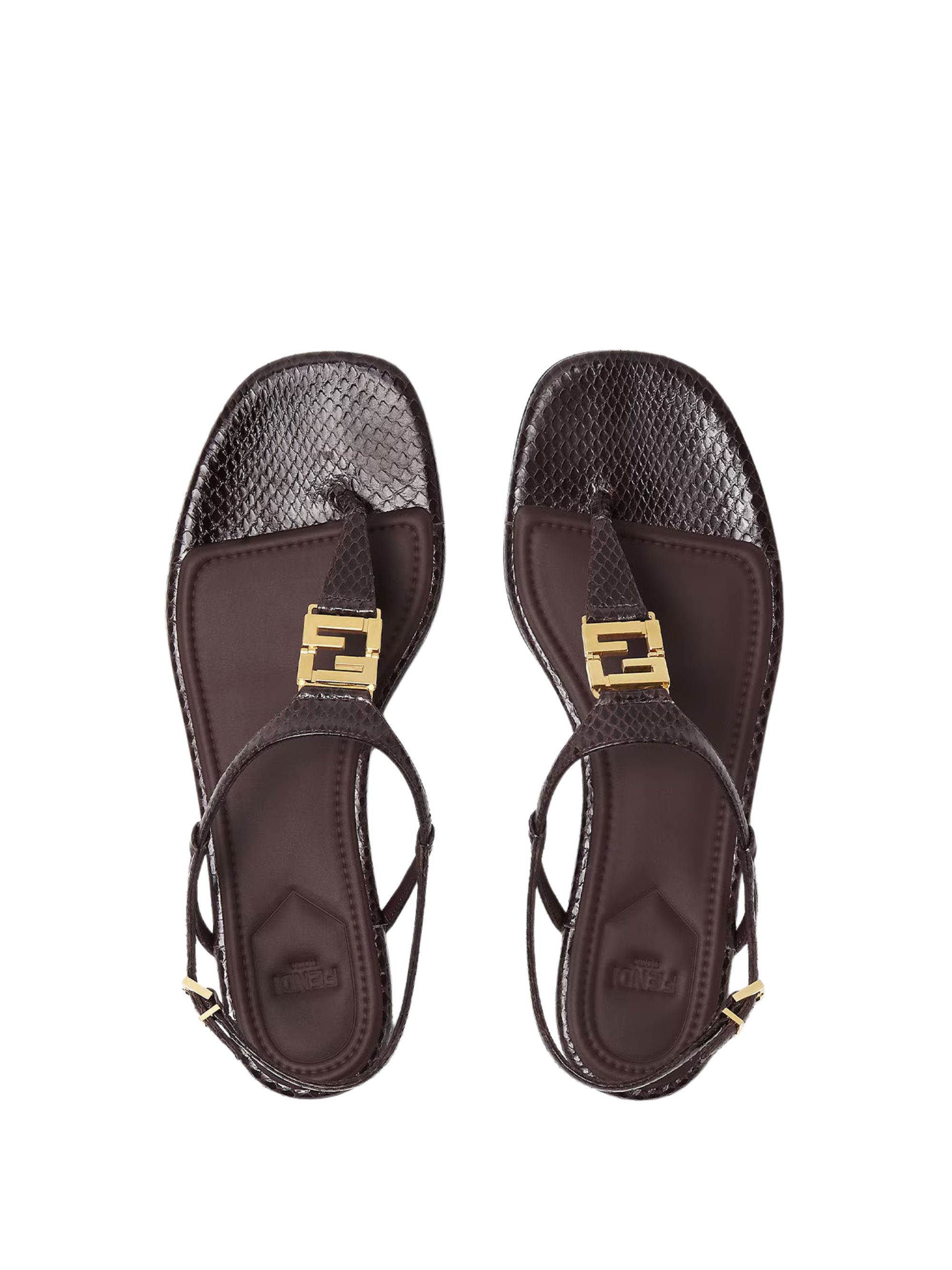 Sandalo Fold di FENDI viola scuro in pelle con accessori metalli dorati con punta squadrata, dettaglio FF in metallo, listino a T e cinturino regolabile alla caviglia.