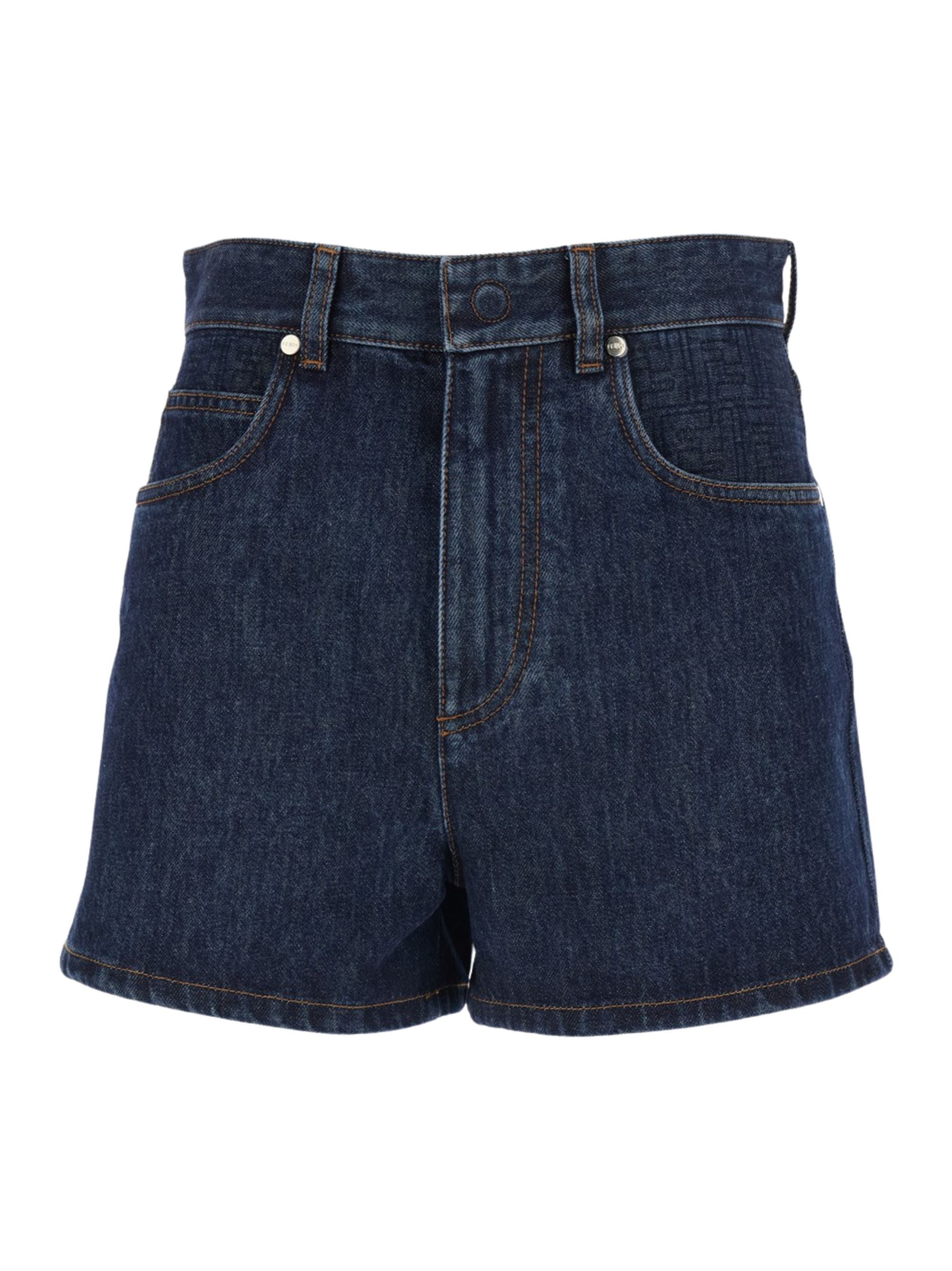 Shorts in denim di FENDI blu in cotone, caratterizzati da passanti per cintura, chiusura con zip e bottone, motivo FF trapuntato sulla tasca sinistra e nelle tasche posteriori, impunture a contrasto e rivetti in metallo.