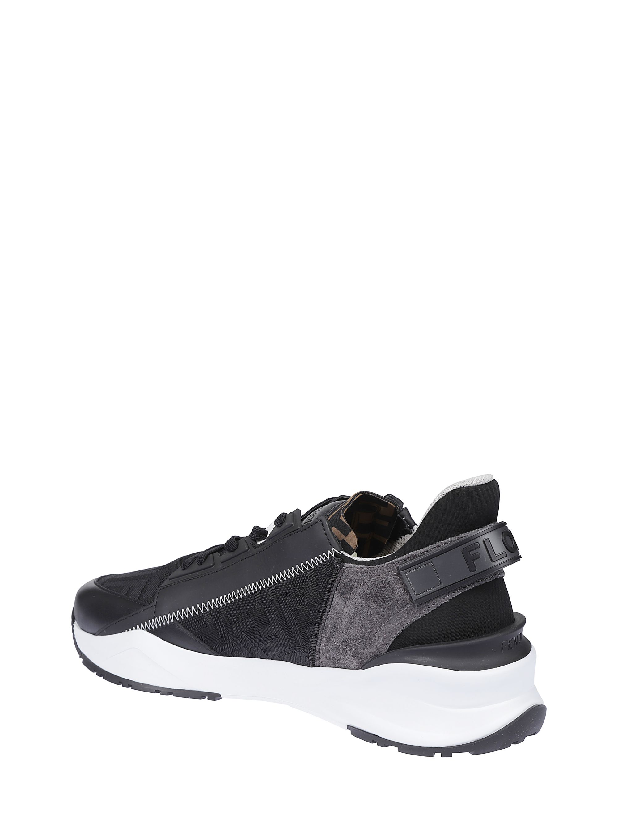 Sneaker Flow di FENDI nera in pelle e suede grigia, Fendi Flow stampato a rilievo sui talloni, zip sul lato e suola ondulata con F intagliata.