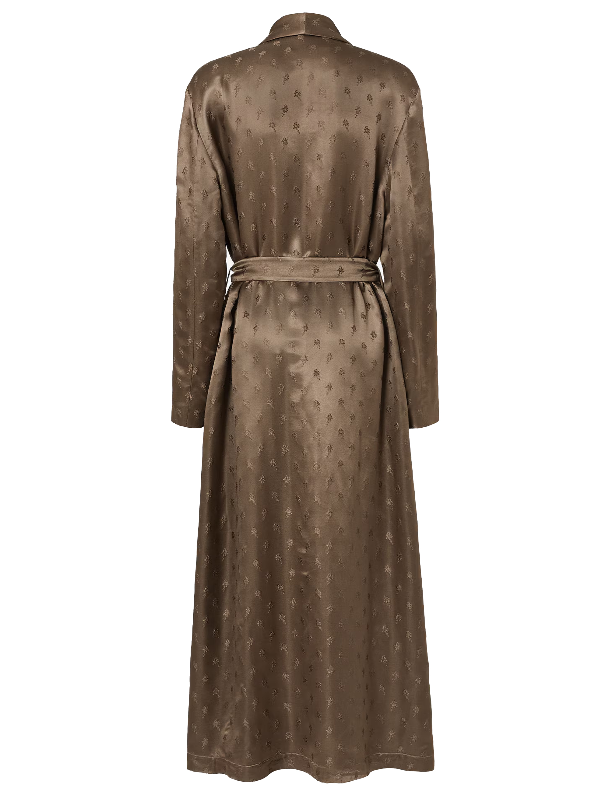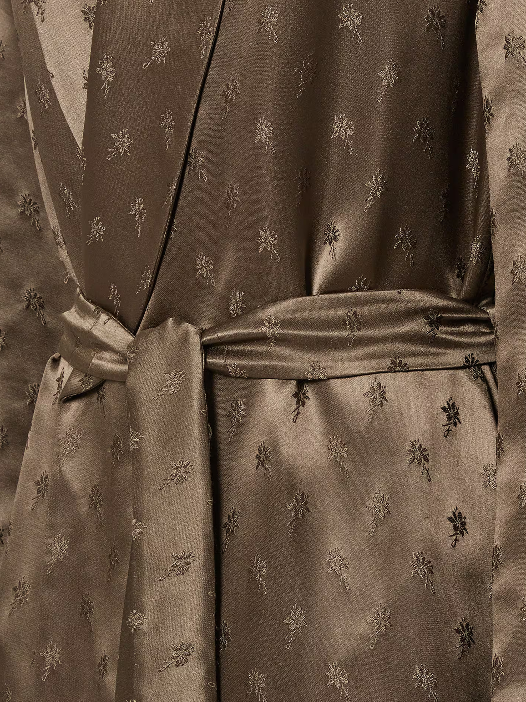 Soprabito in seta di FENDI marrone con collo sciallato, spalla scesa e chiusura con cintura e piccolo bottone.