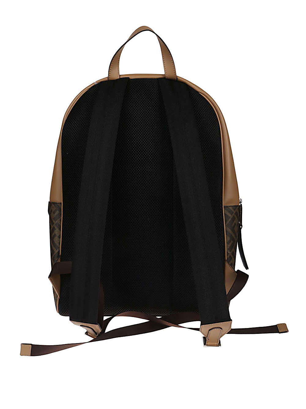 Zaino in tessuto logato di FENDI colore marrone, inserto diagonale in pelle nera e gialla, tasca frontale con chiusura a cerniera, spallacci in rete tecnica, maniglia e cinghie regolabili.