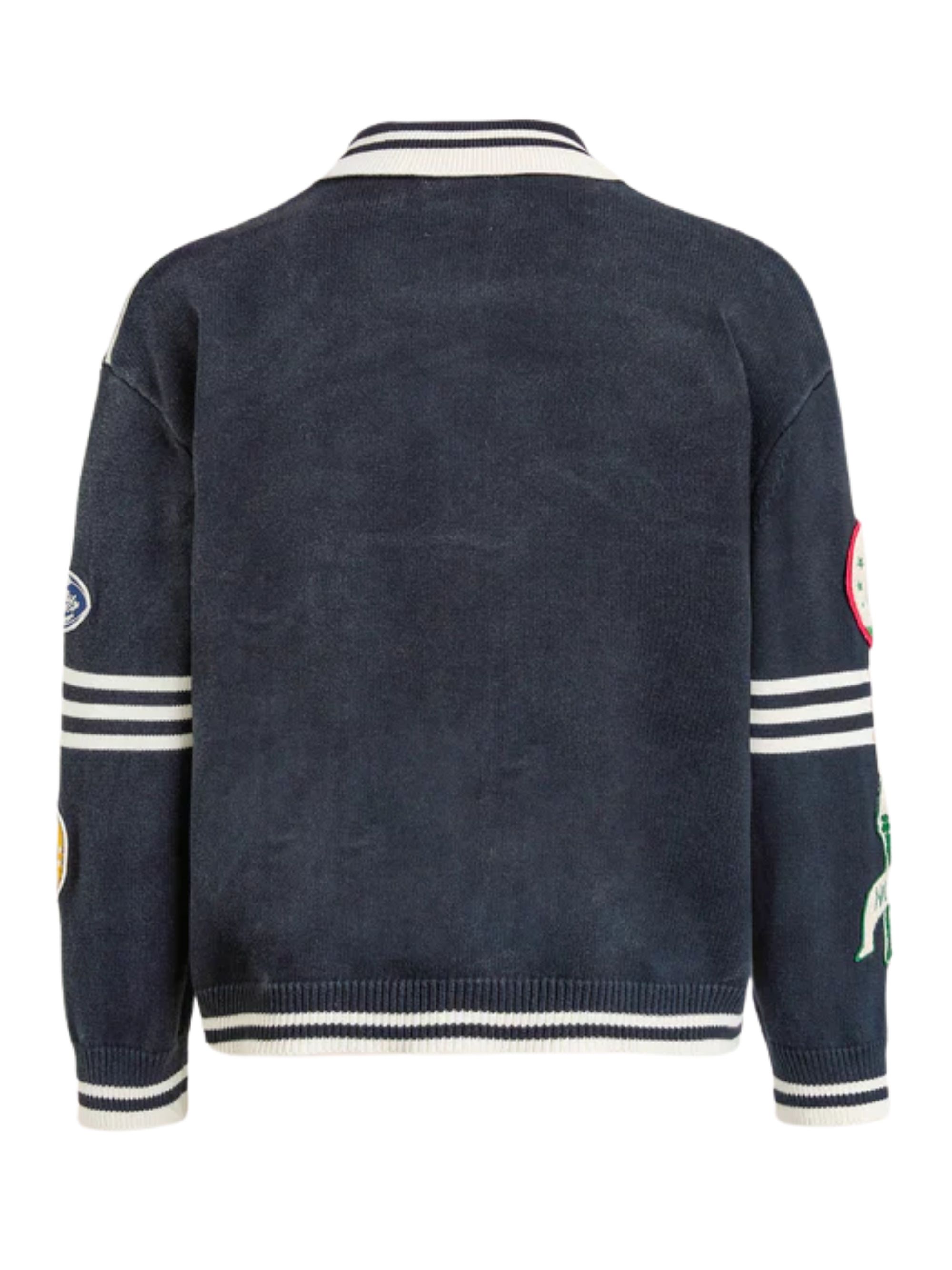 Cardigan Fin Varsity di FOUND nero in cotone con effetto used e délavé, con patch in spugna, colletto a camicia, tasca e chiusura con bottoni.