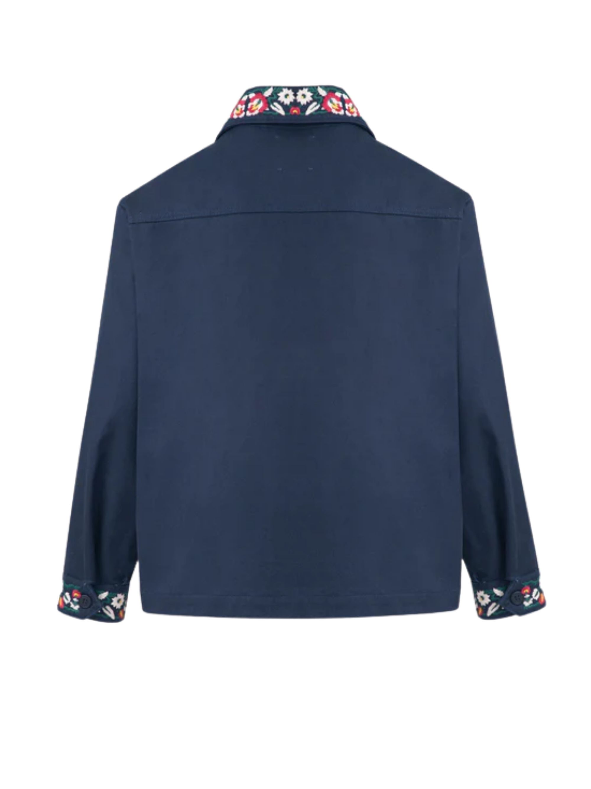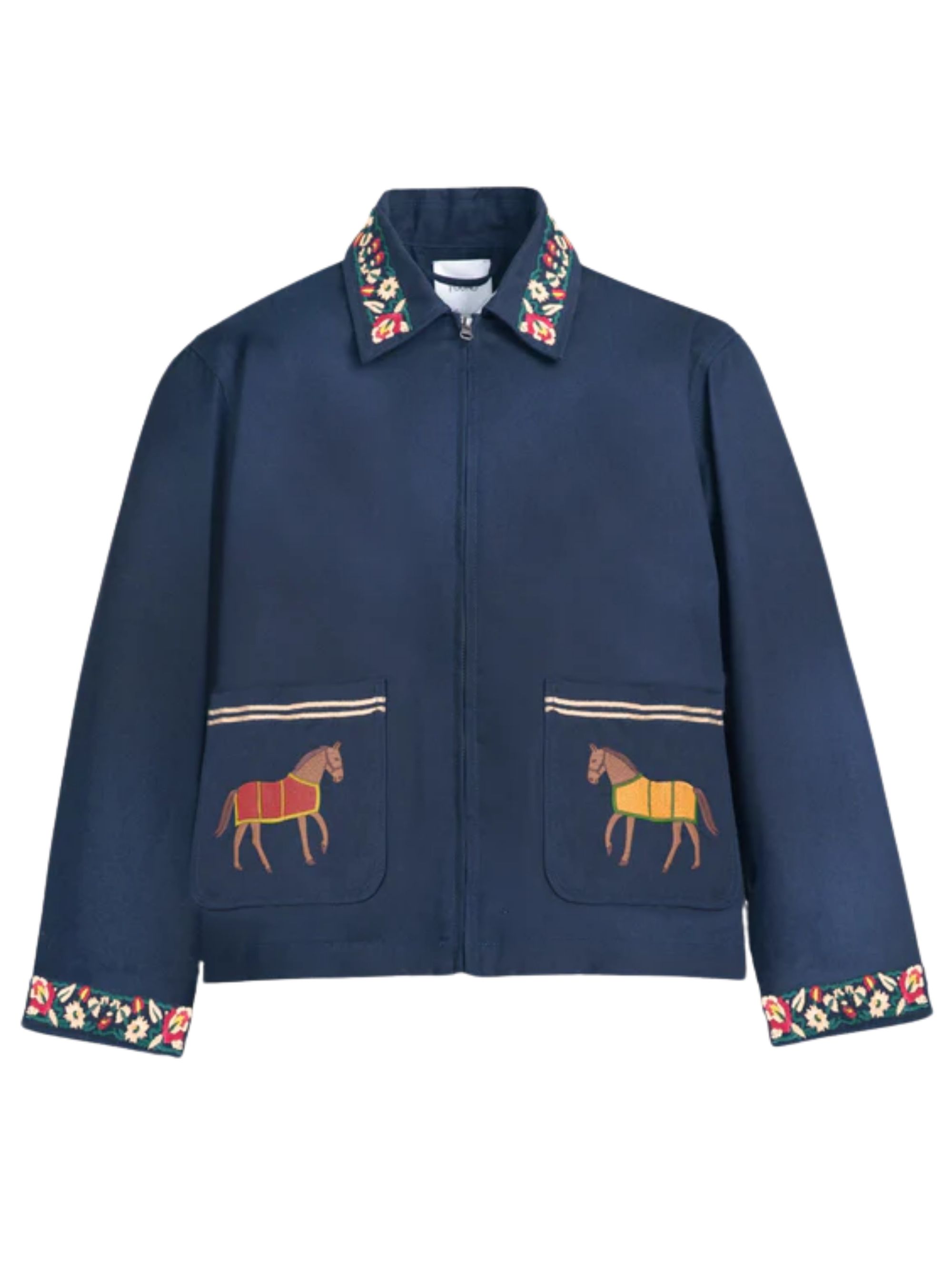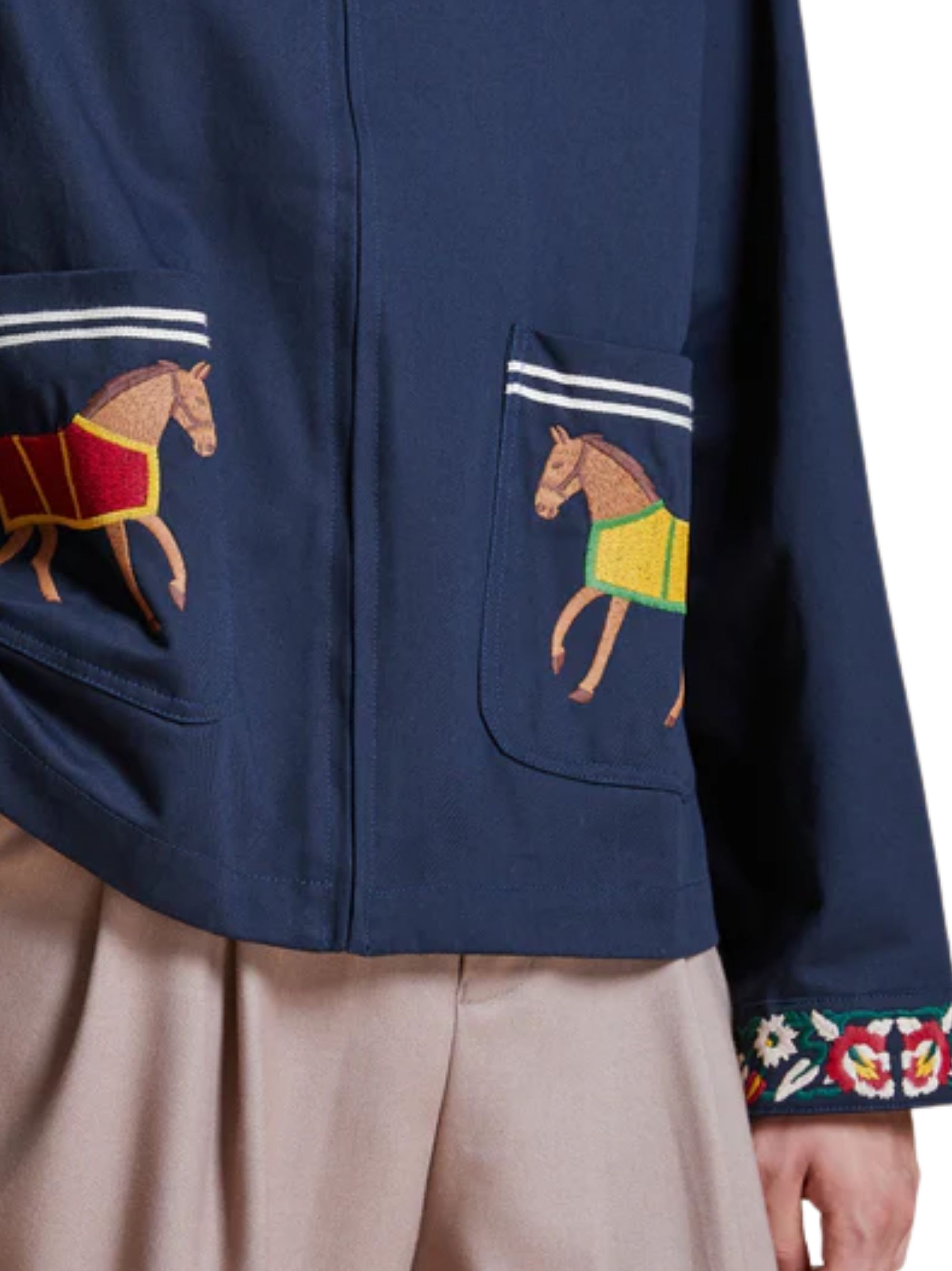 Giacca Horse Equine di FOUND blu in twill di cotone di alta qualità, sfoderata, ricami e decorazioni in gros-grain all-over, colletto classico, tasche, spalla scesa e chiusura con zip frontale.