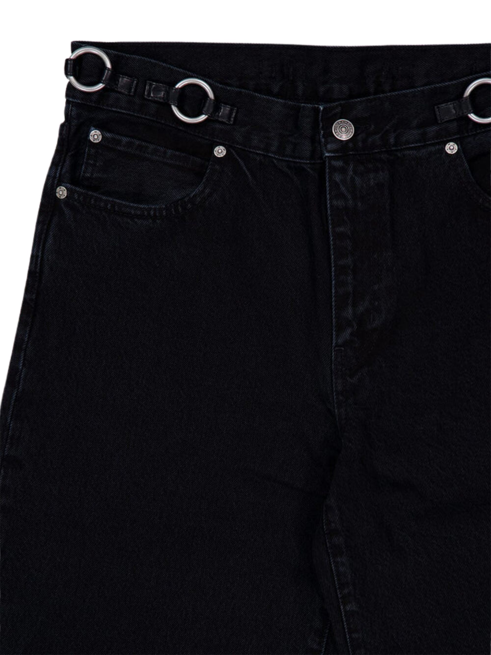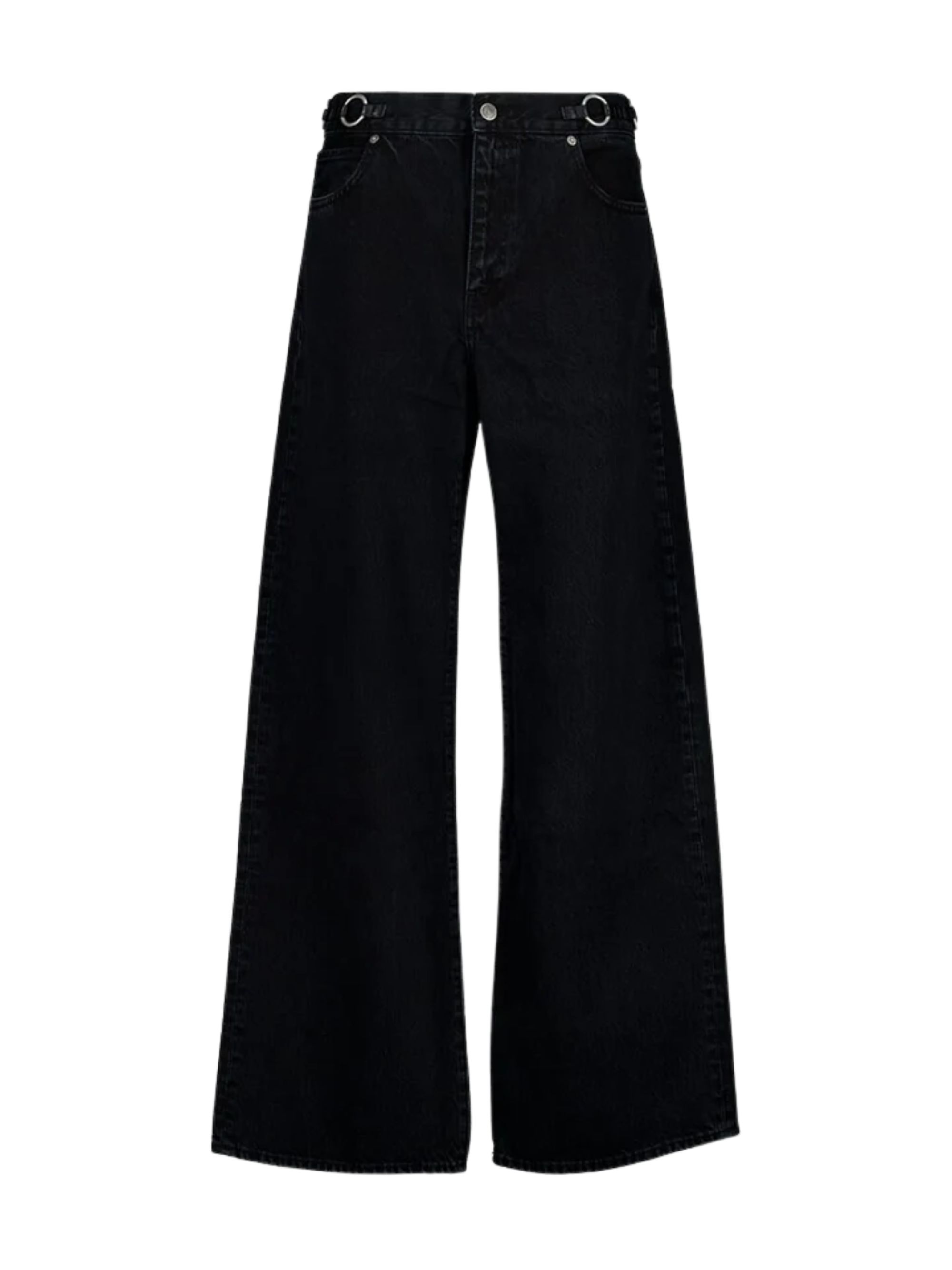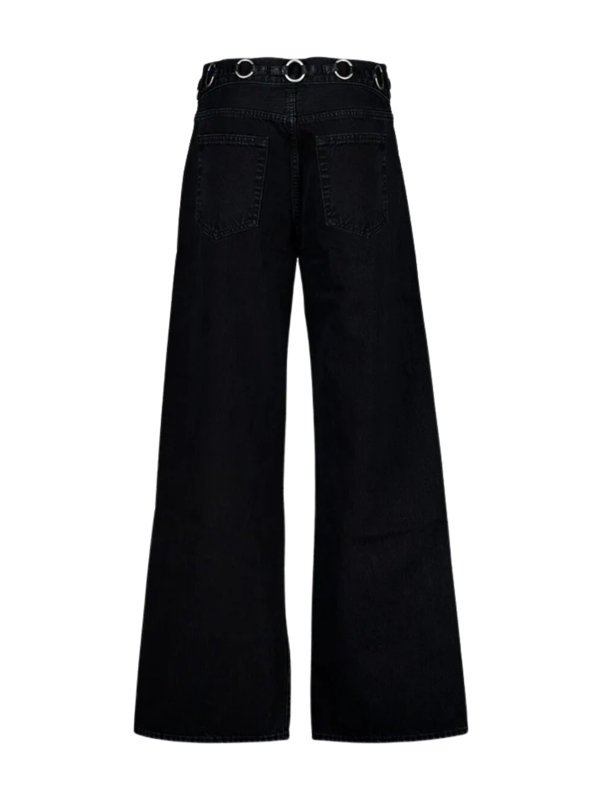 Jeans Sutro O-Ring Stroll di FRAME nero in cotone, caratterizzato da accenti metallici ad anello in vita, gamba larga, 5 tasche, passanti per cintura e chiusura con zip e bottone.
