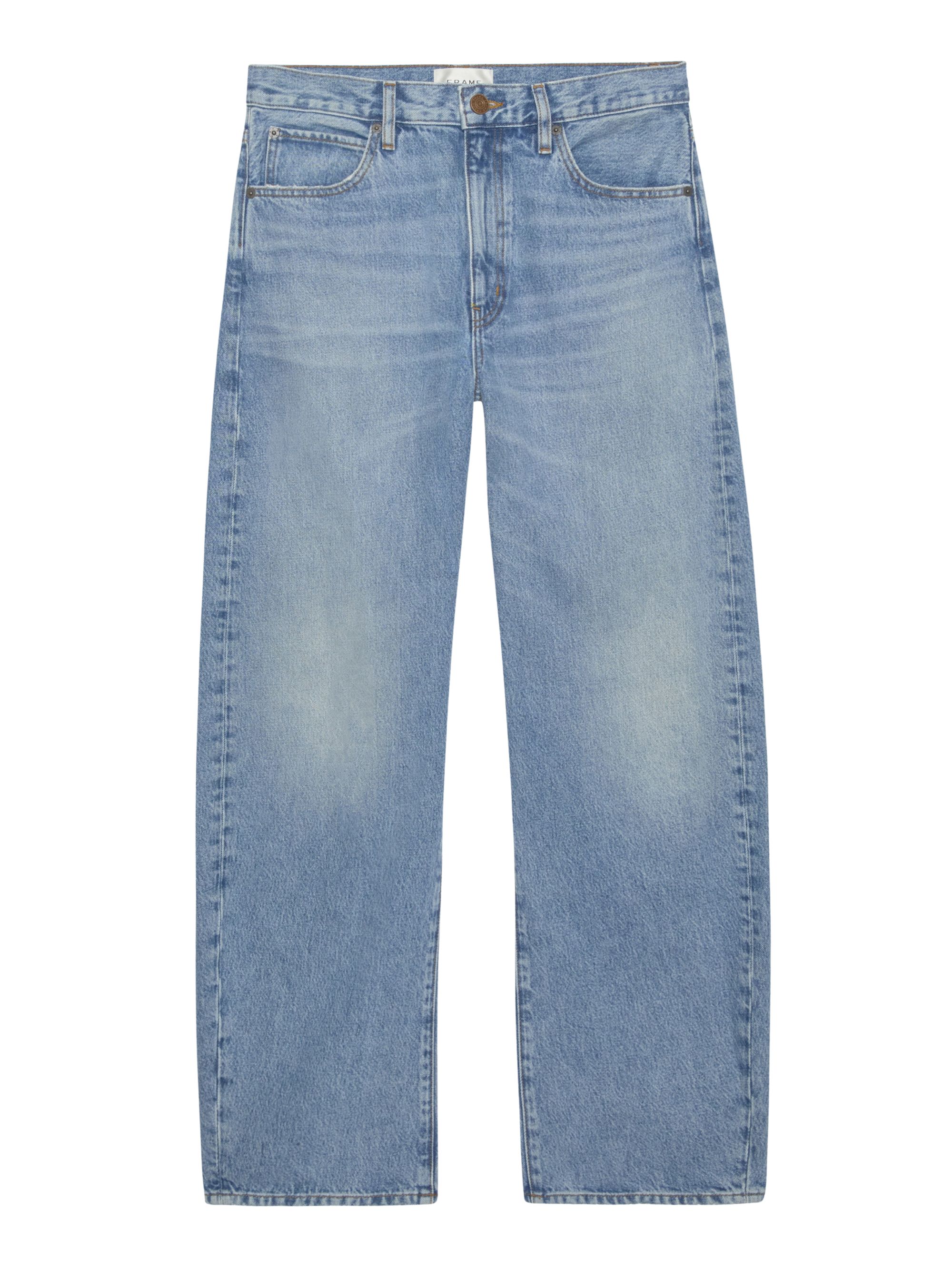 Jeans The Vertical Crop di FRAME azzurro in cotone, caratterizzato da vita alta, gamba dritta e rilassata, chiusura con zip e bottone, due tasche laterali e due posteriori e passanti cintura.