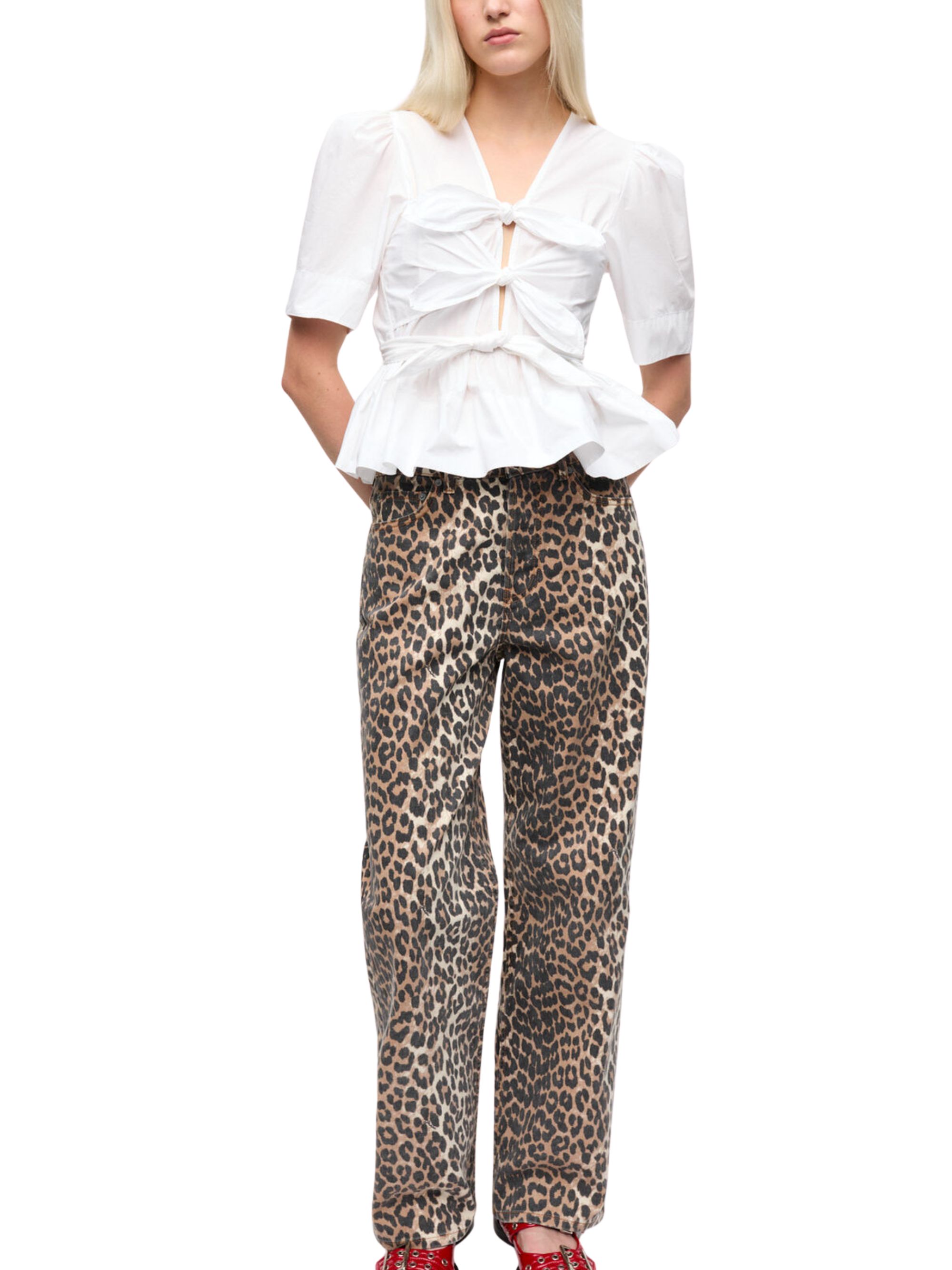 Camicia con nodi di GANNI bianca in cotone, caratterizzata da scollo a V, chiusura con nodo, maniche corte, vita peplum e cintura.