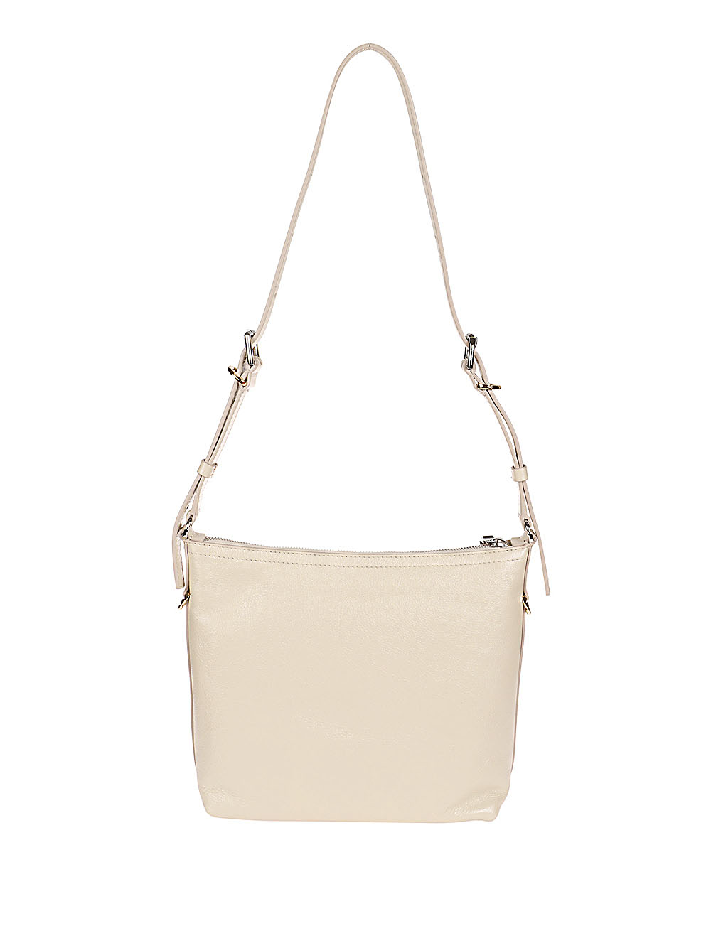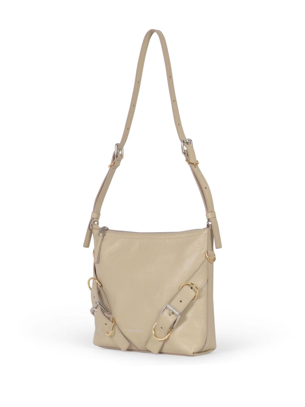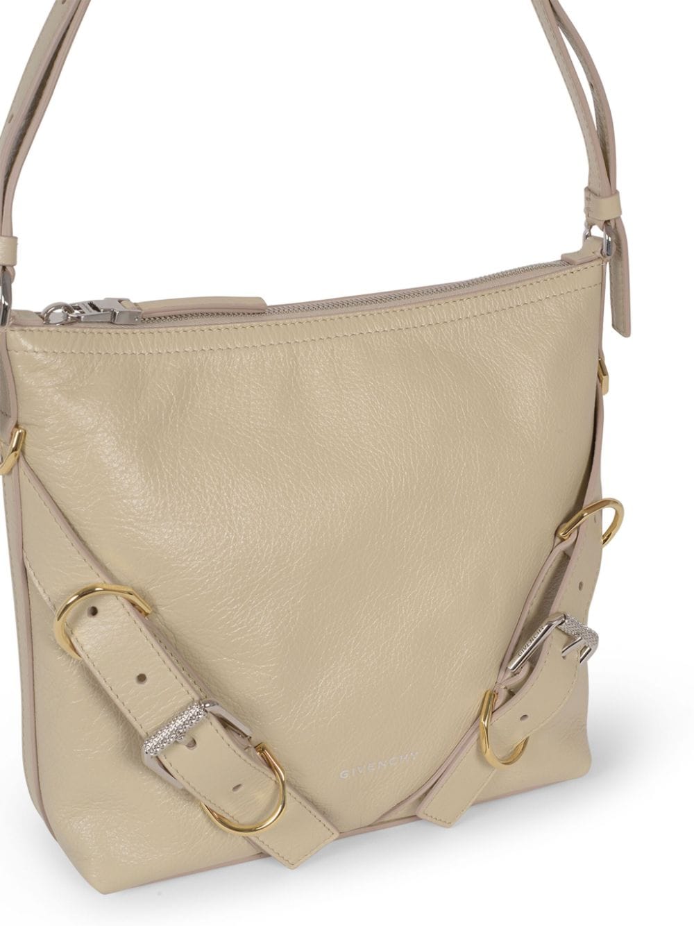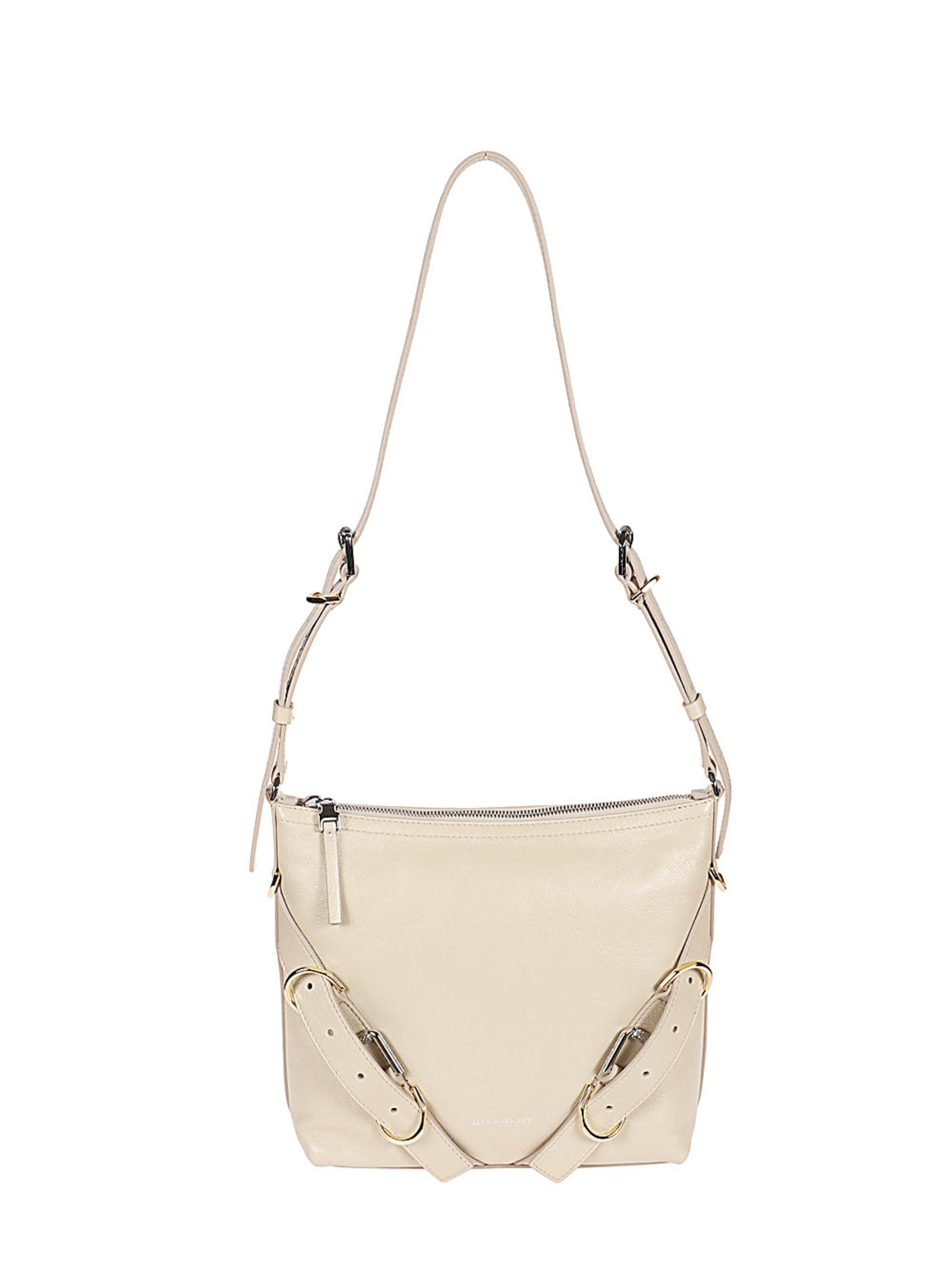 Borsa Voyou di GIVENCHY beige in pelle martellata con chiusura a zip, logo lettering frontale, fibbie metalliche con logo inciso, dettagli metallici oro e argento, tasca interna con zip e tracolla regolabile.