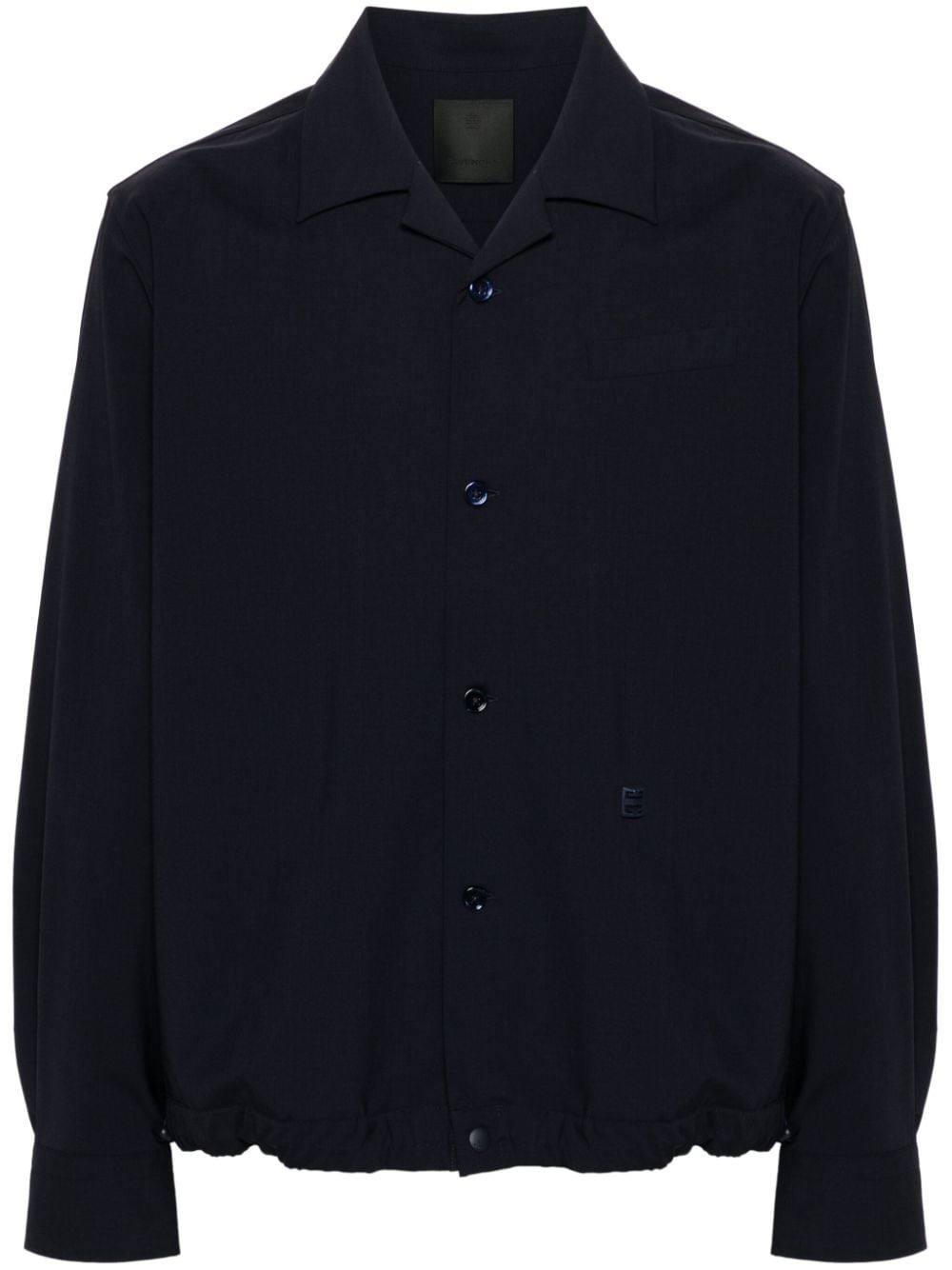 Camicia in lana di GIVENCHY blu notte con placca con logo, coletto alla cubana, orli con abbottonatura, orlo con coulisse, tasca a filetto sul petto e chiusura con bottoni.