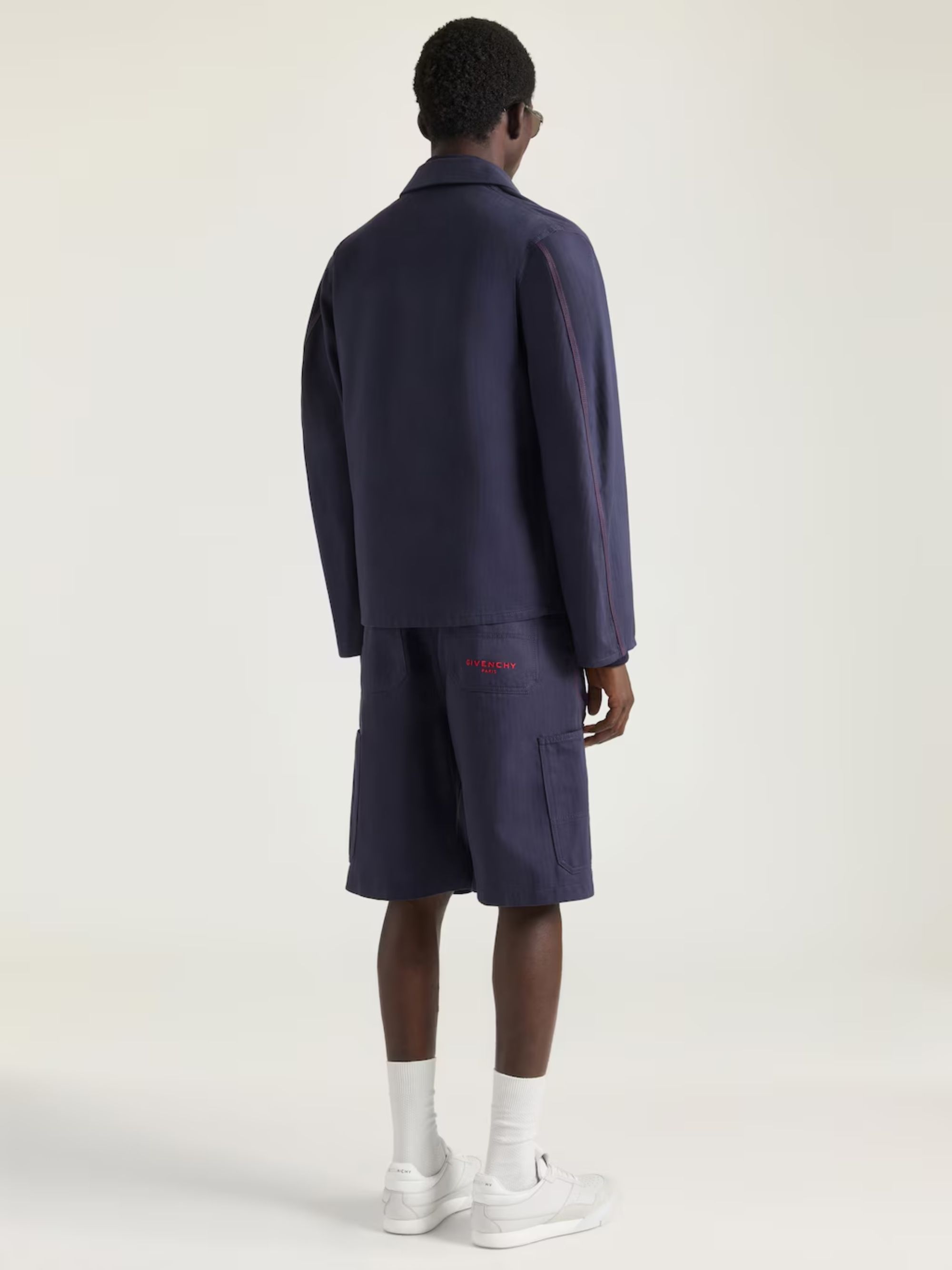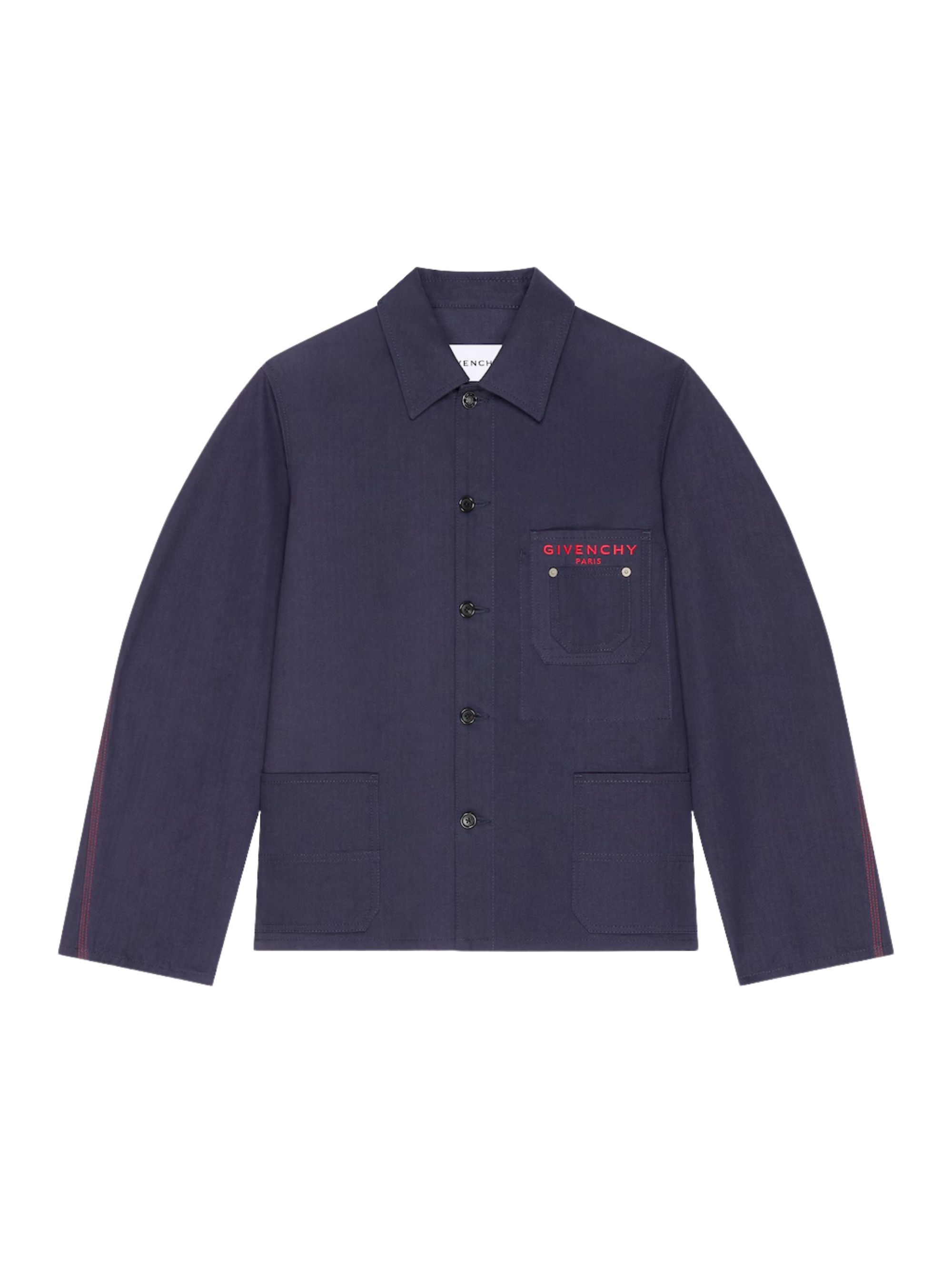 Giacca Couture Seam di GIVENCHY blu in denim, caratterizzata da collo classico, firma Givenchy Paris a contrasto sul petto, chiusura con bottoni, bottone argentato inciso Givenchy suylla parte superiore, due tasche anteriori e cuciture couture.