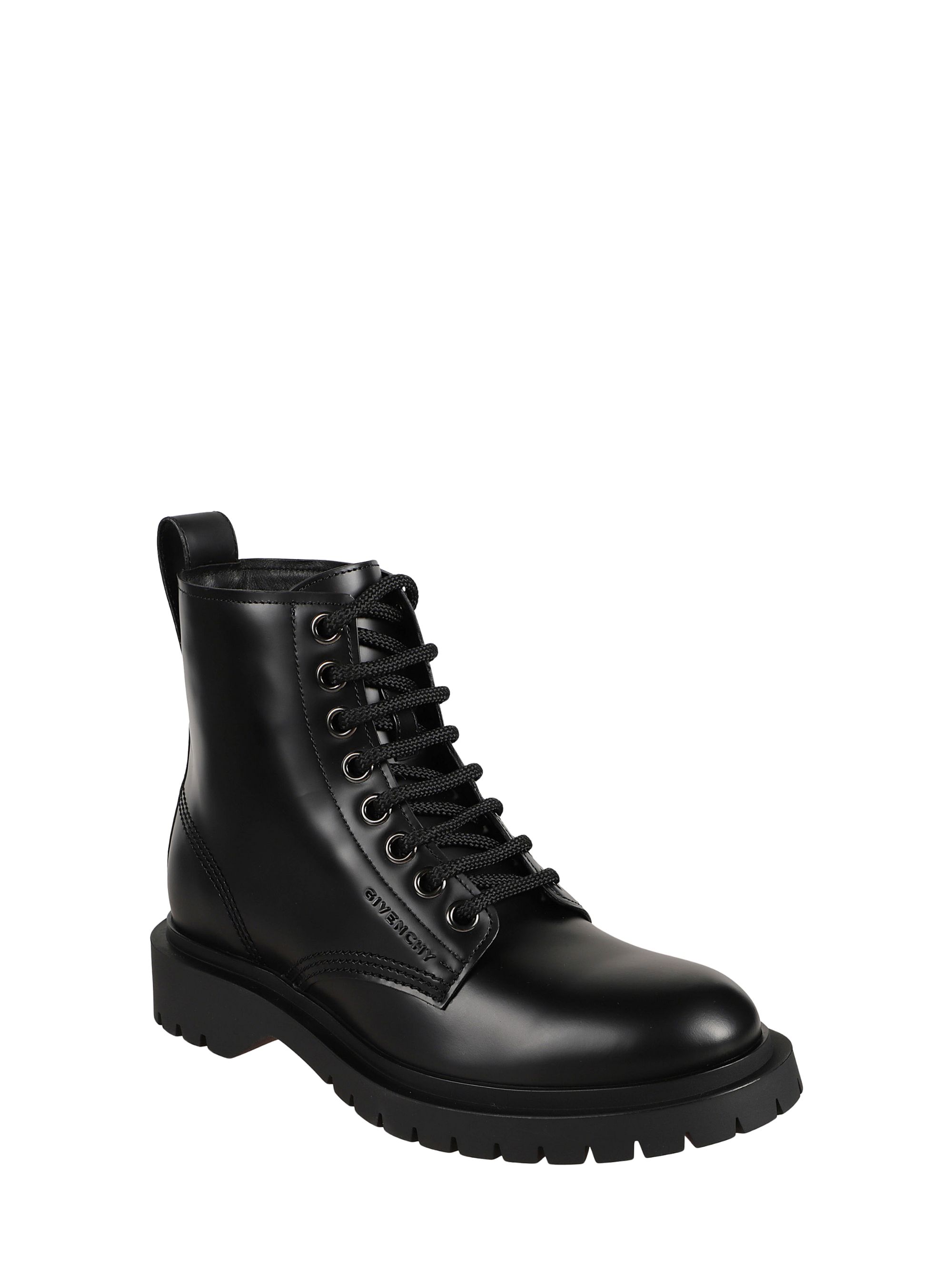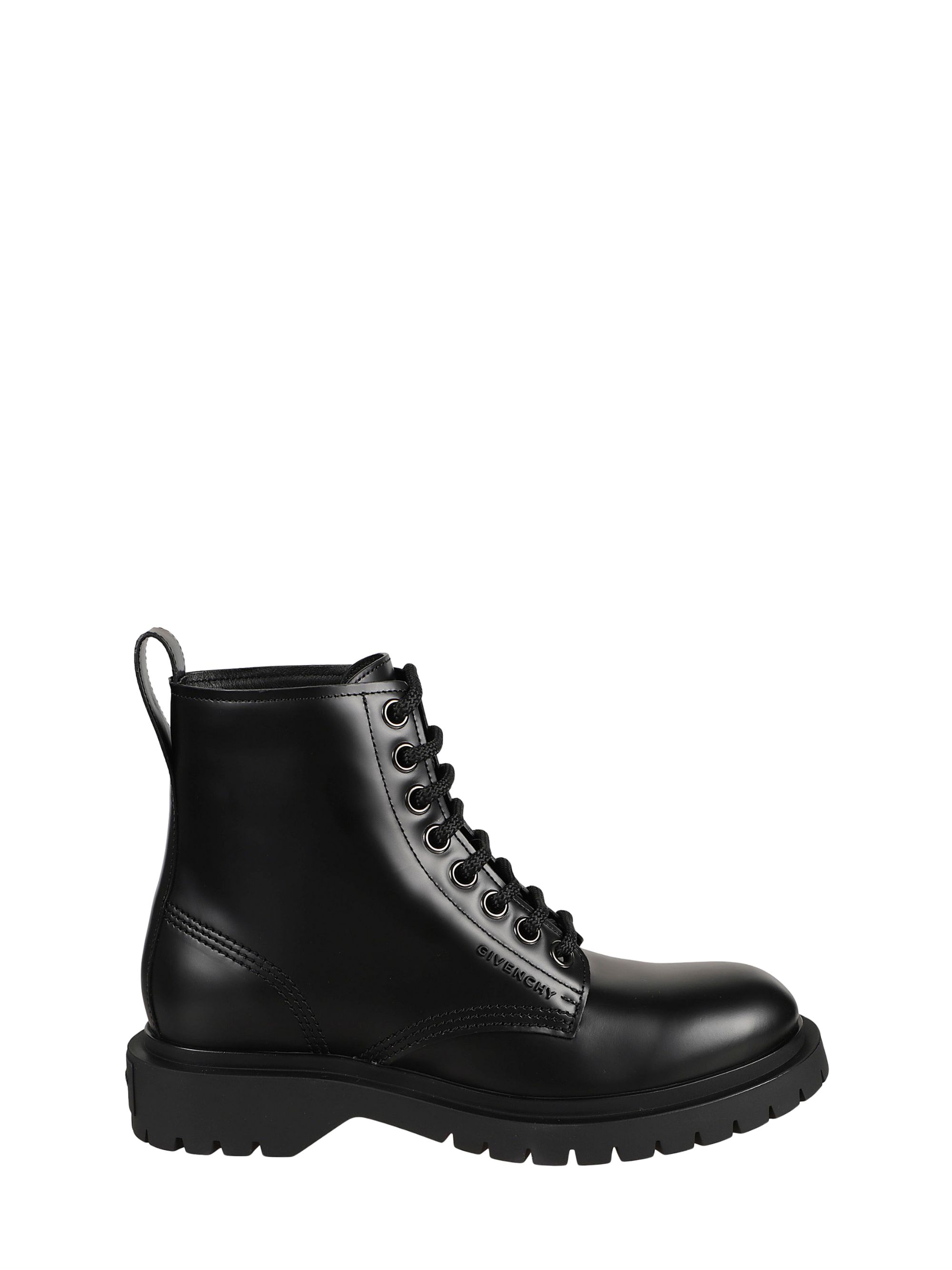 Stivaletto in pelle nera di GIVENCHY caratterizzato da punta tonda, logo laterale in rilievo e lacci.