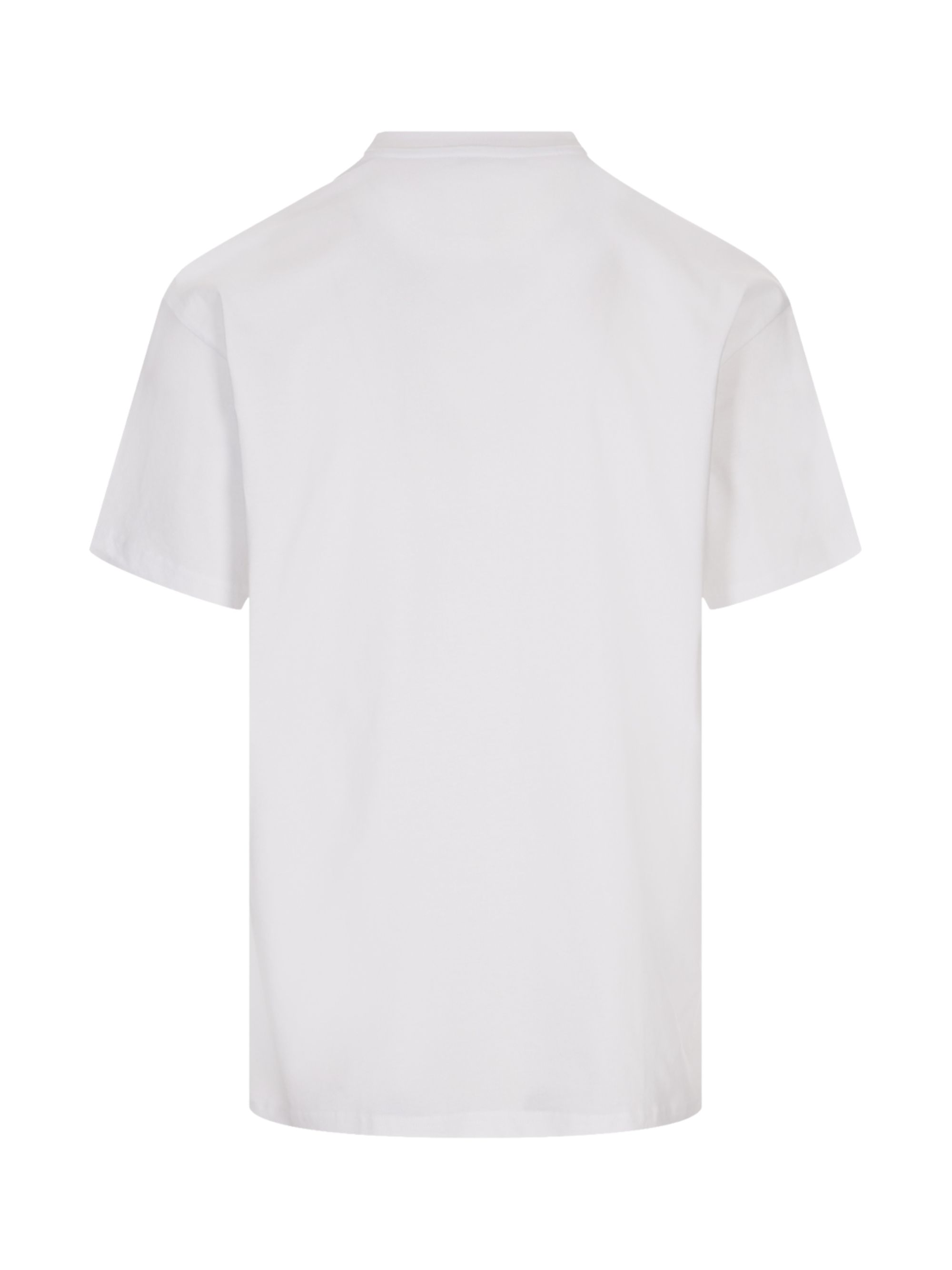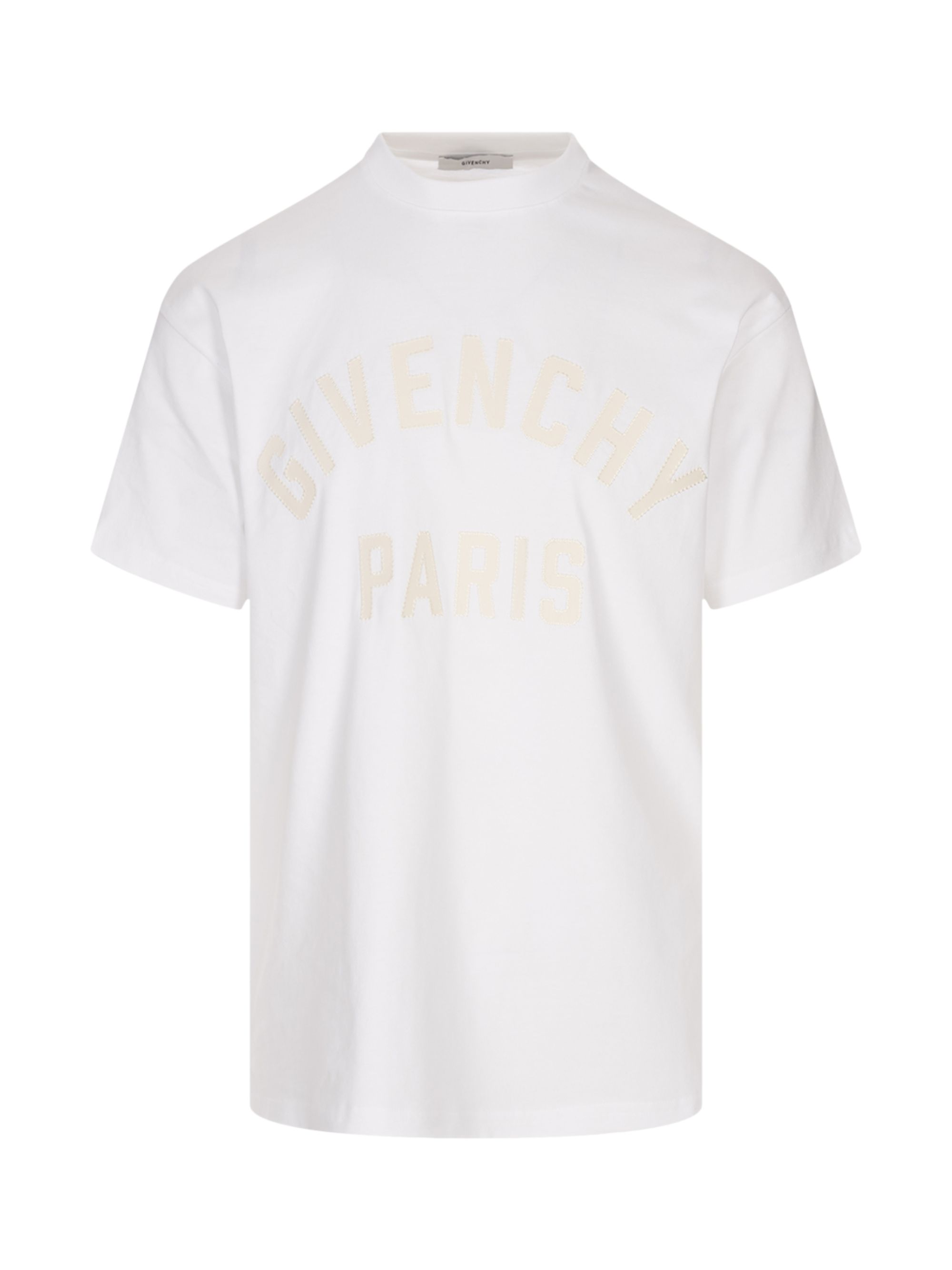 T-shirt con logo di GIVENCHY bianca in cotone, caratterizzata da taglio dritto, girocollo e applicazione Givenchy paris in gros-grain con cuciture a zig-zag ricamate sul davanti.