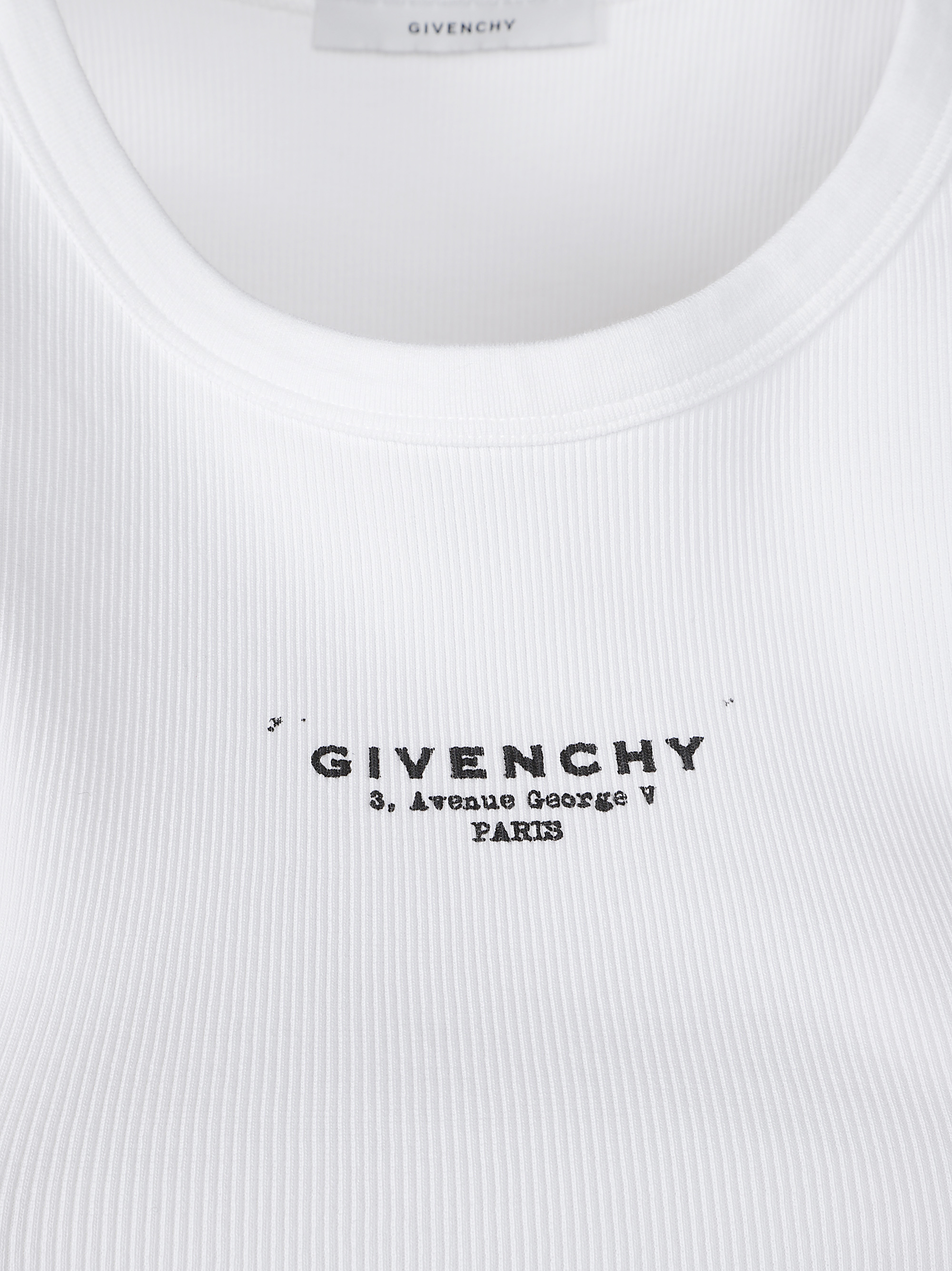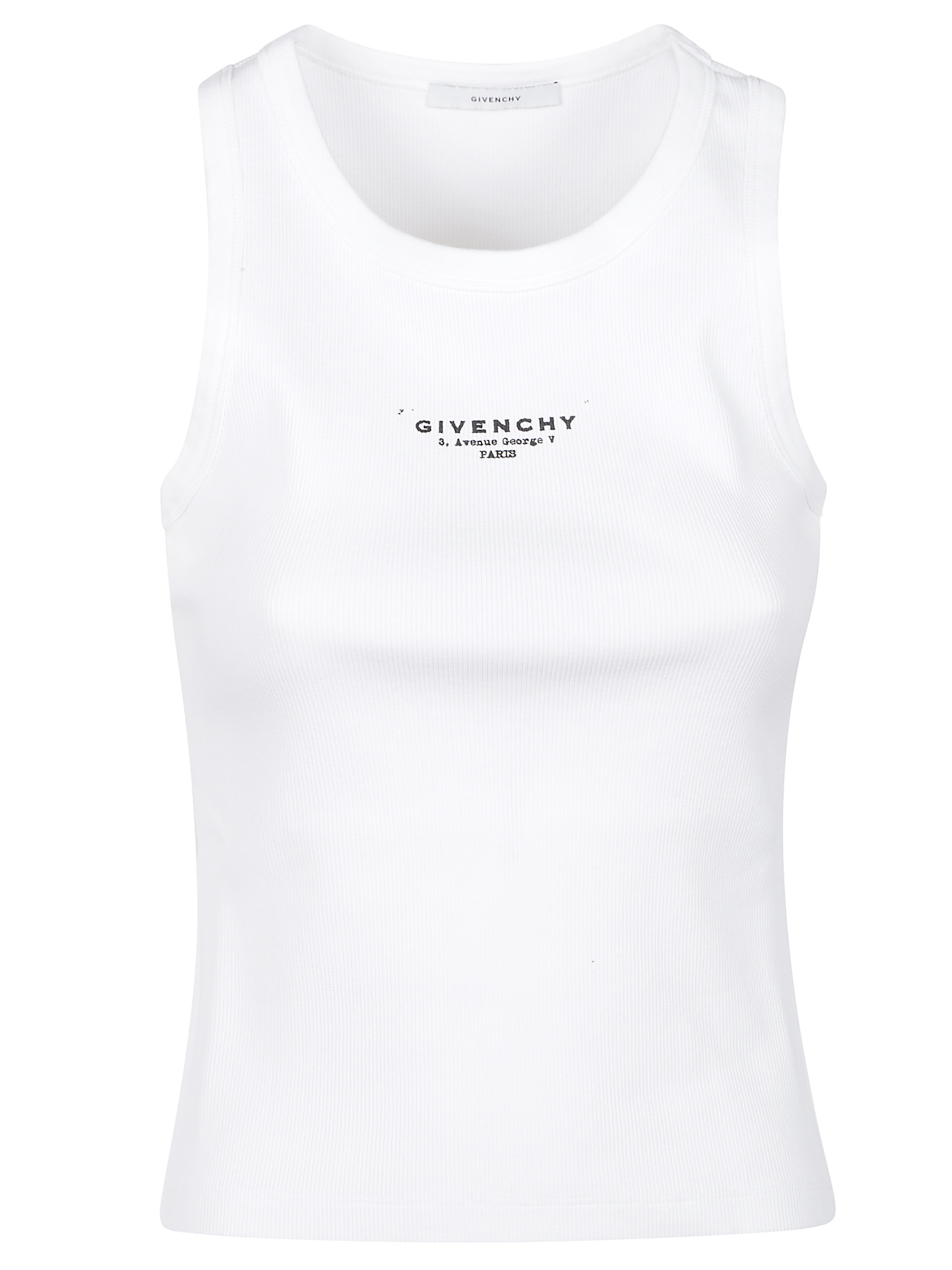 Top a coste di GIVENCHY bianca in cotone con trama a costine, scollo rotondo, senza maniche e stampa logo.