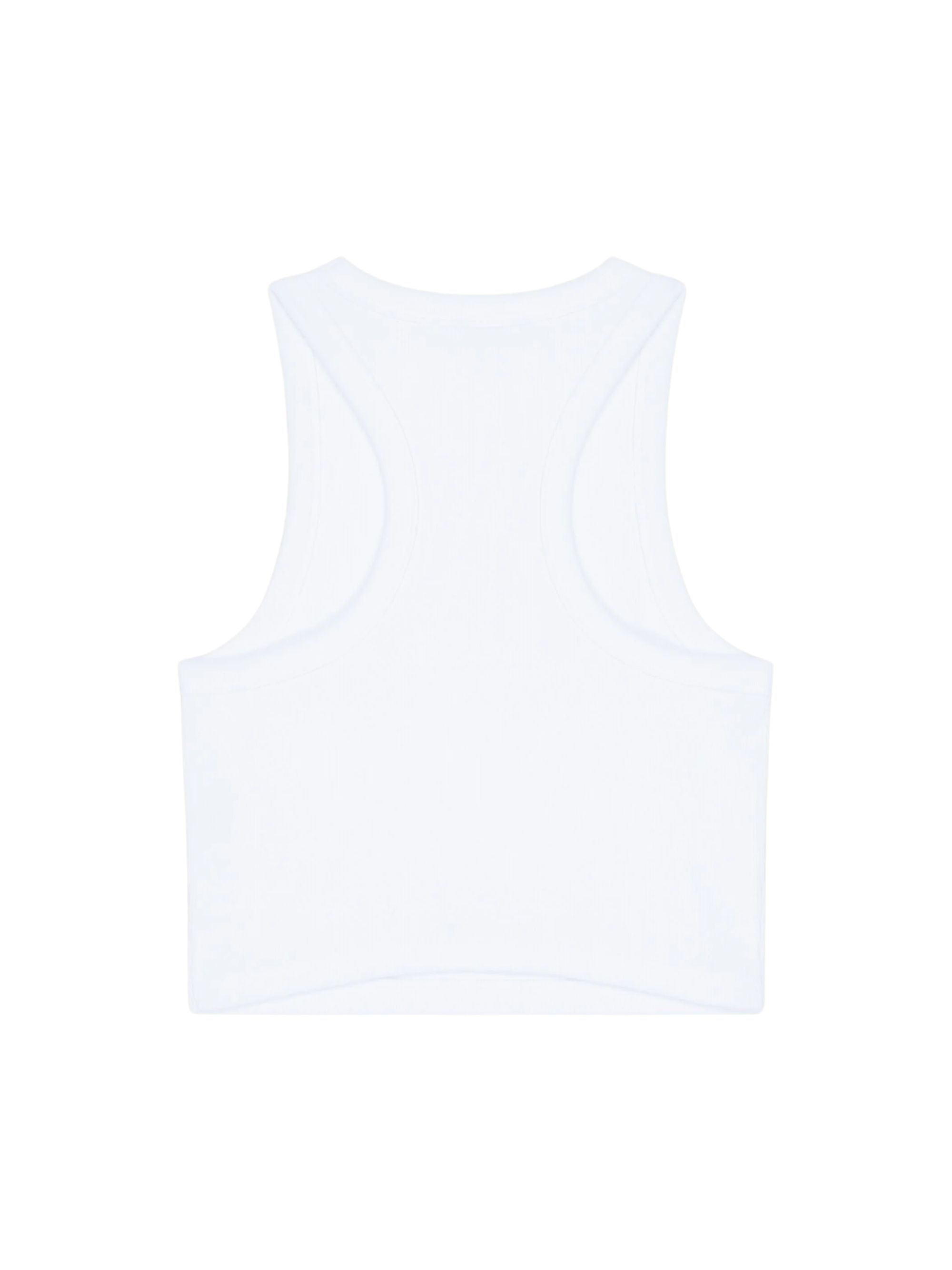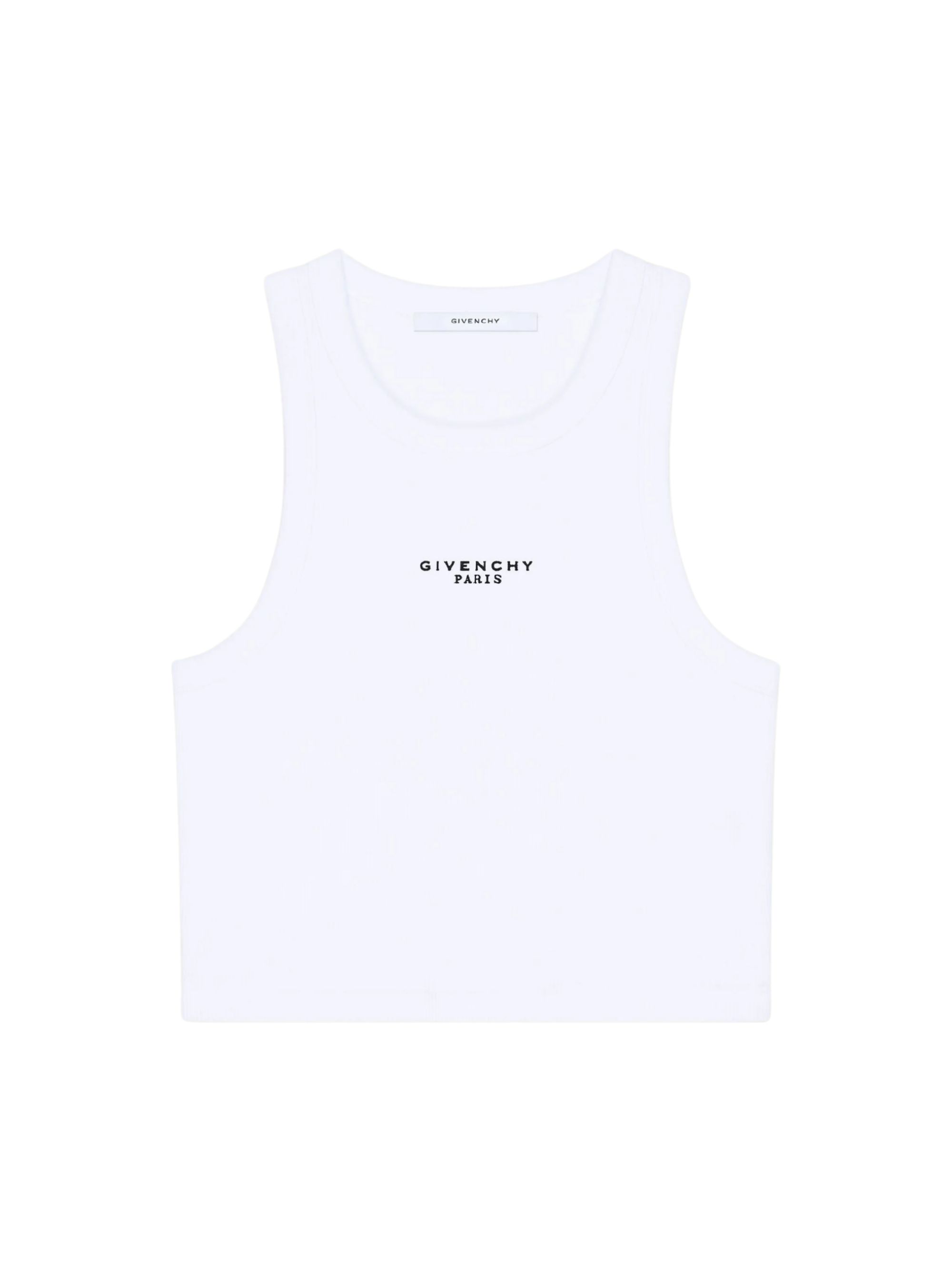 Top con logo di GIVENCHY bianco in cotone, caratterizzato da girocollo, fit crop e logo Givenchy Paris sul petto.
